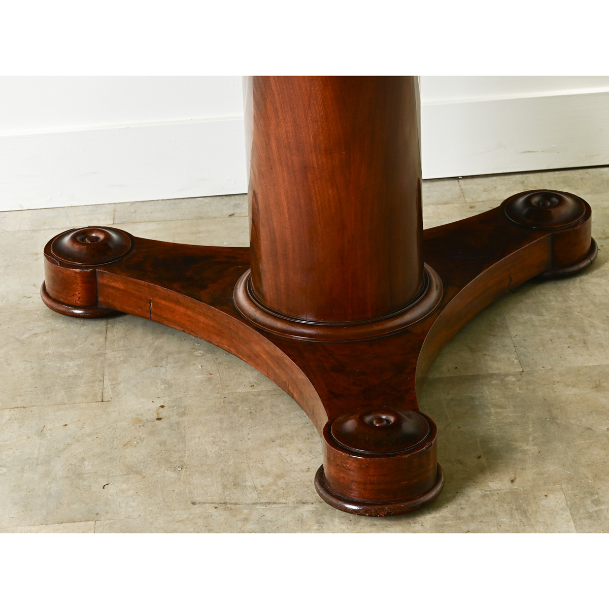 A large round center table from 1800’s France. The original marble top is worn and colorful over its refined mahogany base. A simple apron sits over a column form center pedestal over three concave splayed legs ending with rounded feet. Cleaned and polished with a French paste wax, this table is ready for your immediate use. Be sure to view the detailed images to see the current condition.