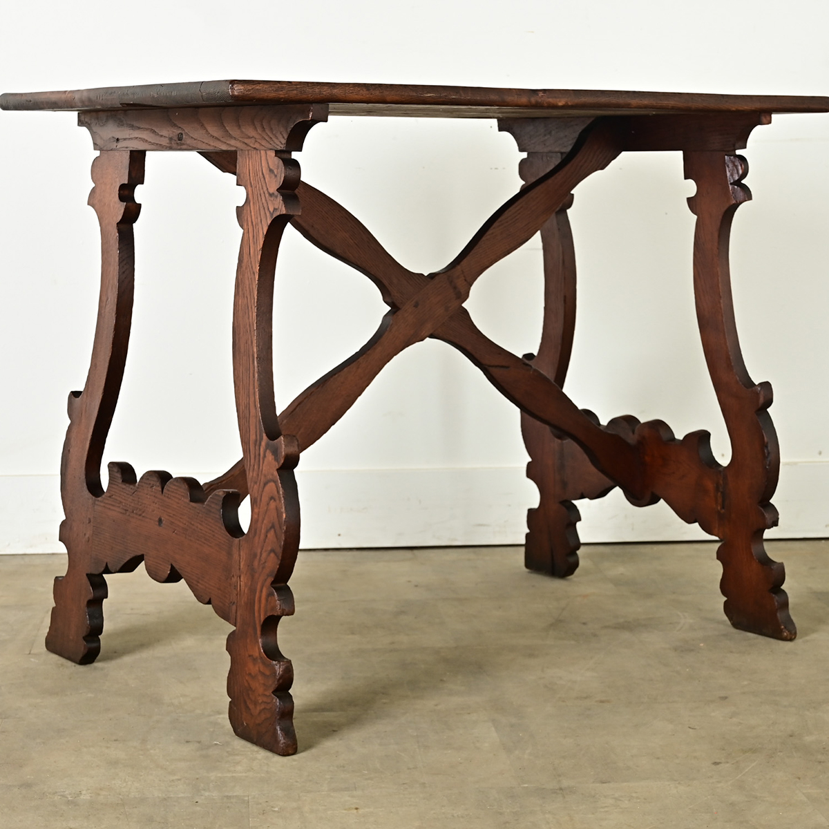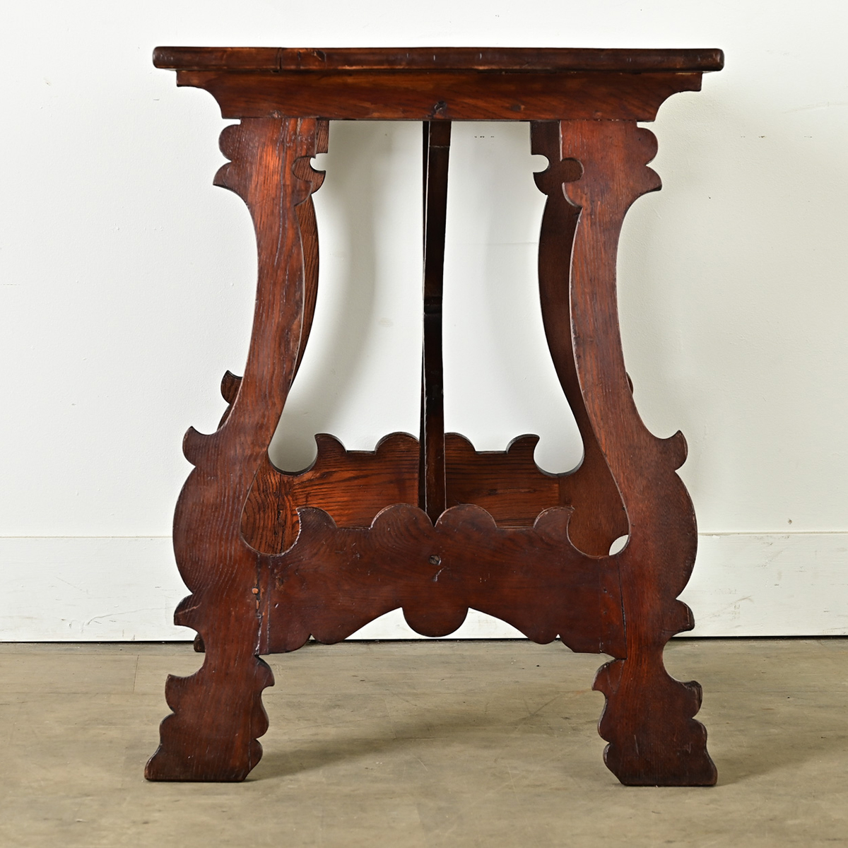 Made in France, circa 1890, this table takes inspiration from the Spanish Fratino, a style of refectory table. It features a rectangular top with exciting texture and grain pattern, patinated to a dark coffee tone. Improvised repairs in the form of square pegs dot the table surface, which only adds to the character. Lyre-shaped supports are carved with the signature Arabesque curls and peaks along the edges. The four branches of the stretcher connect the top to the support legs in graceful cross formation. As an unusual size, this sturdy table can be used as a console, or desk, as well as a small dining table. Cleaned and polished with a French paste wax to reveal every historic detail. Please view the detailed images.