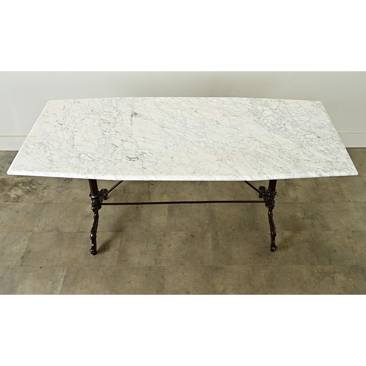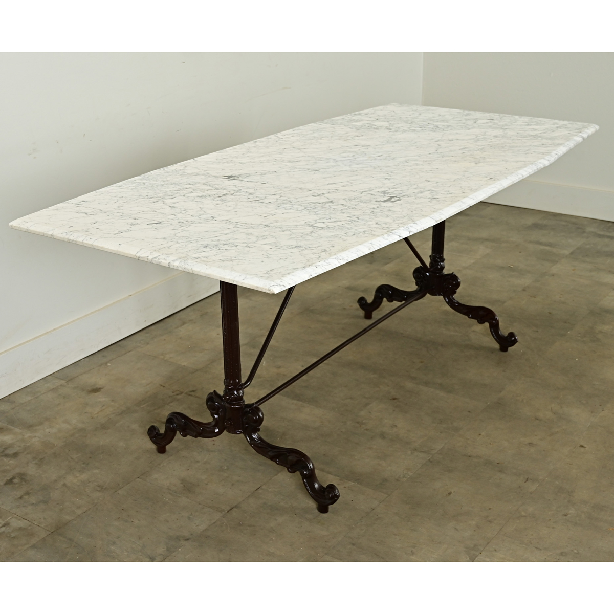 A stunning French 19th century cast iron & marble garden dining table, perfect for entertaining or everyday use–inside and out. The white marble top is a unique polygonal shape–an elongated octagon with three facets on each long side–cut with a beveled edge on the perimeter. The stone’s geometry stands in contrast to the poetry in the Neoclassical base: brackets supporting the marble take the form of acanthus, incorporating the spirals of volutes where they connect to the fluted column. Each delicate foot reflects the scrolling lines of the brackets above, lifted off the floor by small cylinders. Recently updated with sandblasting and new powdercoated finish in an oil-rubbed-bronze color, this table transcends interior design labels and trends to be a fine addition to any terrace, garden or patio, as well as interior dining spaces. Please view the detailed images.