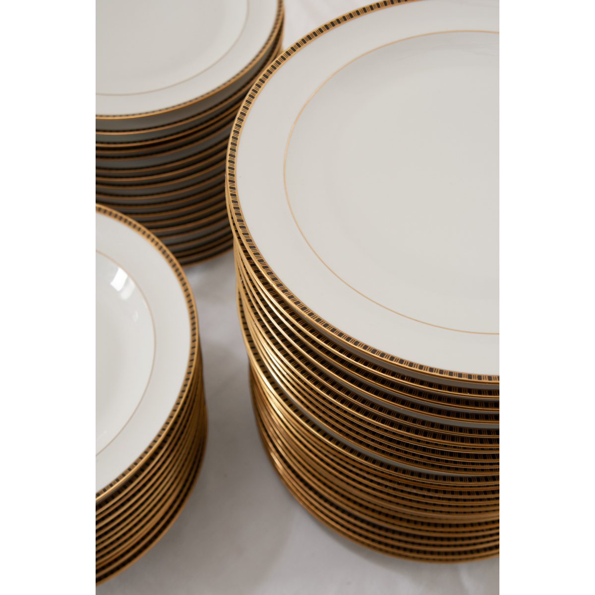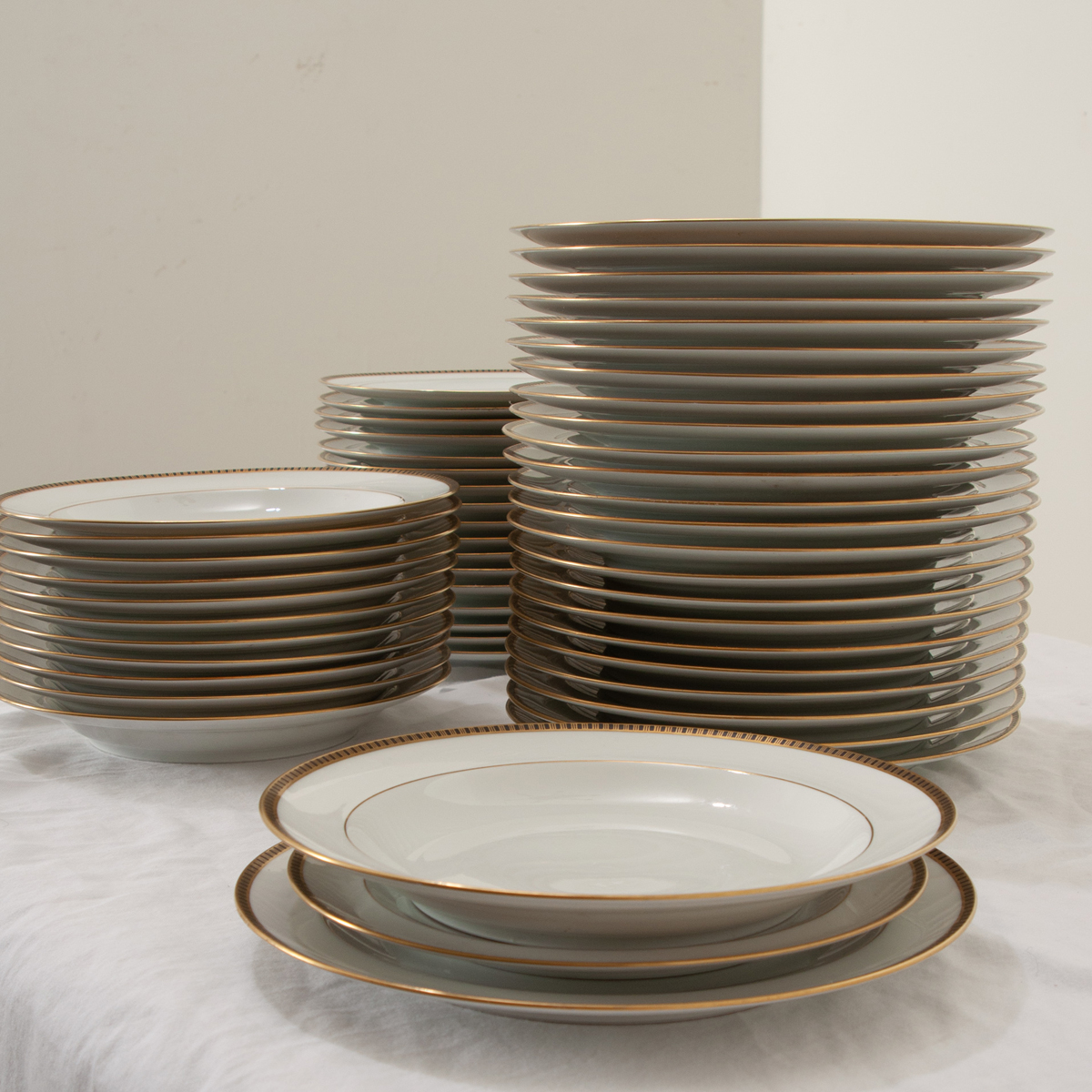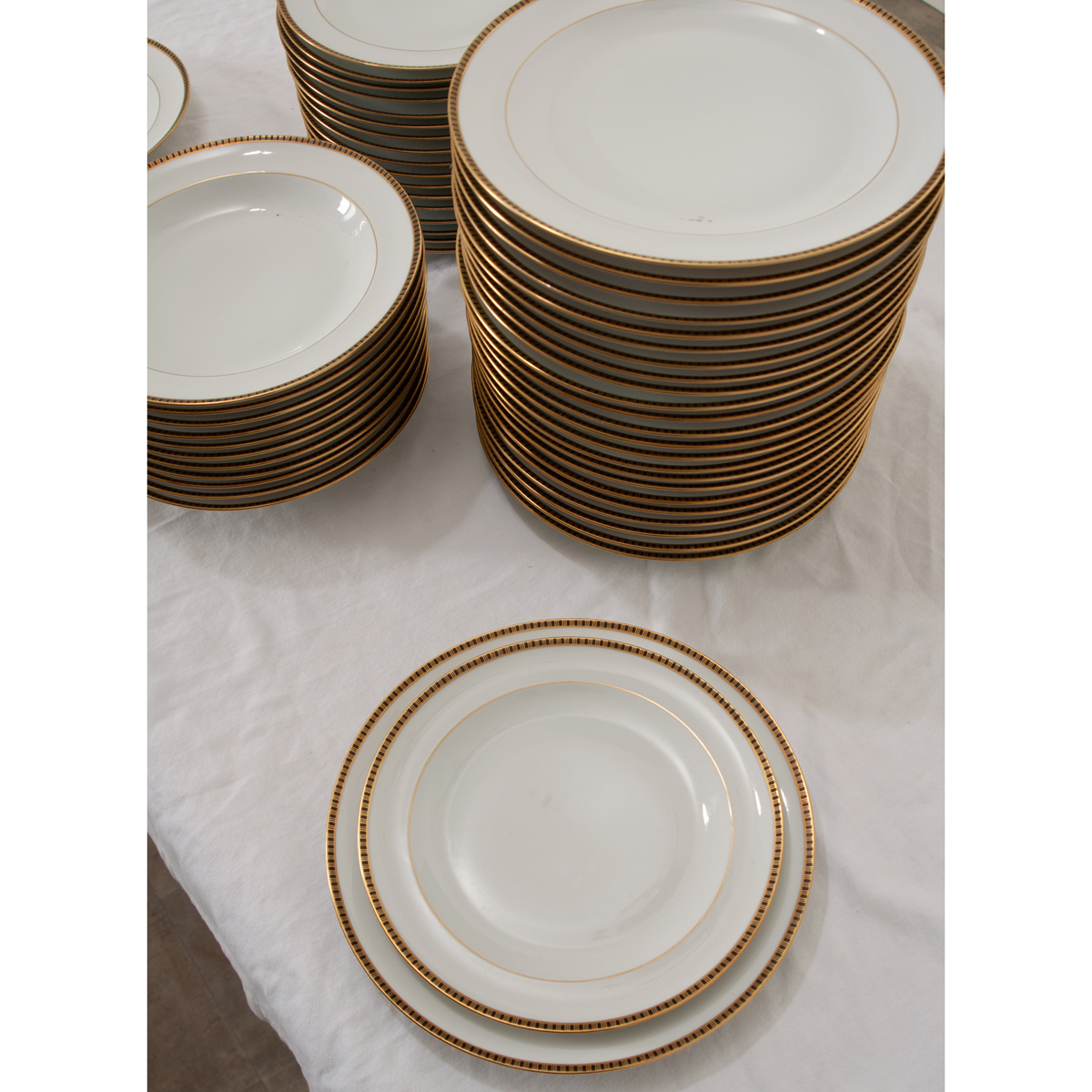 A set of 54 pieces in an elegant Limoges porcelain dinner service with a French white finish accented by black and gold gilt Neoclassical patterned trim. Created in France during the 20th century, each piece in this set of porcelain plates and bowls is of excellent condition. Included are 24 dinner plates, 12 soup bowls, and 18 smaller or salad plates. With their gold gilt luster and lovely décor, this set of Limoges porcelain plates and bowls will bring their refined taste to any dining room! Be sure to view all the images to see the details. Sold as a set only.