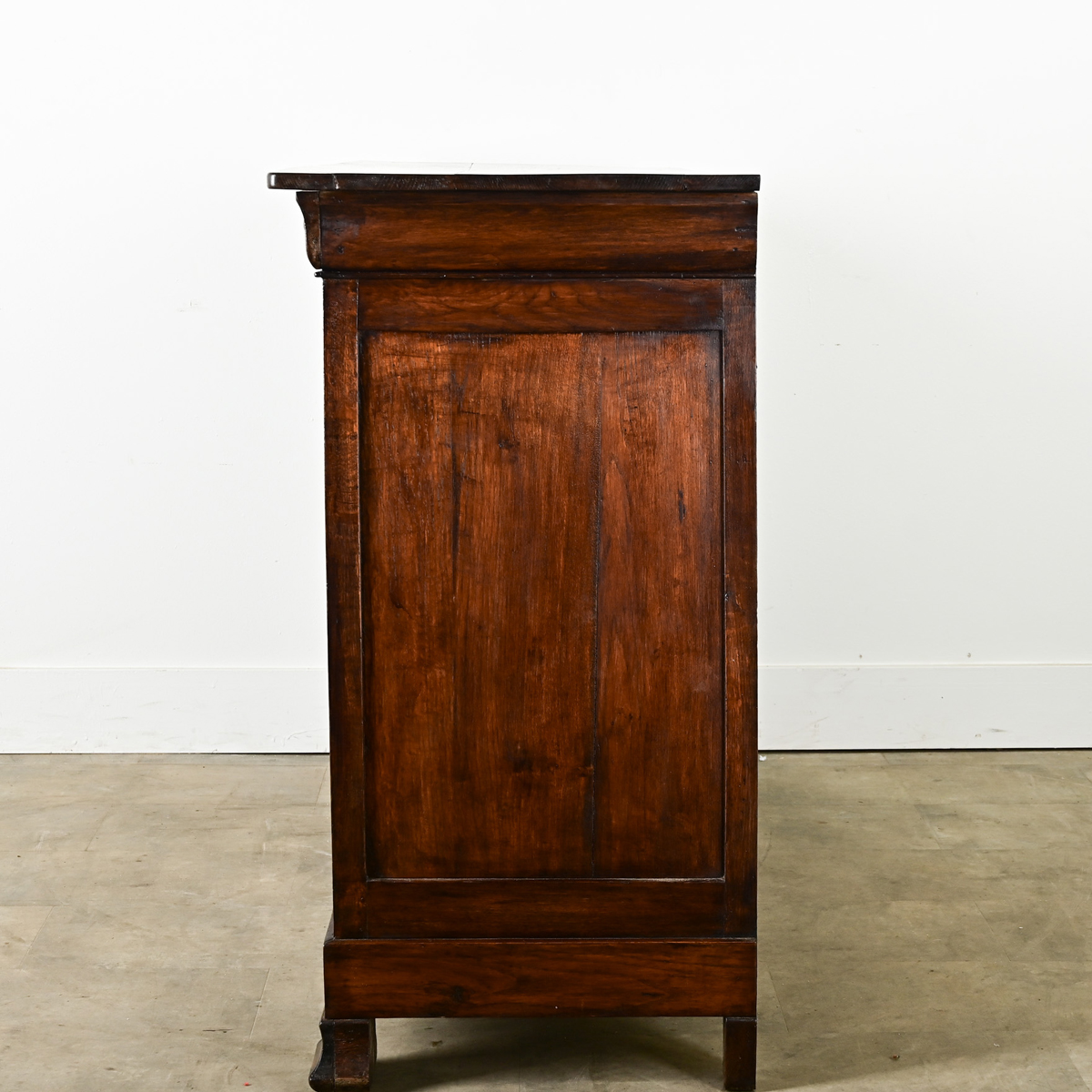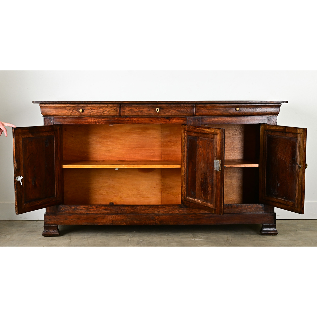 A gorgeous enfilade from 19th century France, Louis Philippe period, in solid walnut. The top surface is simply constructed of two parallel planks, quite thick, held in place by tongue & groove joinery visible from the sides. Within the frieze sit two drawers using iron drop handles mounted on pierced backplates; the right drawer has been divided into two sections and is more patinated with the remains of a blue-green paint. Below the drawers are three paneled doors representing two cabinets: the (locking) left door is one compartment, whereas the center door and right door share a lock to enclose the wider of the compartments. One key included to share between the two locks. The right-side shelf is 18 ¼” deep and the left side is 15 ⅝” deep. Posts on the corners become the feet, leaving a short gap between the bottom trim and the floor. Cleaned and polished with a French paste wax to preserve all the historic character, this antique enfilade is ready for its next home. Please view the detailed images to see the condition.