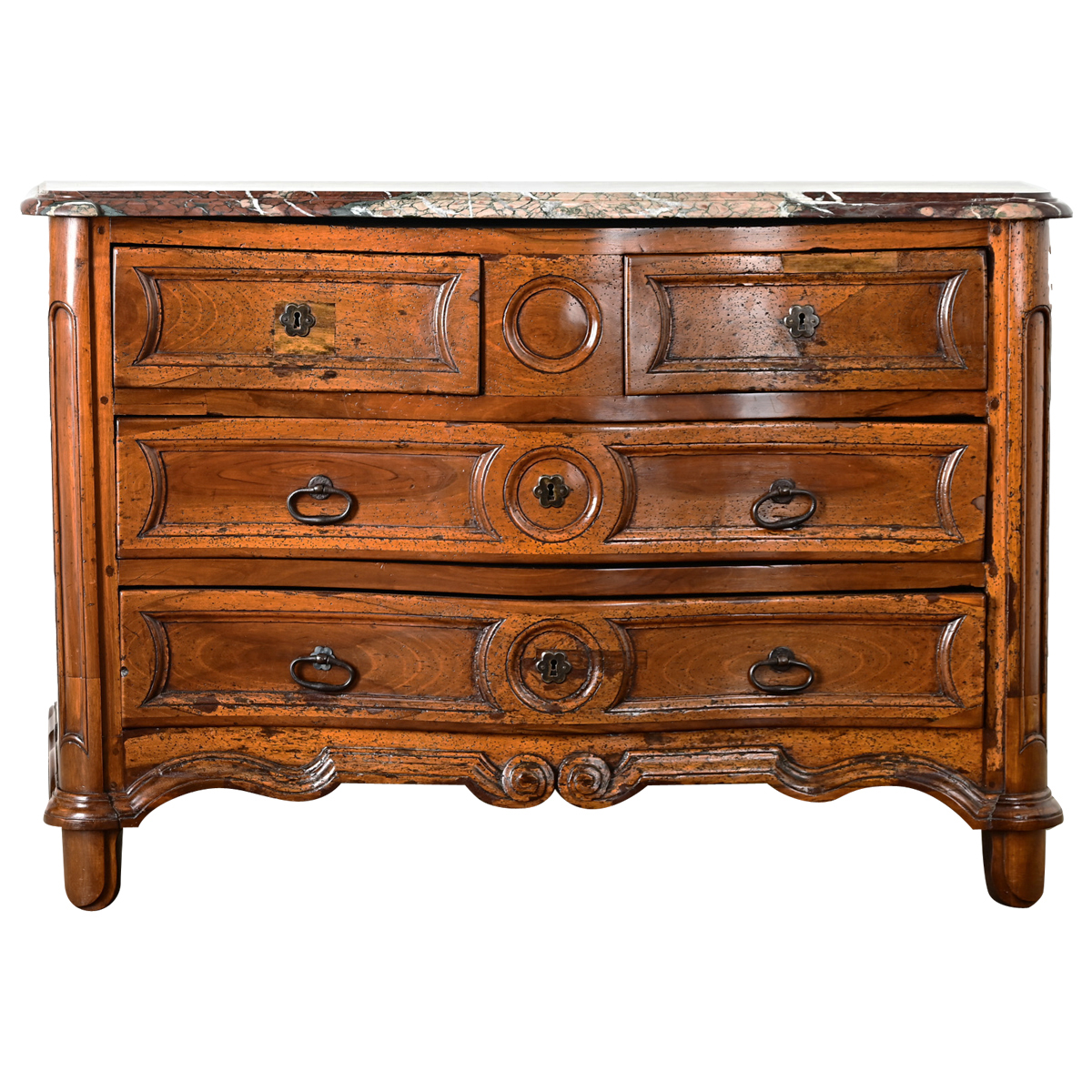 A spellbinding Louis XV period walnut commode, late 18th century, from the Pyrenees region of France. A fantastic Campan Melange marble top with a molded edge, shaped in the same bowed effect as the body, is streaked with ribbons of veining of ruby-red, green, ivory, and blush undertones. The substantial walnut case of four drawers features impressive carvings to define the drawer fronts down to the unique scrolling pattern on the apron, punctuated with spherical panels down the middle and iron ring pulls forged by hand (note the escutcheons are purely decorative now, no key is present). Patina in the wood as expected from time and use, recently cleaned and polished with a French paste wax to preserve every aspect of this exceptional commode. Make sure to view the detailed images for a closer look and current condition.