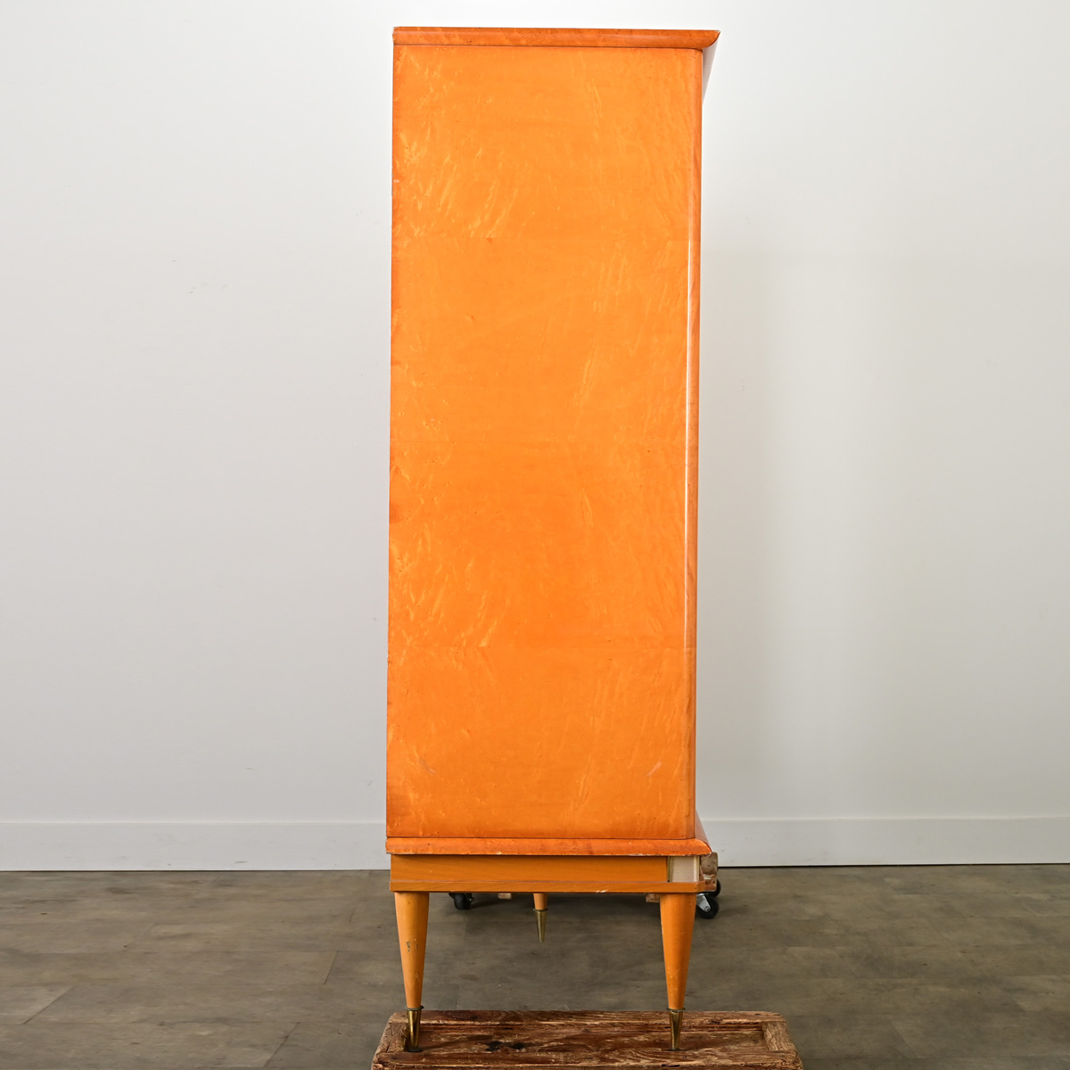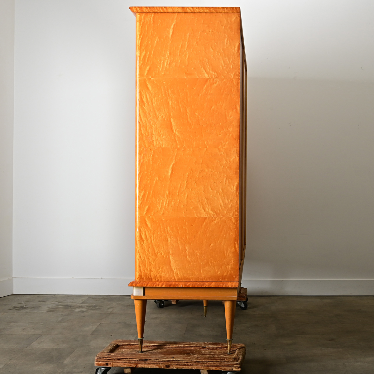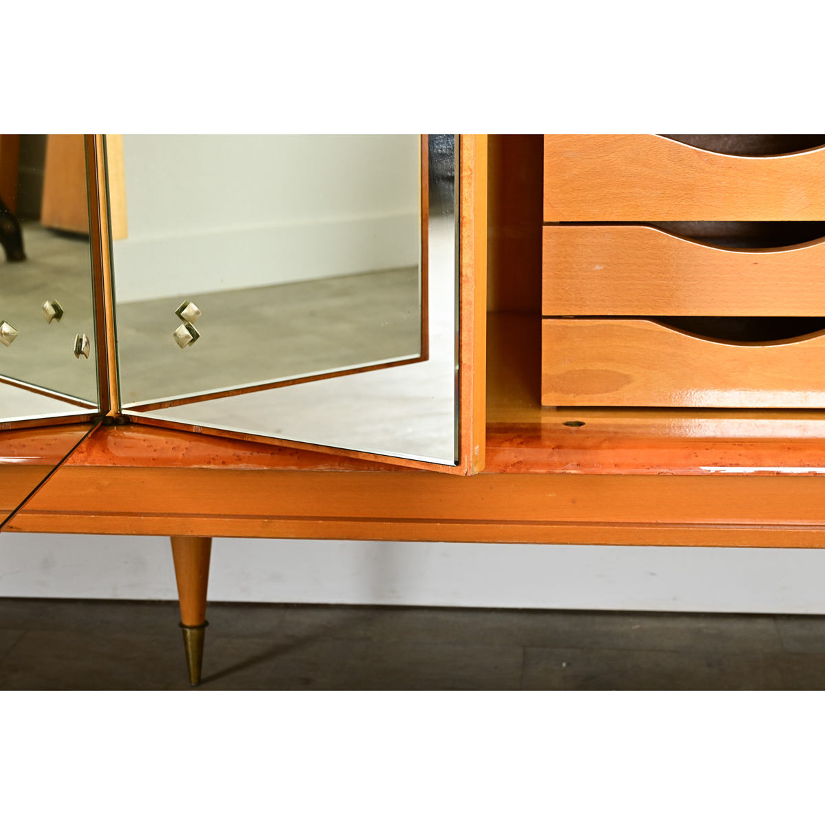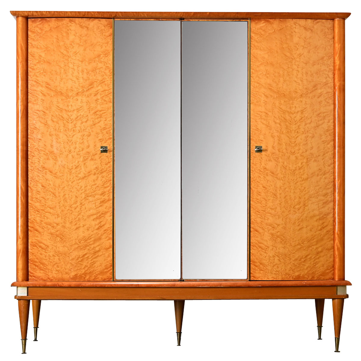 A large dressing armoire produced in France in the 1950s to 1960s, granted an “Ameublement N.F.” label found inside the far right door. This sleek midcentury modern cabinet would work well in a bedroom or serve as a bar, dazzling your guests with the honey-gold wood grain of maple under a glossy finish. The two pairs of doors retain their original mirror plates matched in the center of the case, with slightly bowed panels of wood on the outer left and right. This case piece is modern and stylish with ample storage space. The interior has three fixed shelves on each side, and the right cabinet is also fitted with drawers. There are two working locks each with their own key. Conical legs taper down to sharp points at the floor to give a sense of lightness compared to the generous scale. Note that there are a couple areas of loss on the lower trim, among other signs of daily use left upon the wood. Be sure to view the detailed images to see the current condition of this wonderful vintage cabinet.