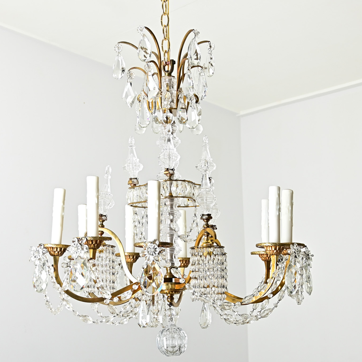 A showstopping mid-20th century French brass and crystal chandelier with twelve light sources to illuminate your dining room, foyer, or other grand space . This Maison Baguès style chandelier has a brass frame that is dripping with many varieties and techniques of pendalogues, drops, spikes, and rosettes in transparent crystal suspended from each tier. Nine faux candles rise from cast brass bobeche like torches, using candelabra-base bulbs to softly illuminate the facets of the surrounding crystals whether suspended or strung on chains. Three additional light sources (downlighting) are hidden behind the curtain of crystal chains below the spikes. Note that this fixture has been professionally cleaned and rewired for US electrical using UL-listed parts and is ready to be hung in your interior. Be sure to view the detailed images to see more.