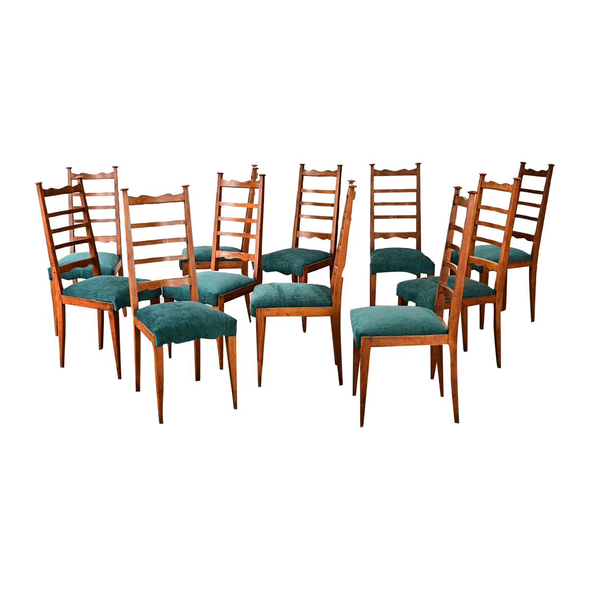 A very unusual set of eleven (11) mid-20th century French dining chairs that give a little spin on the classic ladderback style by applying some creative proportions and carving techniques to the fruitwood frames. Tall and angular in profile, chair stiles are capped with knob-like finials above three rungs of splats and shaped toprail mirroring the curves of the lower splat. Narrow, removable seats with a scalloped front edge have been reupholstered in a velvety fabric of peacock blue-green; ready for your interior. Please view the detailed images to see more. Sold as a set of eleven.