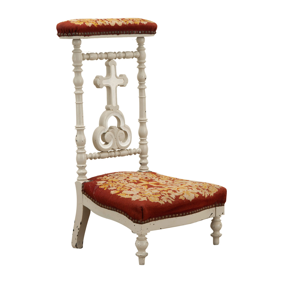A French prie dieu upholstered in colorful needlepoint. This painted prie dieu has a shaped back with a cross and turned spindle designs. The top has a needlepoint upholstery allowing for comfortable arm placement during prayer or reflection and a coordinating needlepoint upholstery on the kneeler. Be sure to view the detailed images to see the current condition of this antique. Kneeling height: 9” at the front, 11” at the back