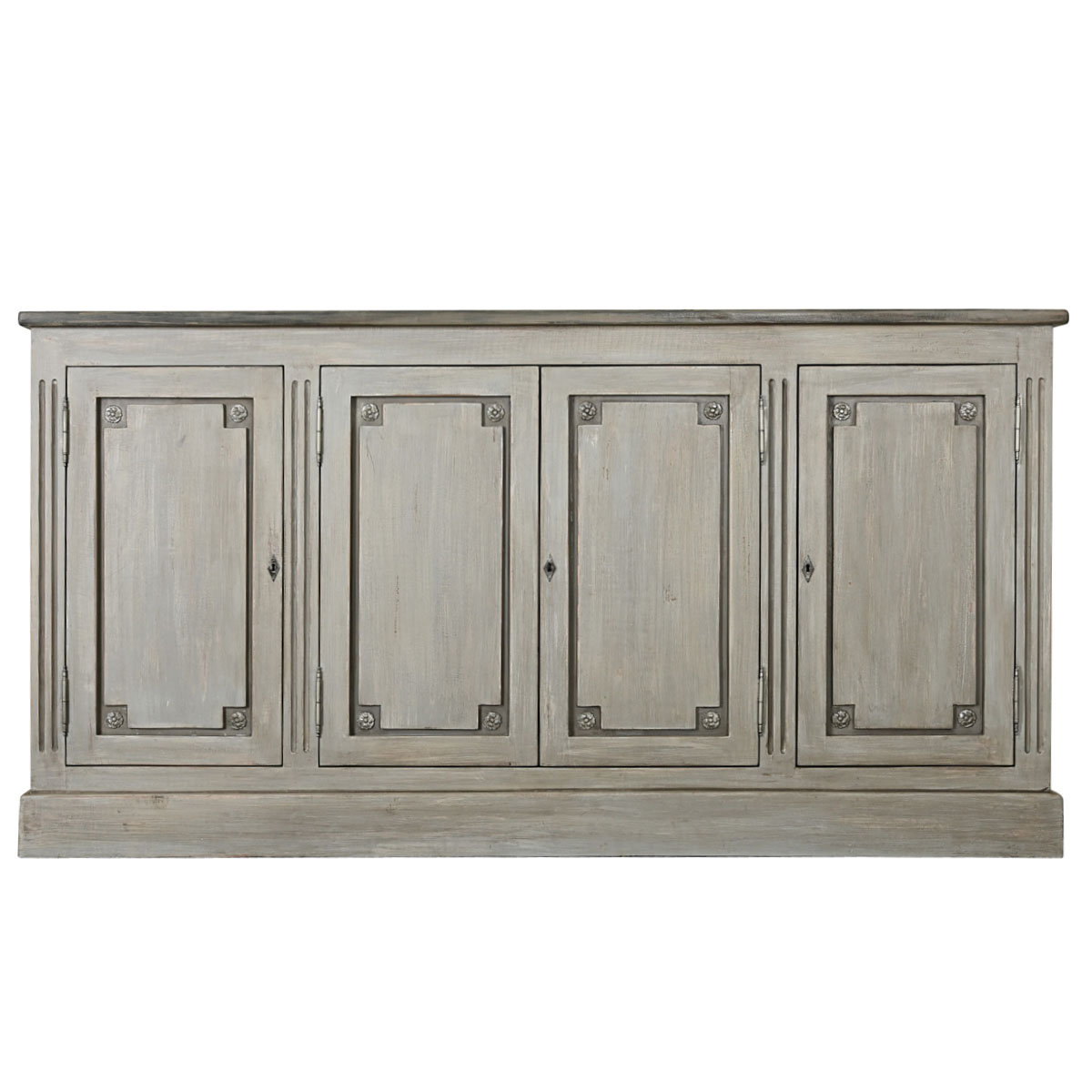 A reproduction Louis XVI style French gray painted enfilade, in an ethereal patinated texture. Four paneled doors are accented with rosettes in each corner, softening the linear proportions of the cabinet. Three locks share a key between them. The interior is also painted, featuring an adjustable shelf on sawtooth brackets, 17” deep. Please note that the back panel has been drilled with a hole for cable management, view the detailed images for a closer look.