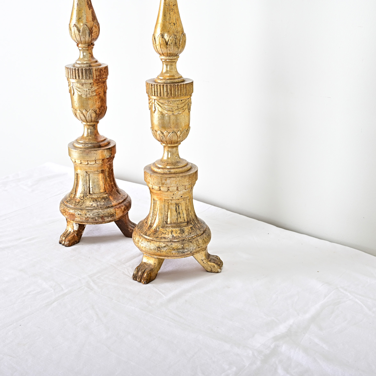 A stunning pair of French, 18th century giltwood candlesticks from a church or cathedral. These substantial “pricket” candlesticks will make a statement on any mantel or table: tall, slender forms on tripod bases are mounted with their original wrought iron spikes and their baluster forms are decorated with Classical (and subtle Louis XVI) patterns like stylized leaves, fluting, and festooned motifs highlighted by the rich gold leaf finish of soft patina. Note that they are not entirely gilded to save resources as the pair would have been against the altar and not seen in the round, so one vertical strip on the backside appears more of a burnt sienna than gold. Please view the detailed images to see more of these amazing candlesticks. Sold as a pair.