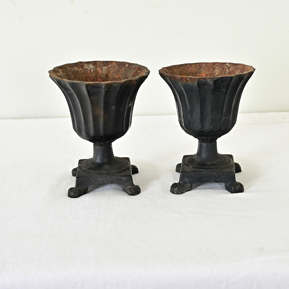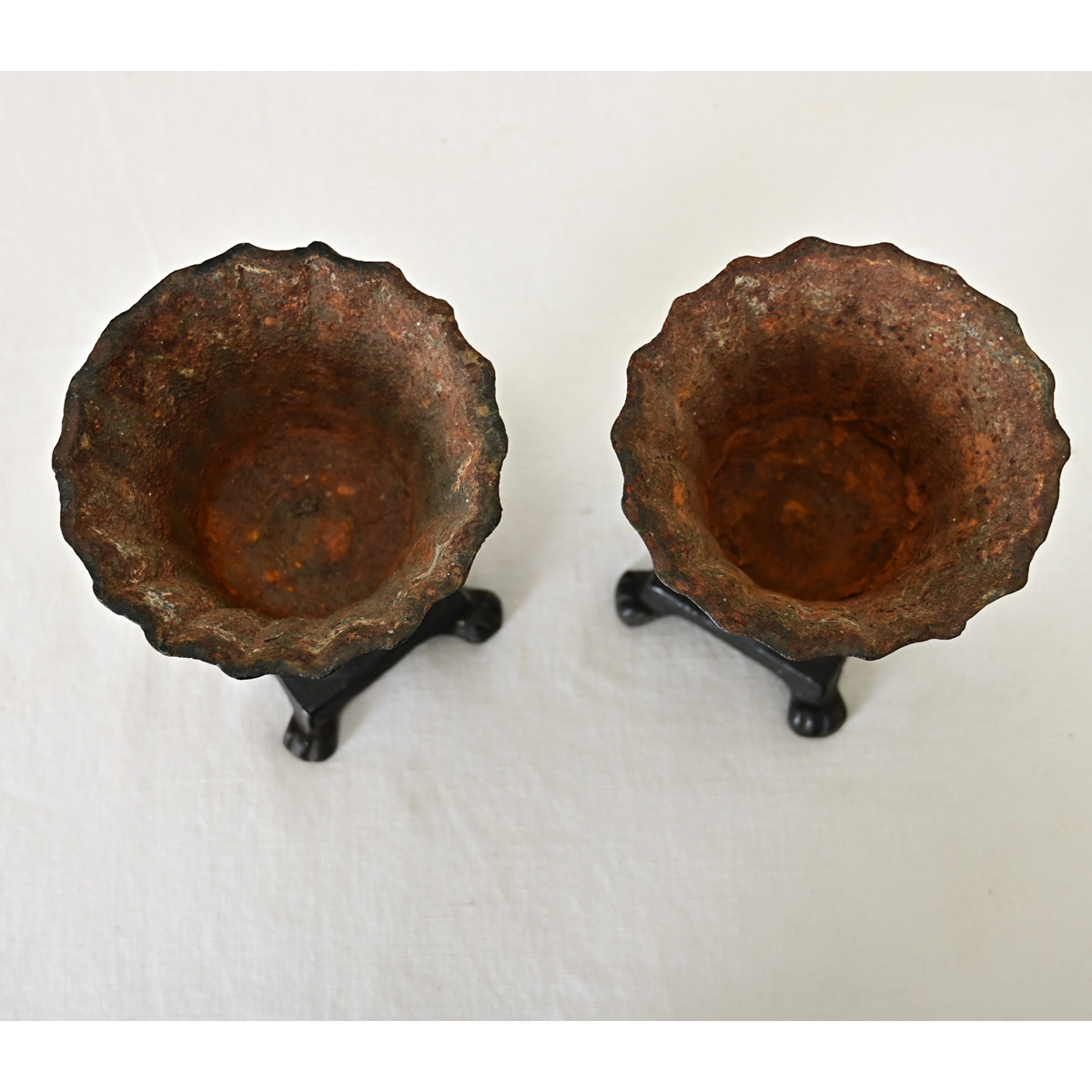Petite pair of French vintage (20th century) cast iron urns or cachepots. They are an ideal scale to fit into any space: a bookshelf, tabletop, buffet, or mixed into a collection. More substantial than they look, heavy cast iron material with a dark bronze patina is indoor-outdoor friendly to grace your patio table too. The short vessels feature an elegant scalloped edge with fluted walls, resting on a footed pedestal base hinting at Neoclassical style. Please view the detailed images to see the current condition. Sold as a pair.