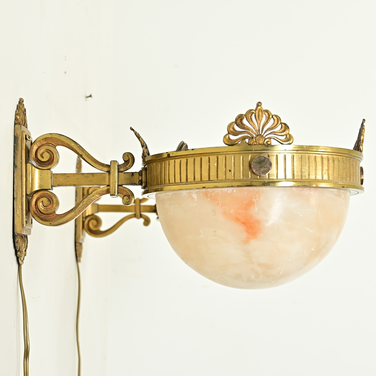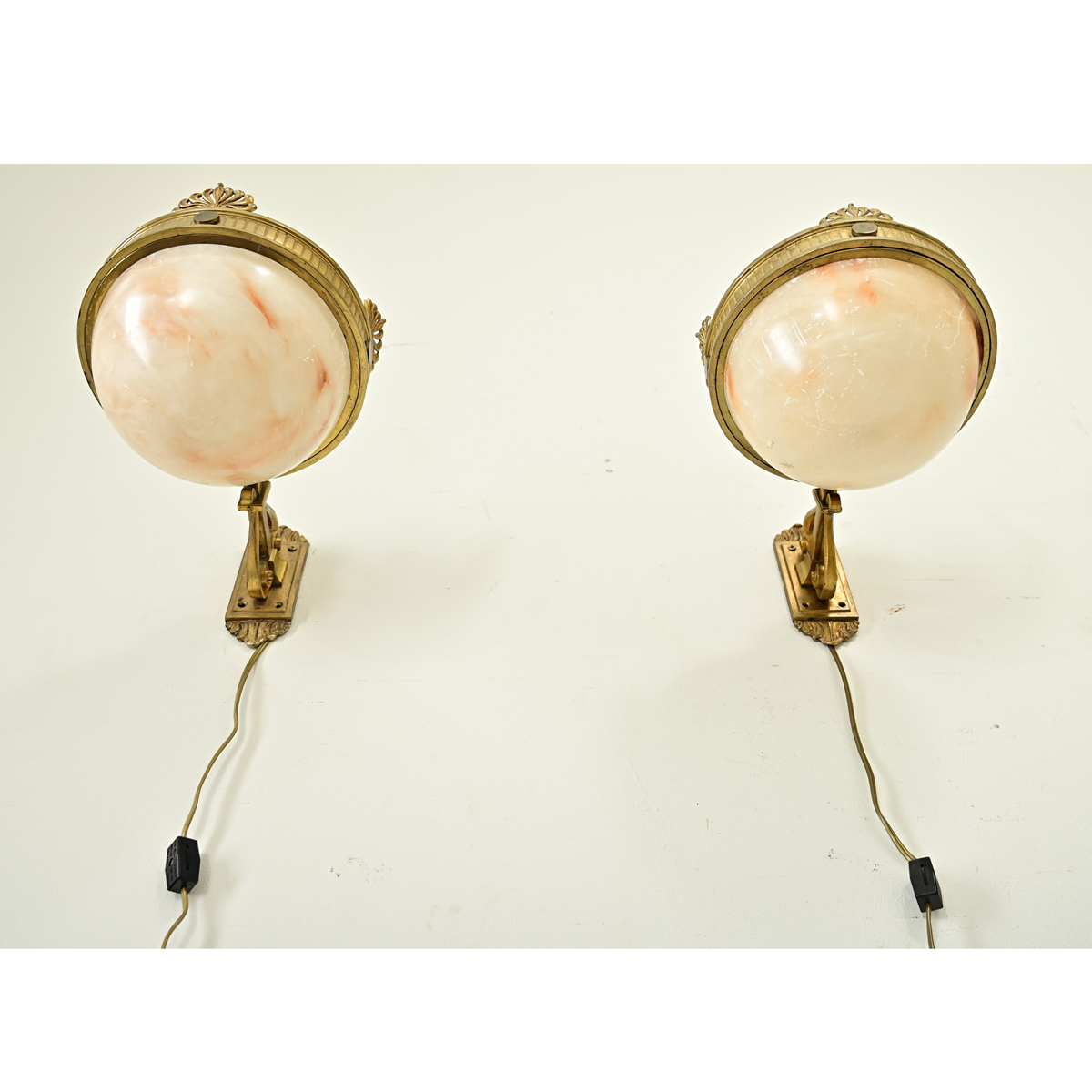 Exceptional pair of French Art Deco wall sconces with carved alabaster bowl diffusers hanging from brass frames. The back plates project from the wall as two scrolls around the square post, implying a lyre design. The Neoclassical influence continues in the fluted brass ring that secures the alabaster hemispheres, crowned at the top with stylized scallop ornaments. Swirls of pink in the stone result in a warm and flattering light put out by candelabra-base bulbs inside the fixture. Professionally cleaned and rewired to US electrical standards using UL-listed parts, ready to install in your interior. Please view the detailed images to see the current condition as there are a number of scratches due to the soft nature of the alabaster. Sold as a pair.