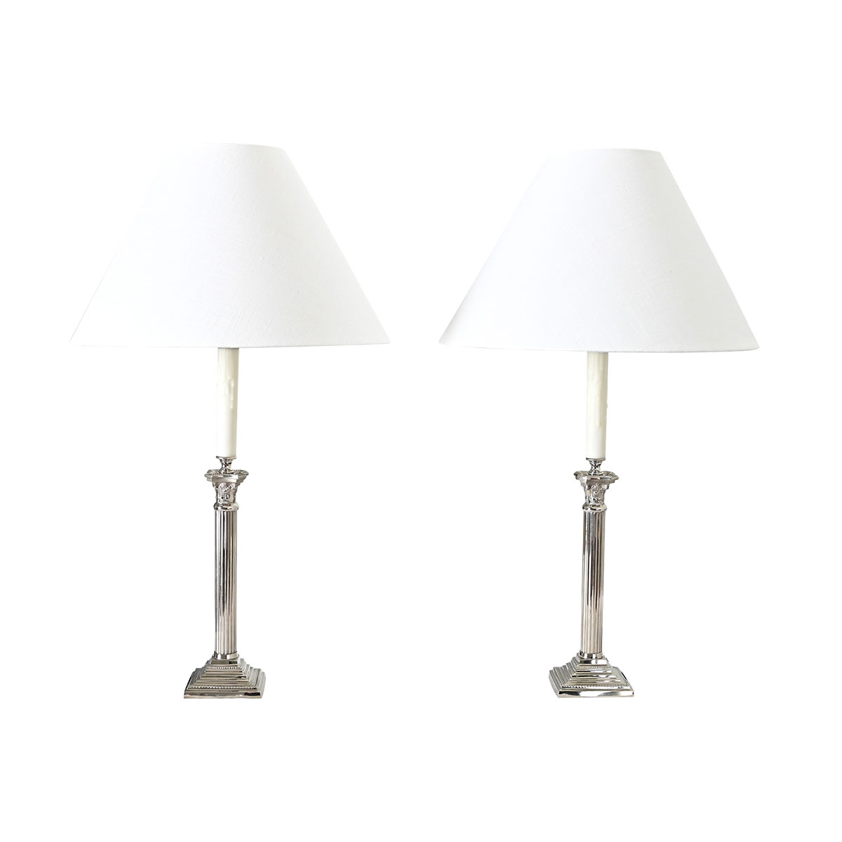 Polished in taste and patina, these vintage French Neoclassical-theme table lamps are a fantastic choice for buffet lighting, side tables, or bedside lamps. The silver metal lamps are fashioned like miniature Corinthian columns: fluted on the shaft, with capitals of foliate motifs rising from square bases in a stepped effect. New, conical linen shades diffuse the light from a standard base lightbulb with on/off switch on the sockets. Cleaned and wired for US electrical using UL listed parts adding chic, black braided cords this timeless pair of lamps is ready to be placed in your interior. Please view the detailed images. Sold as a pair.