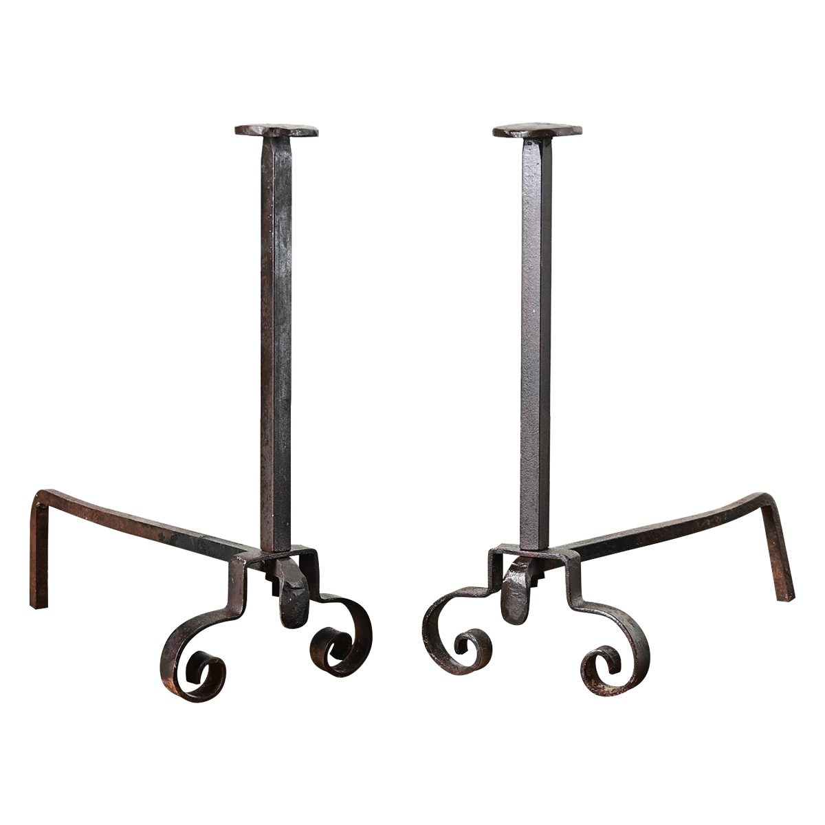 A charming pair of French hand-forged, wrought iron fireplace andirons–or chenets–made in the 19th century. Somewhat Gothic in style, they have a reddish brown patina from oxidation of the iron and exposure to high heat. The hefty andirons have straight legs protruding from the back and a vertical post at the front rising on scrolled feet. Please view the detailed images to see more. Sold as a pair.