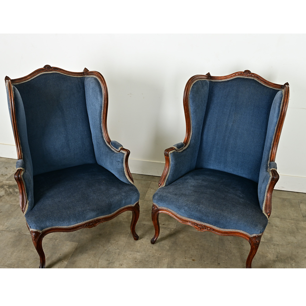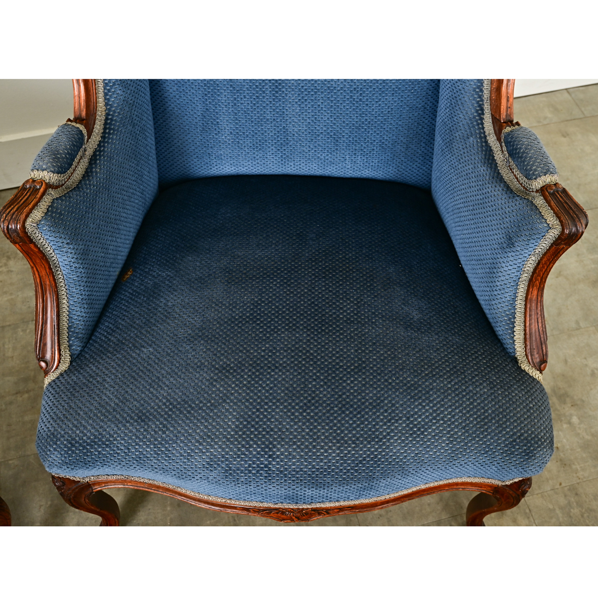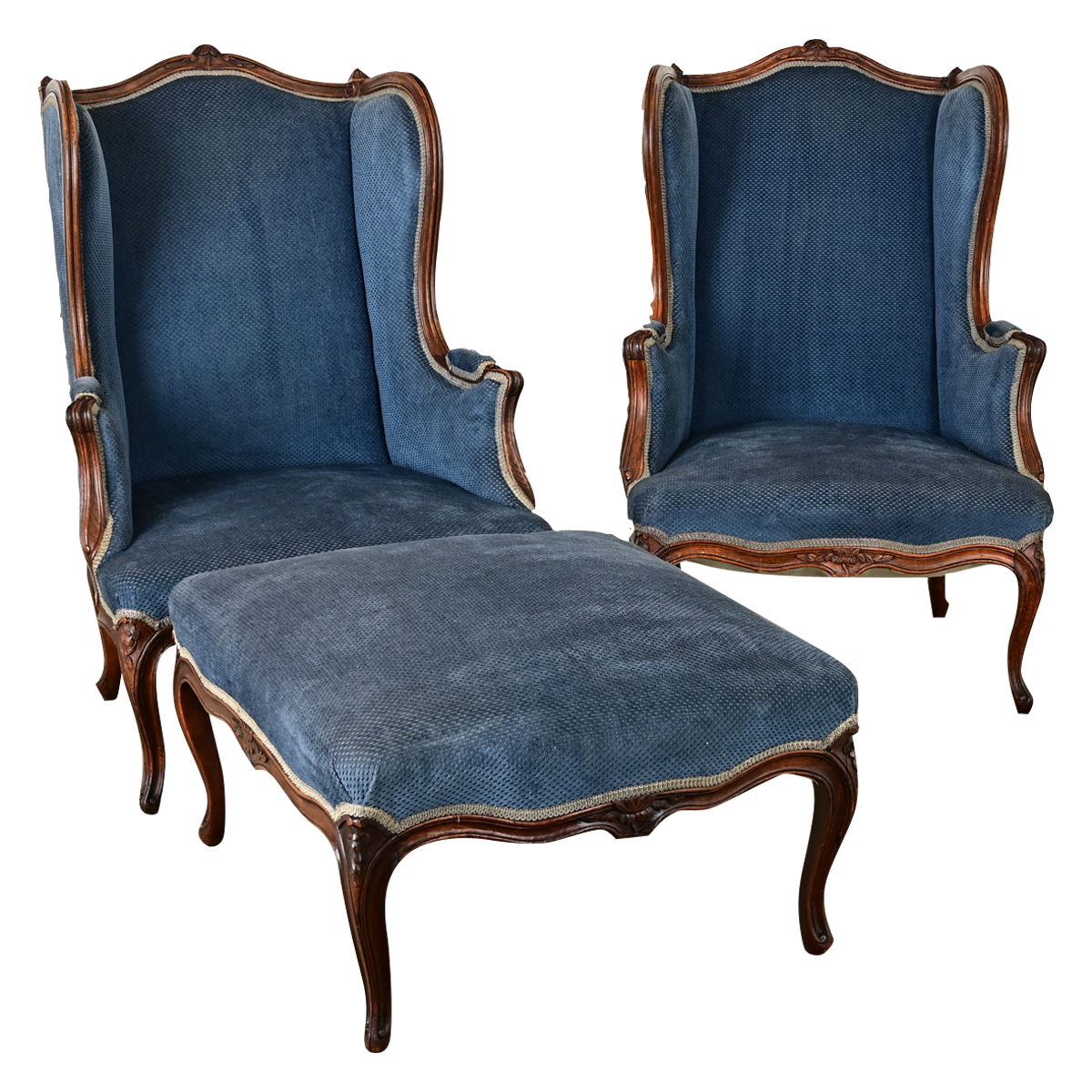 A sophisticated pair of French 19th century wingback bergere armchairs and large matching ottoman. One side of the ottoman is concave to fit the bowed front of the chair–forming a kind of chaise longue as desired–and curves out on the opposite side, along the lines of a Duchesse Brisee set. Typical of the Louis XV style, carved oak frames outlining the navy blue upholstery are accented by low finials in foliate motif along the serpentine curves from the handrail through the arms. They are accented with little manchette upholstered elbow pads for comfort. Supremely comfortable cushions on each wide seat make this set easy to incorporate into any existing home decor. The chenille-type fabric, likely added in the 20th century, in luminous indigo blue is in fair condition with a burn mark on one of the seats. Comfortable and deep, the seat height is 17 ¾” to the crown. Please know the chair legs have been tightened, and all the frames cleaned & polished with a French paste wax to be ready for their next chapter. Make sure to view the detailed images for a closer look at the current condition of this handsome set.