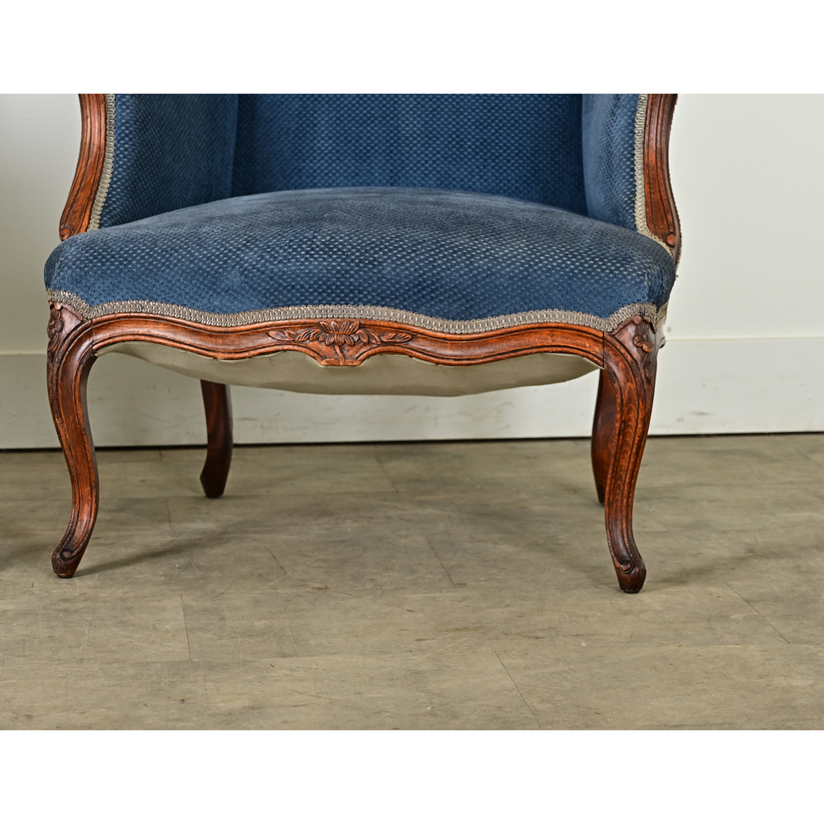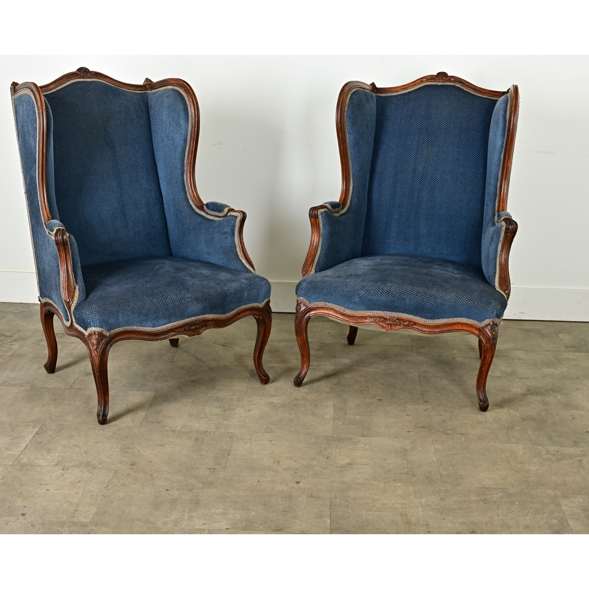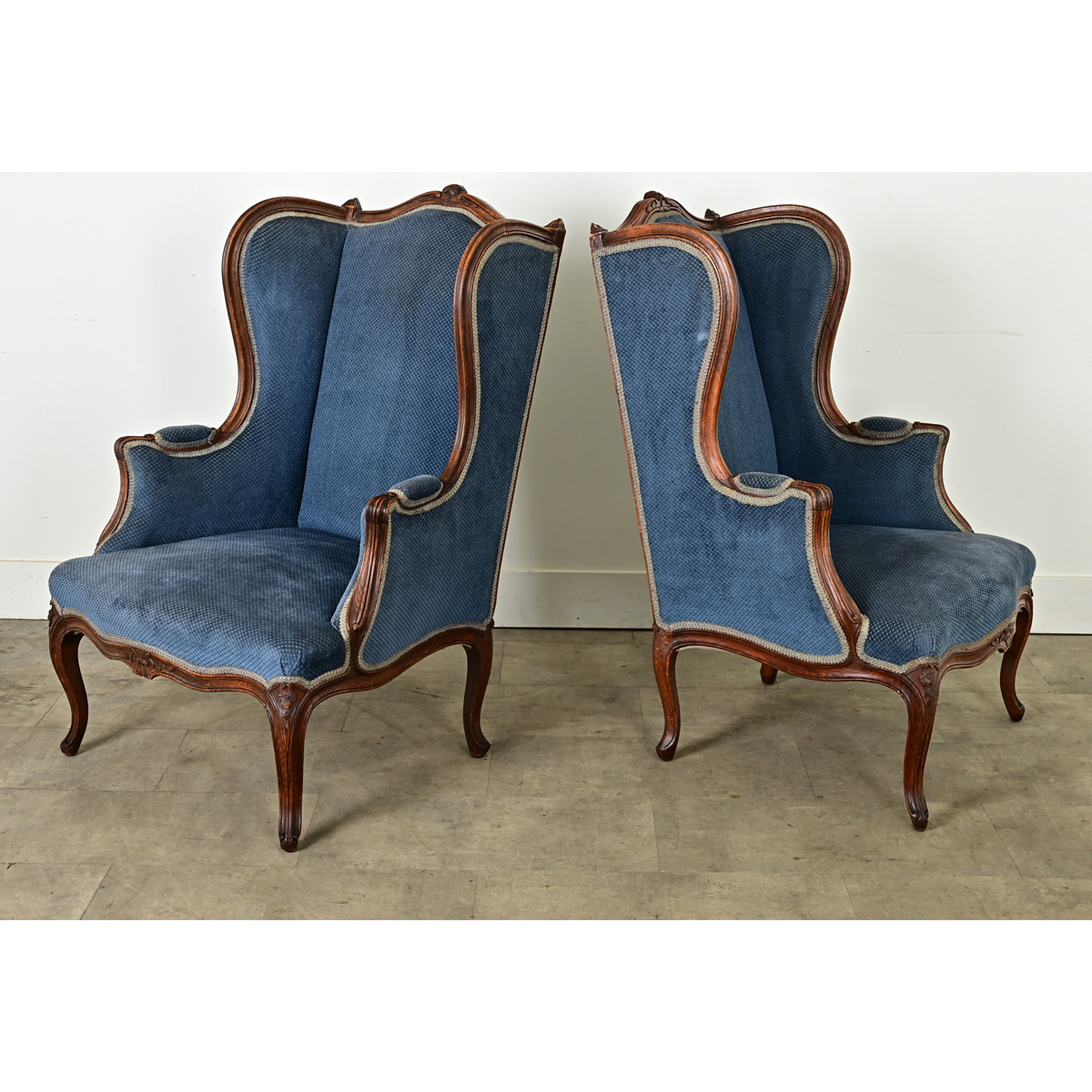 A sophisticated pair of French 19th century wingback bergere armchairs and large matching ottoman. One side of the ottoman is concave to fit the bowed front of the chair–forming a kind of chaise longue as desired–and curves out on the opposite side, along the lines of a Duchesse Brisee set. Typical of the Louis XV style, carved oak frames outlining the navy blue upholstery are accented by low finials in foliate motif along the serpentine curves from the handrail through the arms. They are accented with little manchette upholstered elbow pads for comfort. Supremely comfortable cushions on each wide seat make this set easy to incorporate into any existing home decor. The chenille-type fabric, likely added in the 20th century, in luminous indigo blue is in fair condition with a burn mark on one of the seats. Comfortable and deep, the seat height is 17 ¾” to the crown. Please know the chair legs have been tightened, and all the frames cleaned & polished with a French paste wax to be ready for their next chapter. Make sure to view the detailed images for a closer look at the current condition of this handsome set.