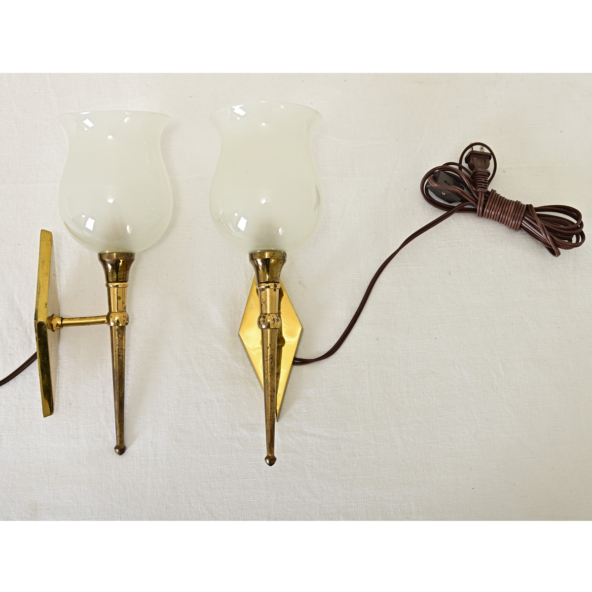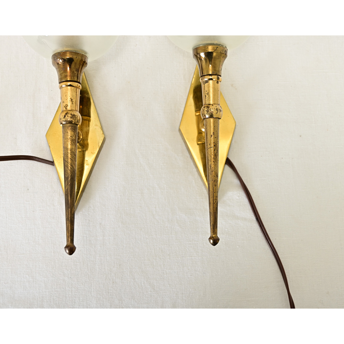 This petite pair of midcentury French brass sconces (in the manner of designer Jean Perzel) have a classic torchiere profile that will softly illuminate any space, from powder rooms to hallways. Each fixture mounts to the wall by an elongated diamond backplate, from which the torch extends, swelling at the top as a frosted glass globe. Light from just a single candelabra-base bulb inside casts a warm and inviting glow on the polished brass, radiating to the surrounding wallspace. Professionally cleaned and rewired for US electrical standards with UL-listed parts, ready to install in your interior. Please view the detailed images. Sold as a pair.