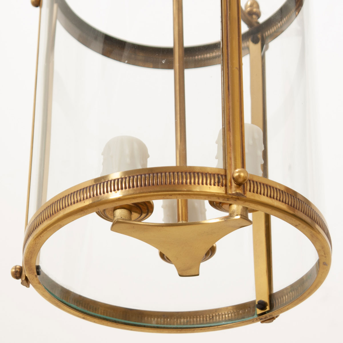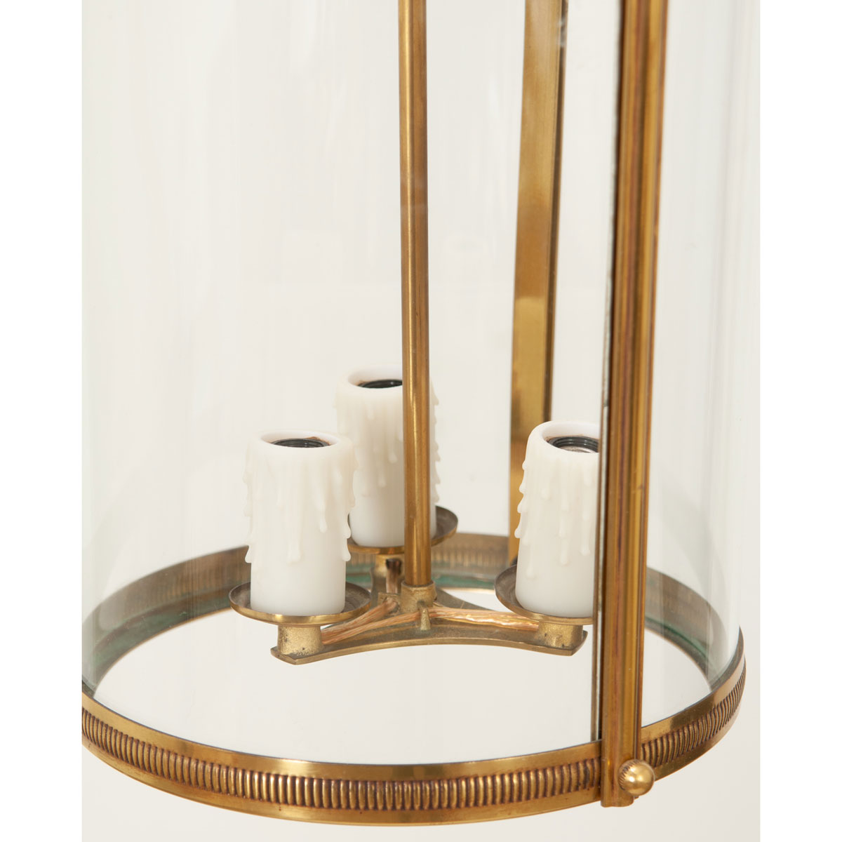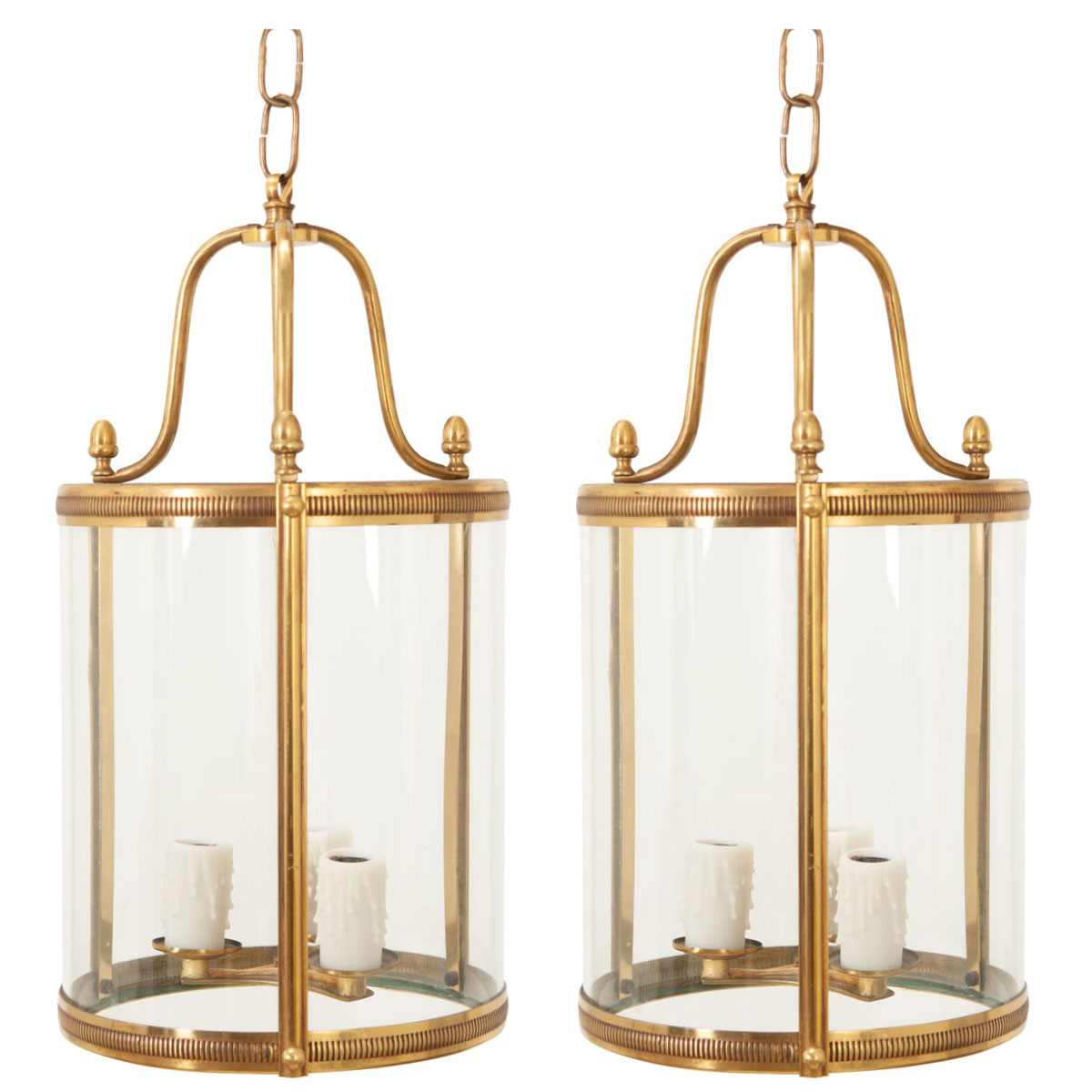 A Pair of petite French brass lanterns are simple in design and have curved glass panels. Each lantern has three candle cups. Recently wired for US electrical using UL listed parts, ready to be hung in your interior. 3’ of chain, 6 ¼” diameter canopy. Be sure to view the detailed images.