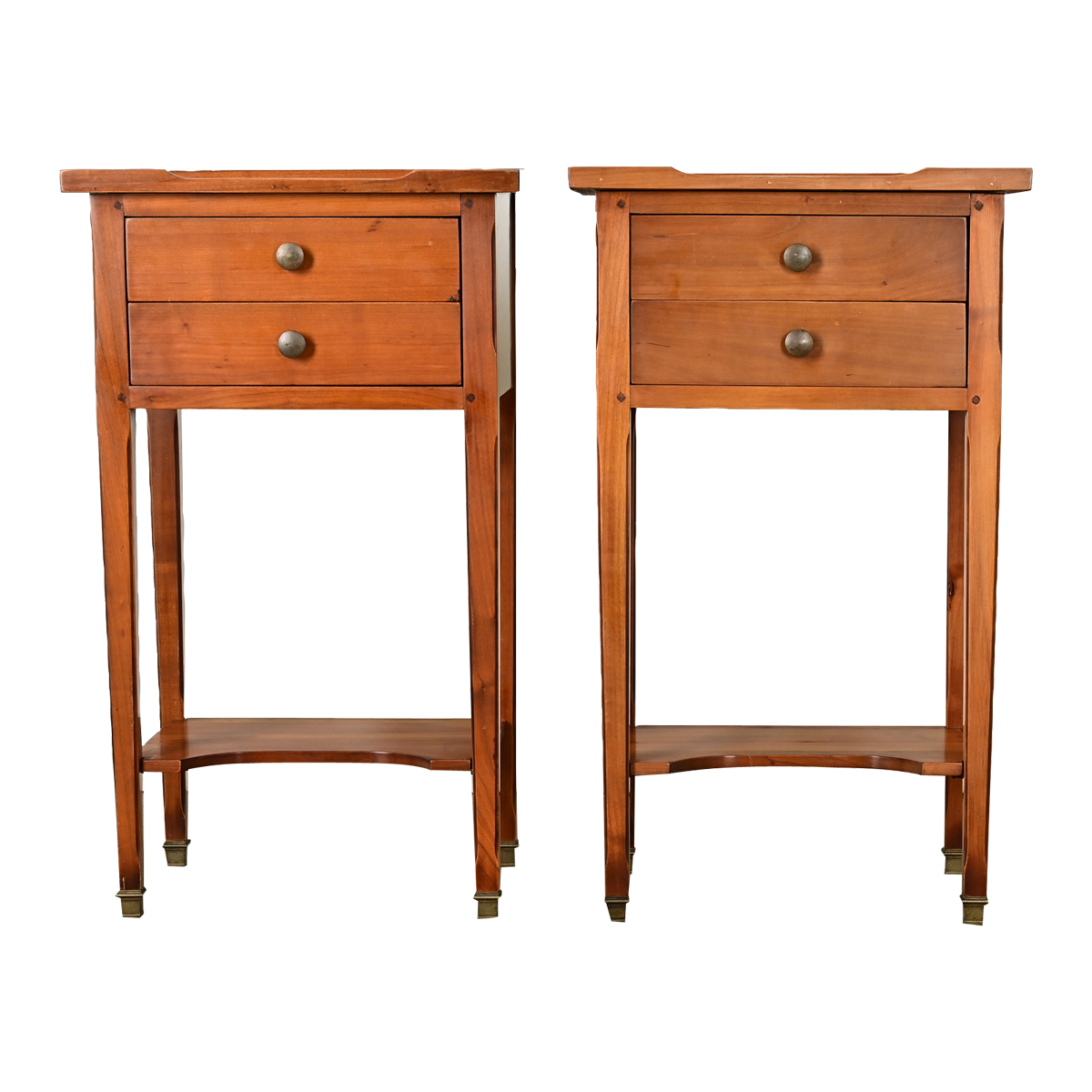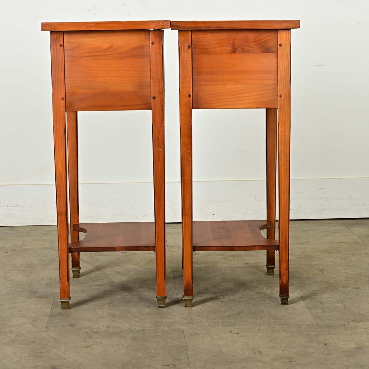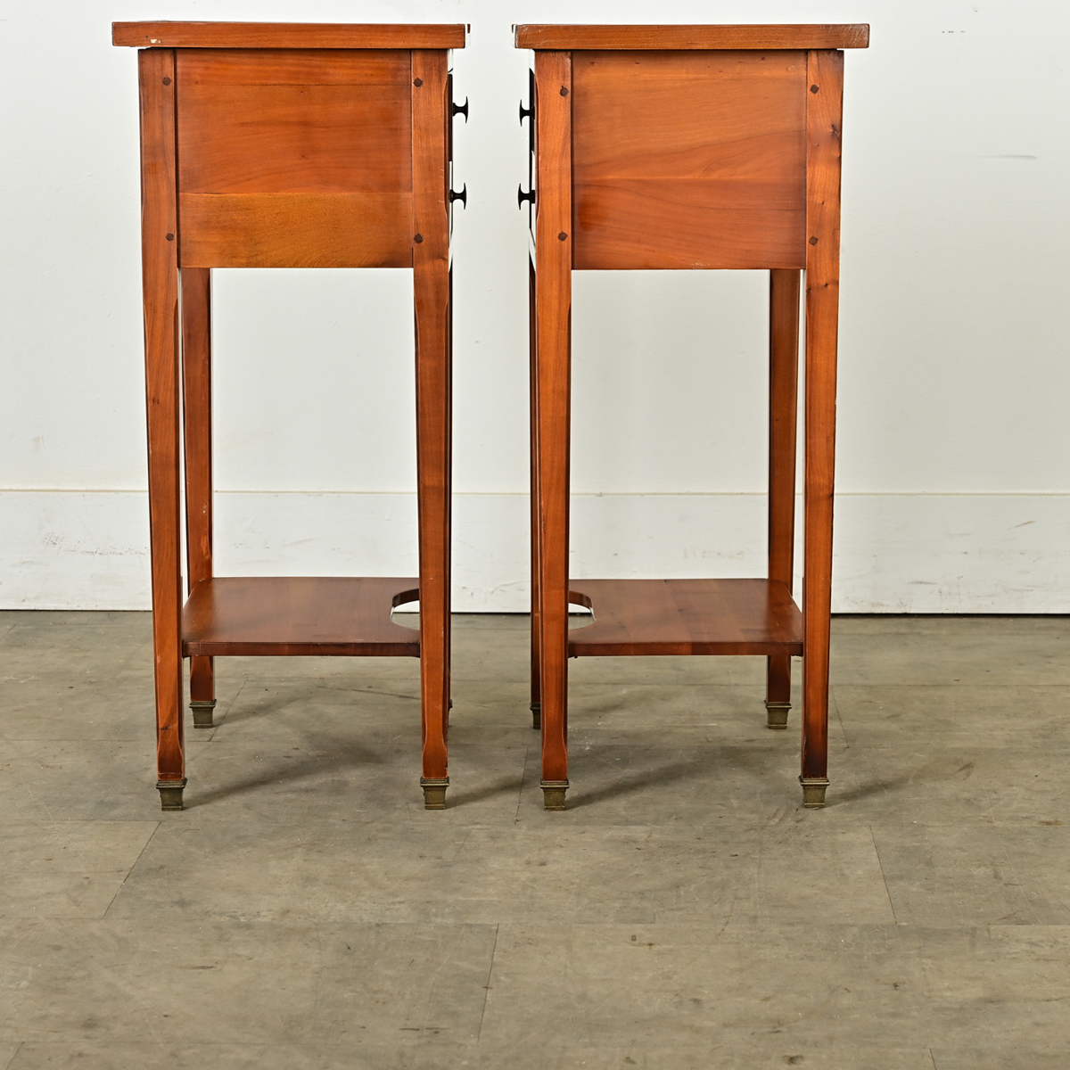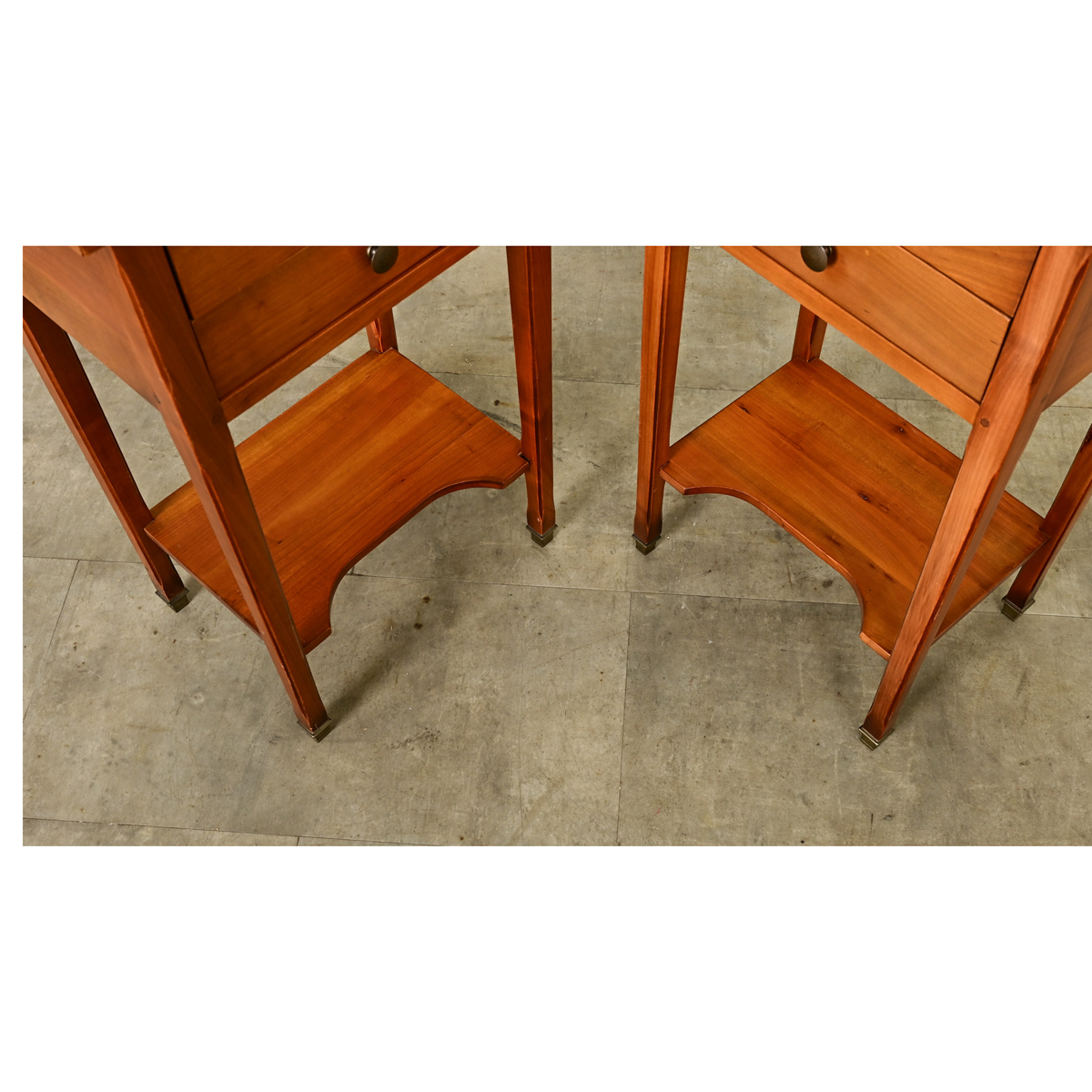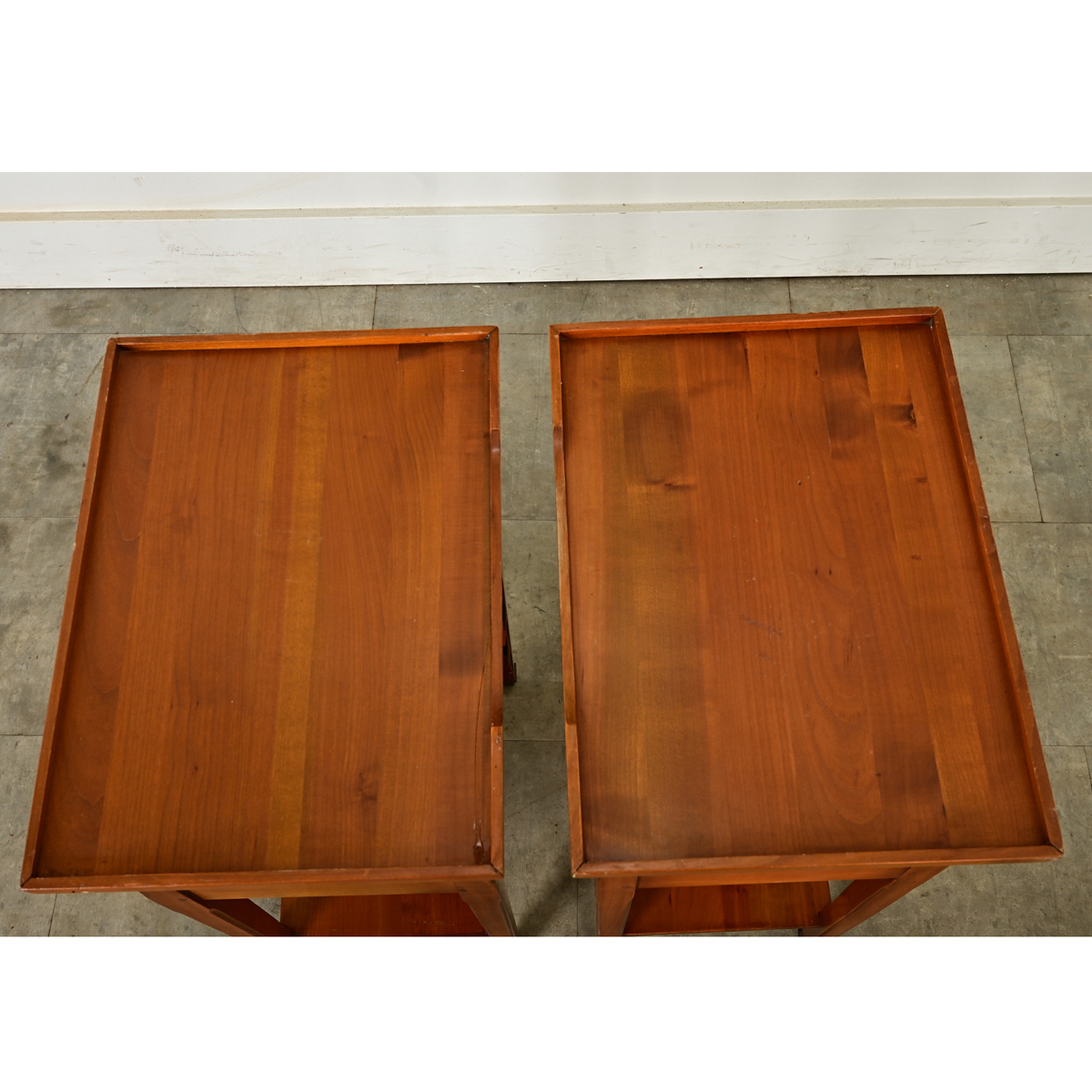 Understated and timeless pair of French fruitwood bedside tables that express an old soul but are more recently produced. The top surface features a low lip around the edges with a small cutout on the front as both a decorative feature and for comfort. Within the case are two shallow drawers opening by convex brass knobs. Thin, tapering legs support a lower shelf for storage and display, raised off the floor on brass sabots. Tables have been recently cleaned and polished with a French paste wax, ready to join your interior. Please view the detailed images. Sold as a pair.