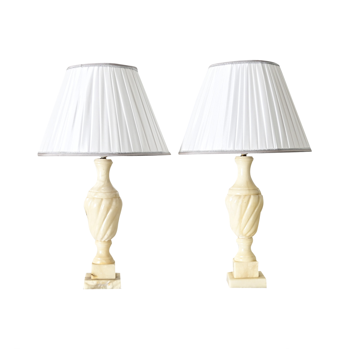 A delightful pair of French, turn of the century (circa 1900) carved marble table lamps. The cream-white stone of the trophy form is accentuated by grooves from the twirling effect around the vessel, complemented by vintage lamp shades in pleated white silk and gray trim. Each lamp uses a standard (Edison) bulb, controlled by an in-line switch on the new braided cord. Professionally cleaned and rewired for US electrical using UL-listed parts, ready to illuminate your interior. View the detailed images to see more, and the current condition as there are small chips around the bases. Sold as a pair.