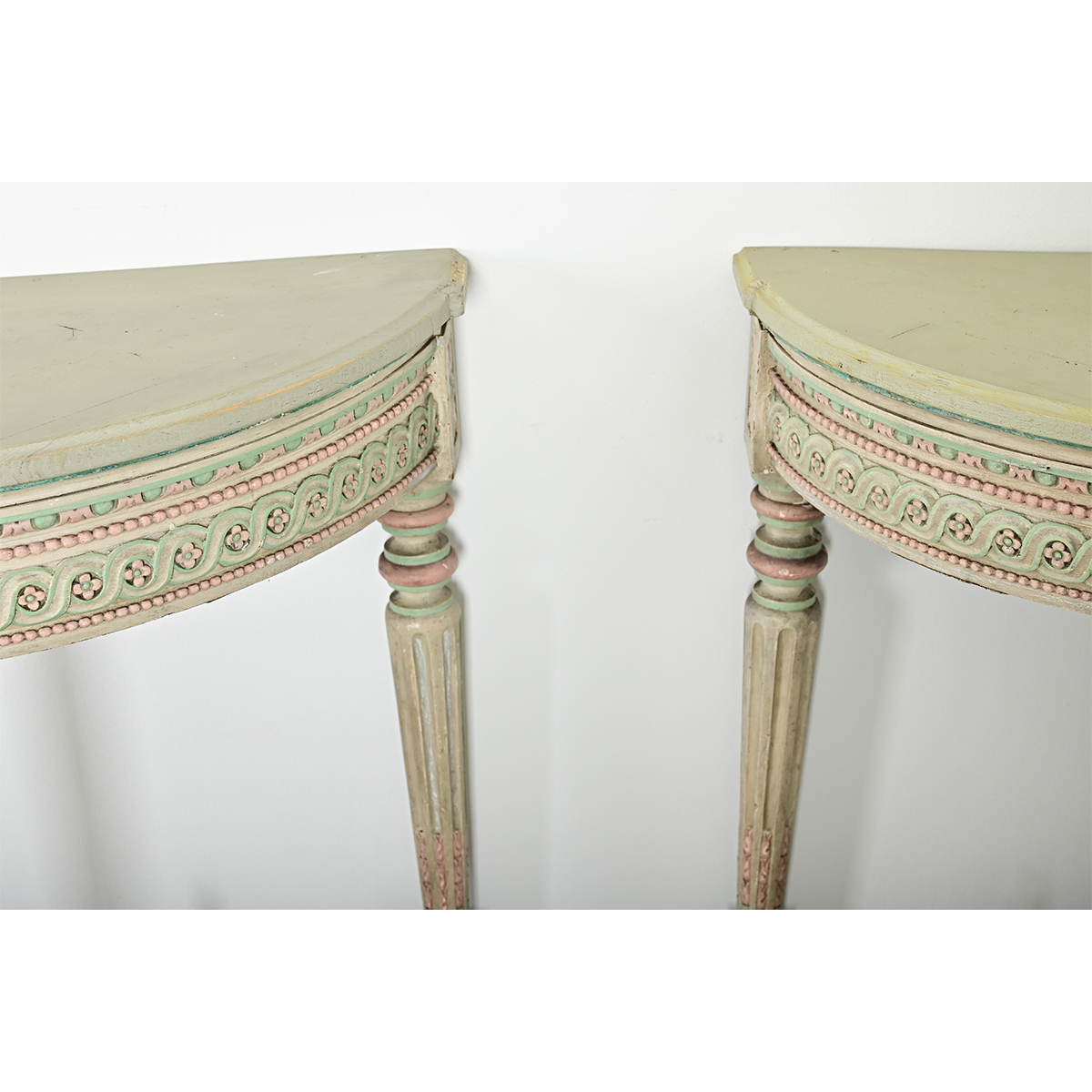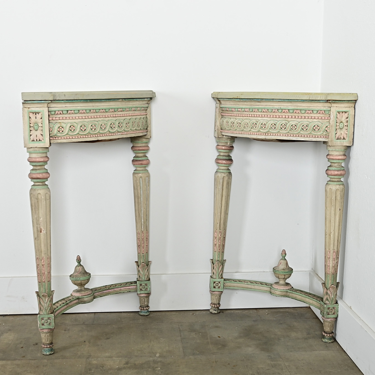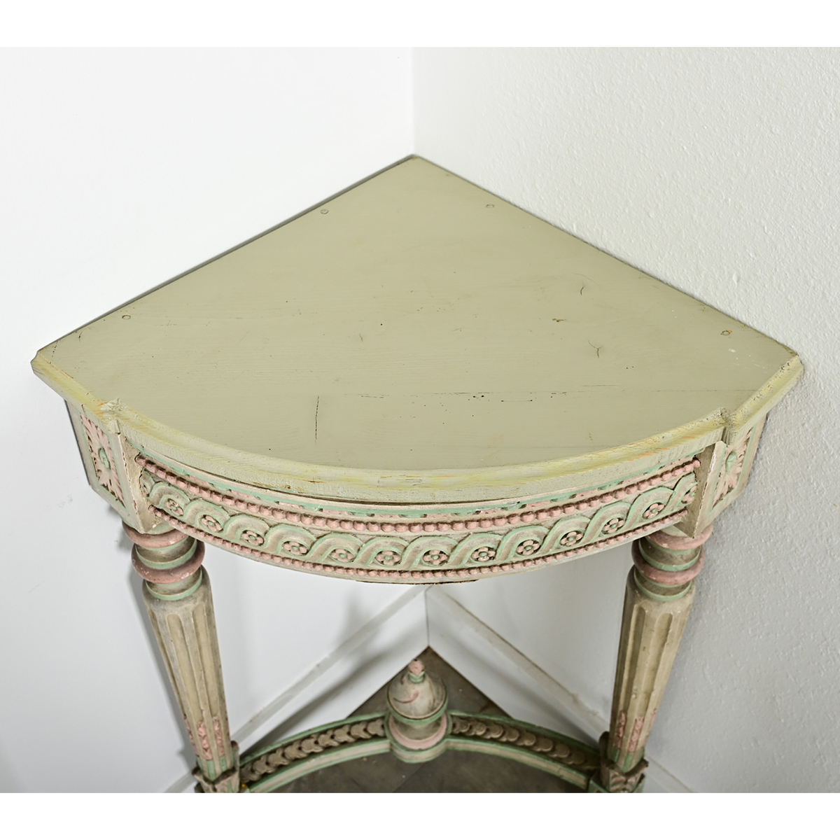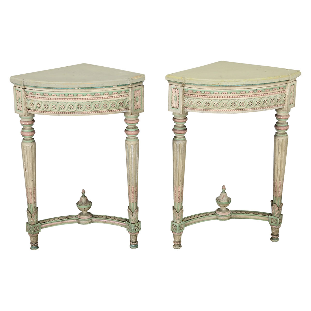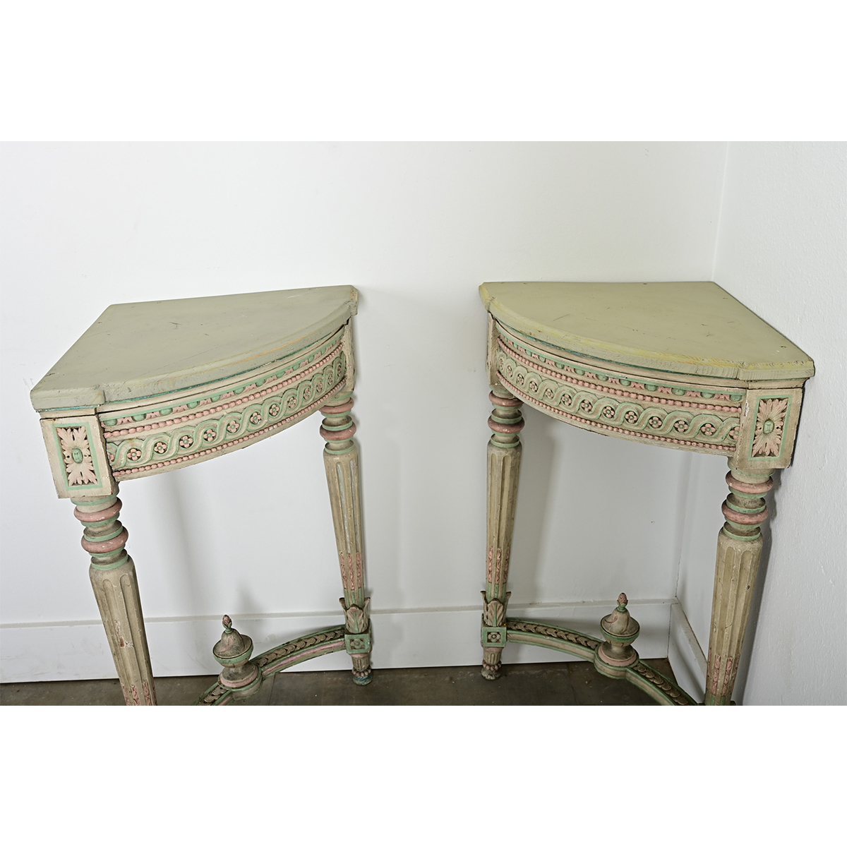 A matching pair of elaborately carved and painted vintage French quarter-round corner tables that are Louis XVI in style with regal, yet approachable forms to be adaptable to many decorating tastes and rooms around the home. These 20th century tables are based on consoles from the 1700s, with finely carved motifs wrapping the apron, accented by pastel pink and green–in lieu of the traditional gold gilt–over a French gray wash to keep the design light and cheerful. Two fluted, tapering legs are braced by a curved stretcher that is mounted with a finial (like an urn), adhering to the Neoclassical formula that carries all the decorative elements from the top to the floor. This pair of vintage carved and painted corner tables are sure to be an uplifting addition to any room (or two). It is recommended that they be secured to a wall by a professional for security. Please view the detailed images to see more. Sold as a pair.