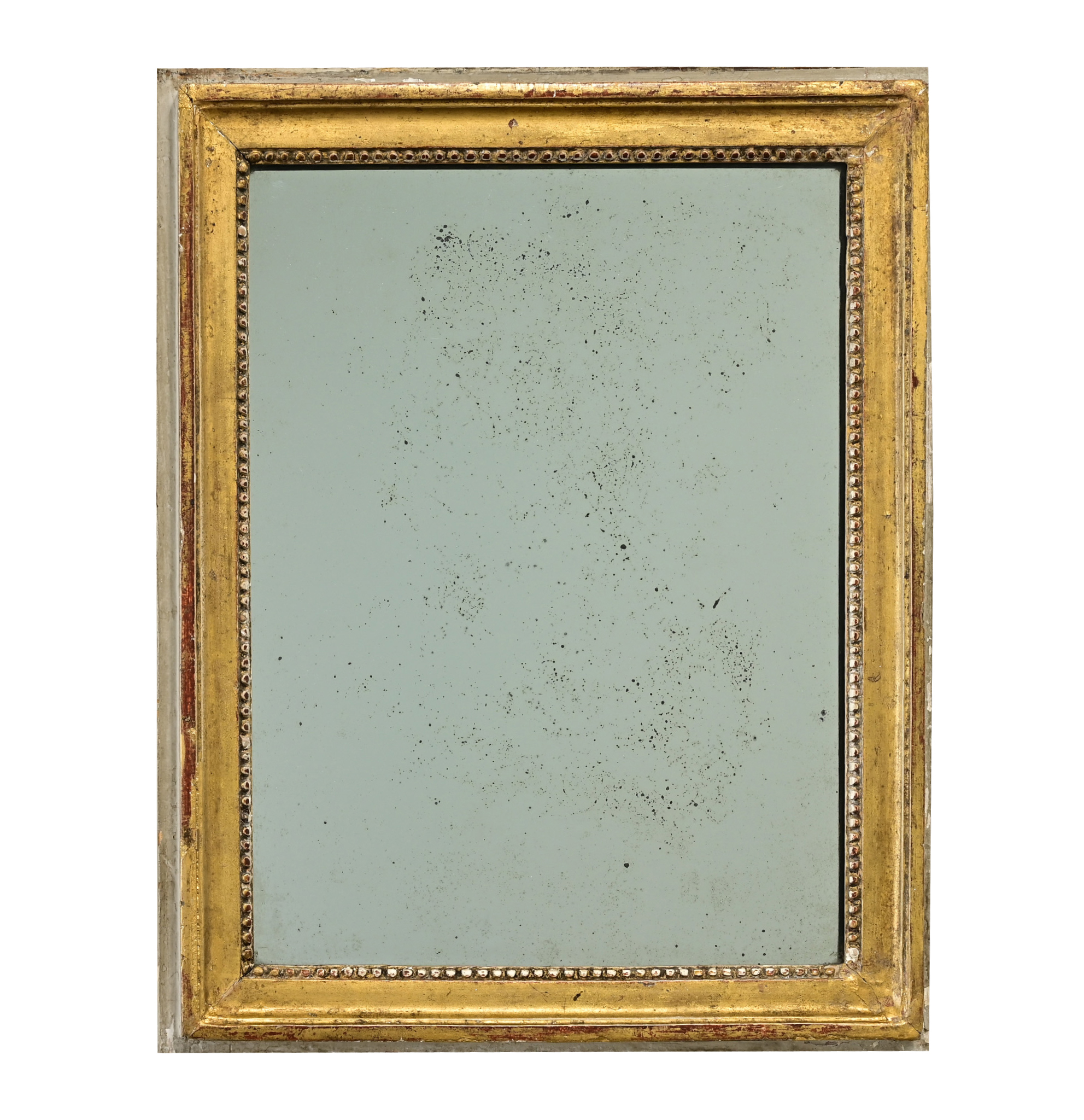 A petite French gold gilt mirror made in the Louis XVI period. This hand carved frame has its original gold gilt finish revealing the reddish bole beneath, with interior beading and a painted wood border. The symmetrical frame holds its original mirror plate with foxing. This mirror has its original back boards and a wire fixed to hang this mirror vertically. View the detailed images for the current condition.
