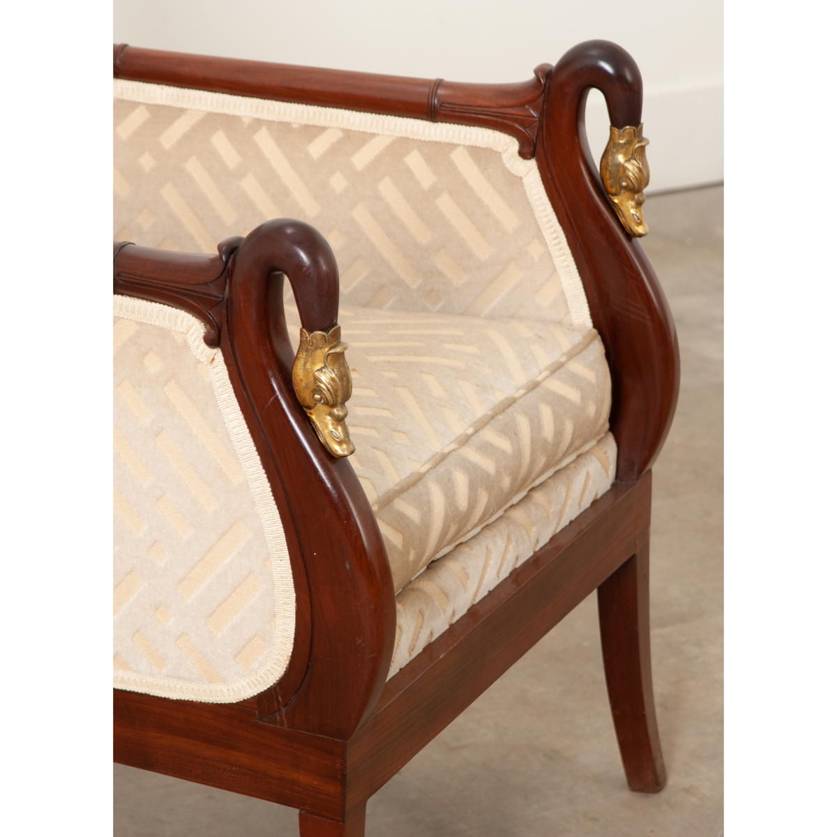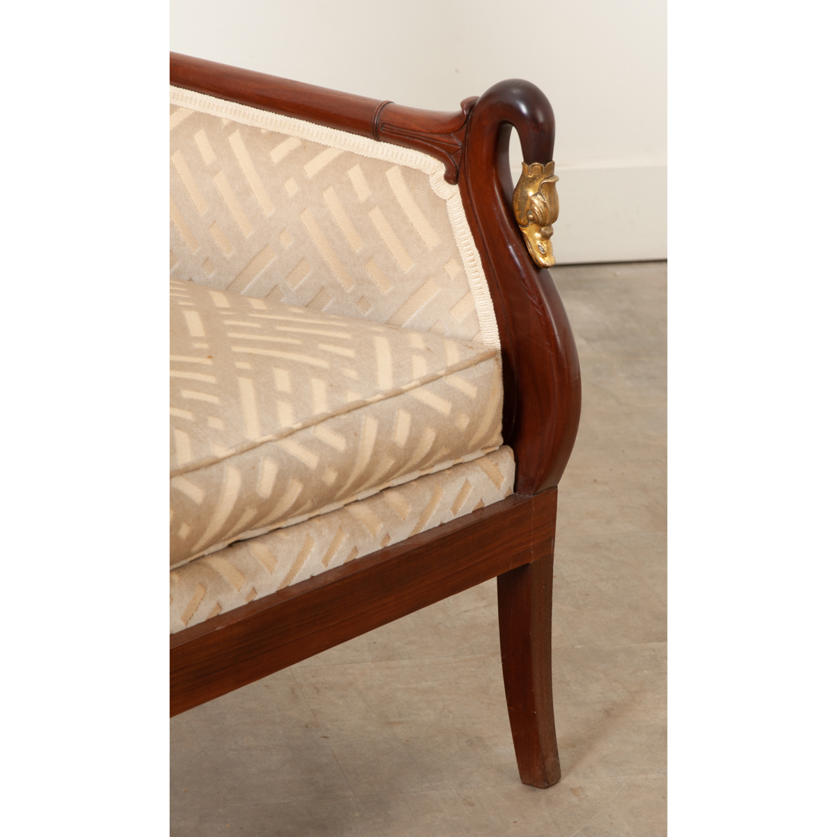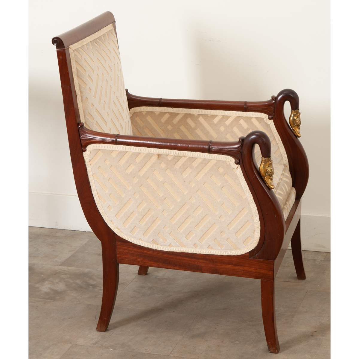 This restoration single bergere is made of solid mahogany and is sturdy. The chair has a squared off back with detailed arms ending in gilt swans. This interesting antique chair has gently worn cut velvet upholstery with a coordinating tape trim. Very comfortable with a seat height of 21”. Be sure to take a look at the detailed images to see the current condition of this arm chair.