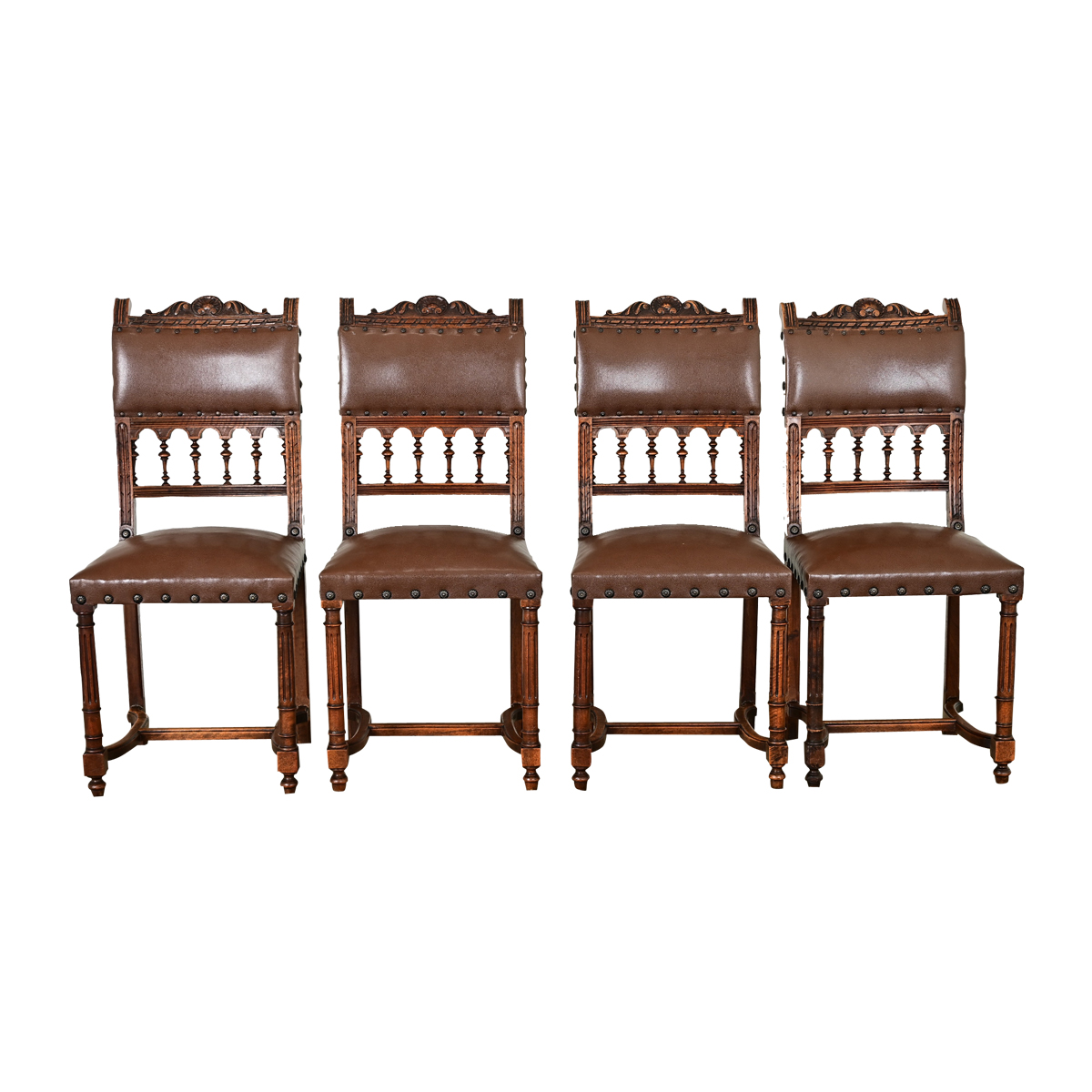 A set of four French late 19th century armless dining chairs to add a bit of Gothic drama to your home. Dark oak chair frames show meticulously carved and turned details from the top of the arched handrail through the fluted legs. Clean, faux leather upholstery in chocolate brown is a practical and more recent update, accented by large studs of bronze patina. The wood chair frames express their patina through tones from ebony to toffee in the figured grain. Chair seats are firm and comfortable with a height of 19 ½”to the crown. Cleaned and polished with a French paste wax, this set of chairs are ready for your interior. Make sure to view the detailed images to see the current condition. Sold as a set of four.