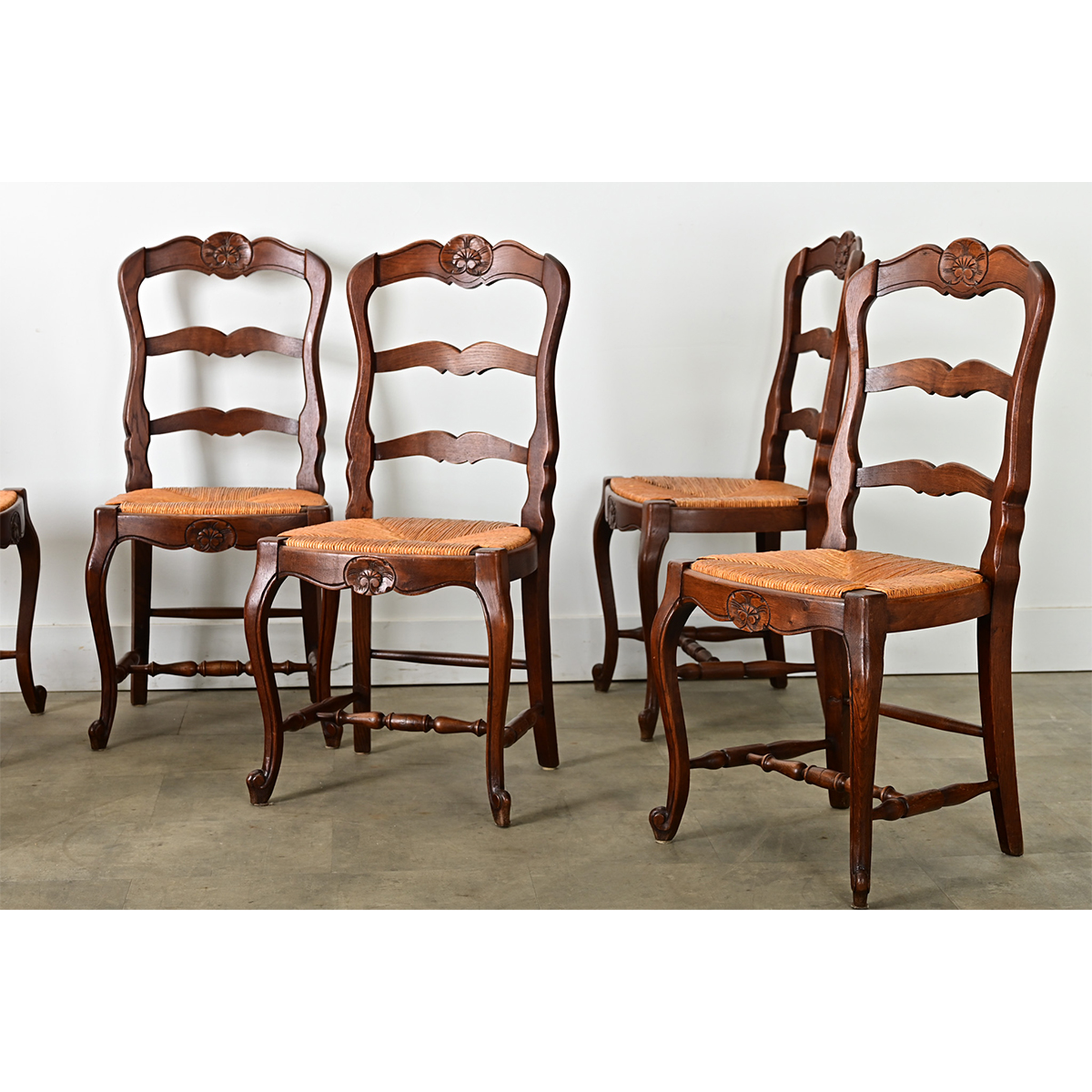 Set of six (6) vintage Louis XV style dining chairs with beautiful carvings to round out the ladder-backs of each woven rush seat. Handcrafted from solid walnut frames, this inviting set dates to circa 1940 but the iconic Provincial/Provençal silhouette would have origins going back to the 18th century. Each chair is decorated with a shell medallion on the crest rail–repeated again on the apron–underscored by the curvaceous qualities of the ladder and cabriole front legs. Original woven rush seats inset in the frame are in good condition, contributing their own organic qualities to the overall effect of a chair design that is at once regal and relaxed. Note that the seats are removable to easily make repairs or switch them out with upholstery to suit one’s tastes and décor. Please view the detailed images to see more. Sold as a set of six.