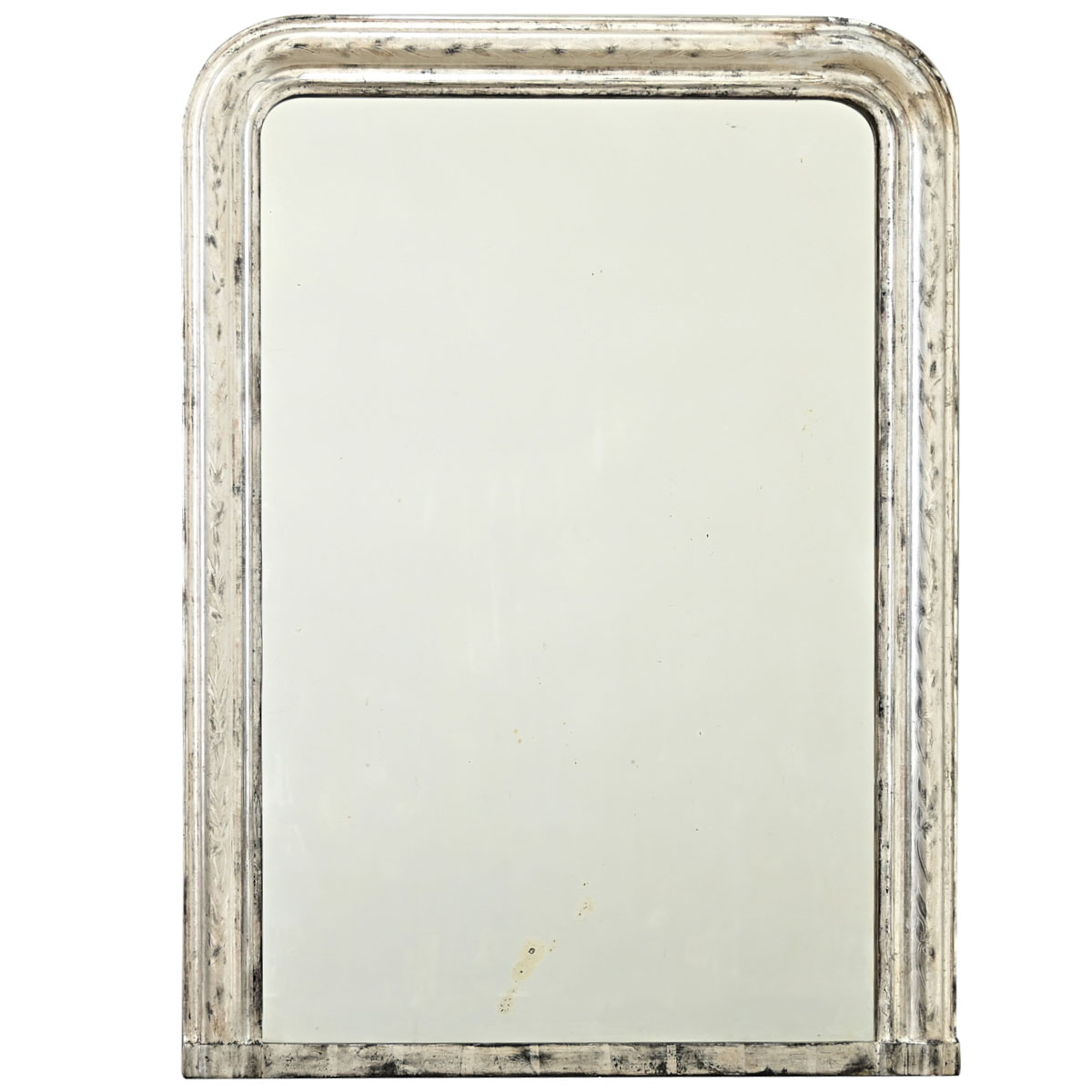 A French 19th century Louis Philippe mirror with an understated, silver gilt frame enhanced by dark oxidation and craquelure texture. Etched into the frame is an elegant, scrolling floral motif like iris that is interrupted by a few cracks and areas of wear which give authentic patina to the design. The original mirror plate is spotted with foxing in the glass, otherwise the reflection is quite clear. This gorgeous mirror will be right at home in many decorating tastes. Please view the detailed images to see more.
