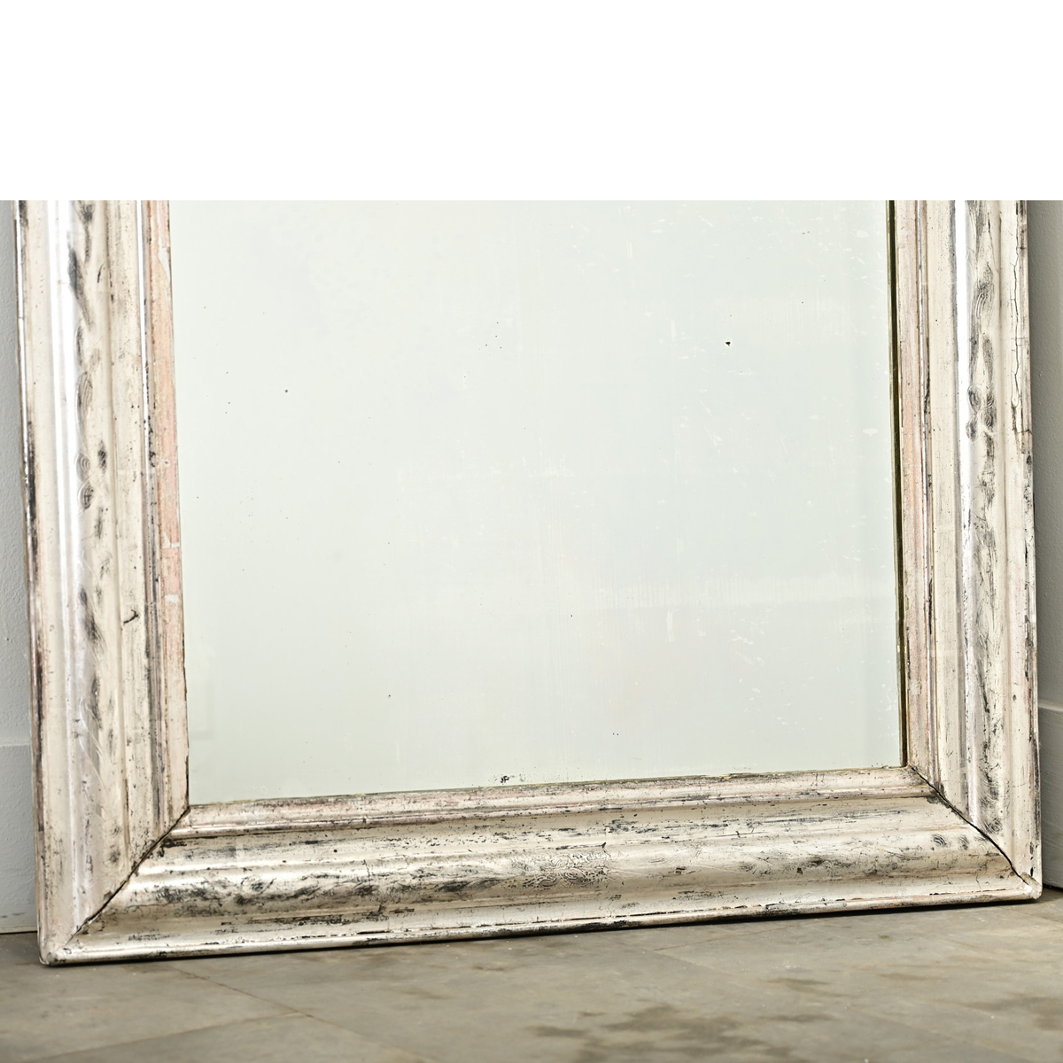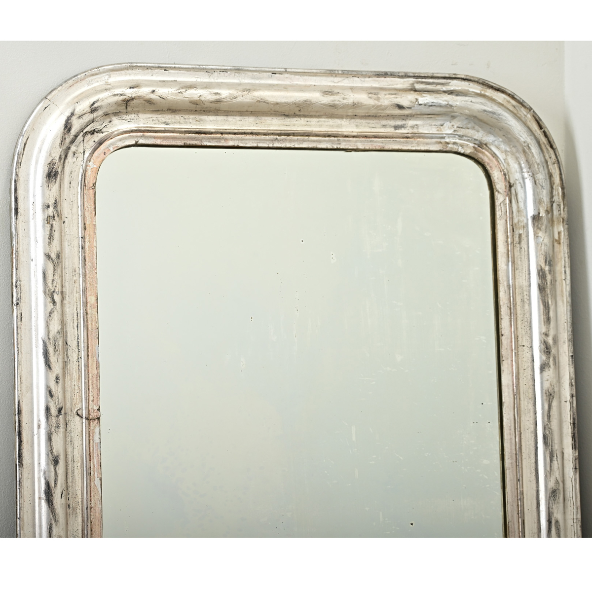 A French 19th century Louis Philippe mirror with an understated, silver gilt frame enhanced by dark oxidation and craquelure texture. Etched into the frame is an elegant, scrolling floral motif like iris that is interrupted by a few cracks and areas of wear which give authentic patina to the design. The original mirror plate is spotted with foxing in the glass, otherwise the reflection is quite clear. This gorgeous mirror will be right at home in many decorating tastes. Please view the detailed images to see more.
