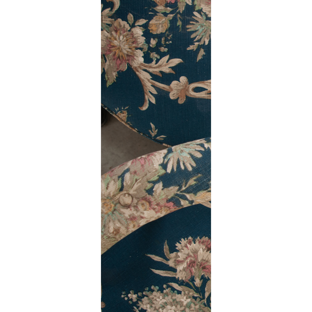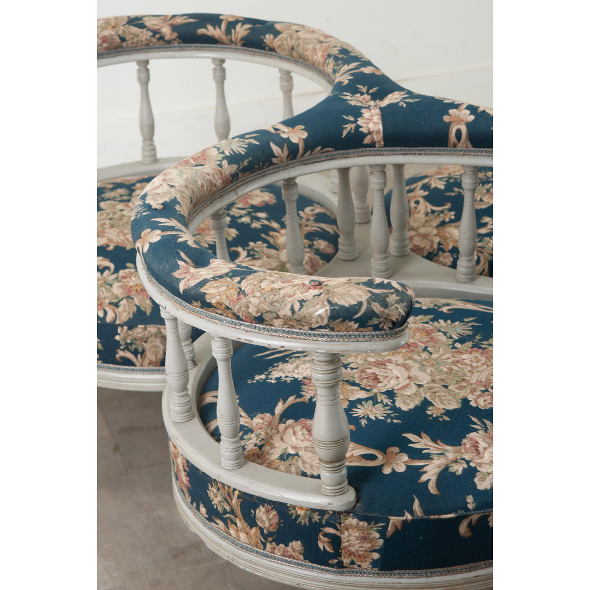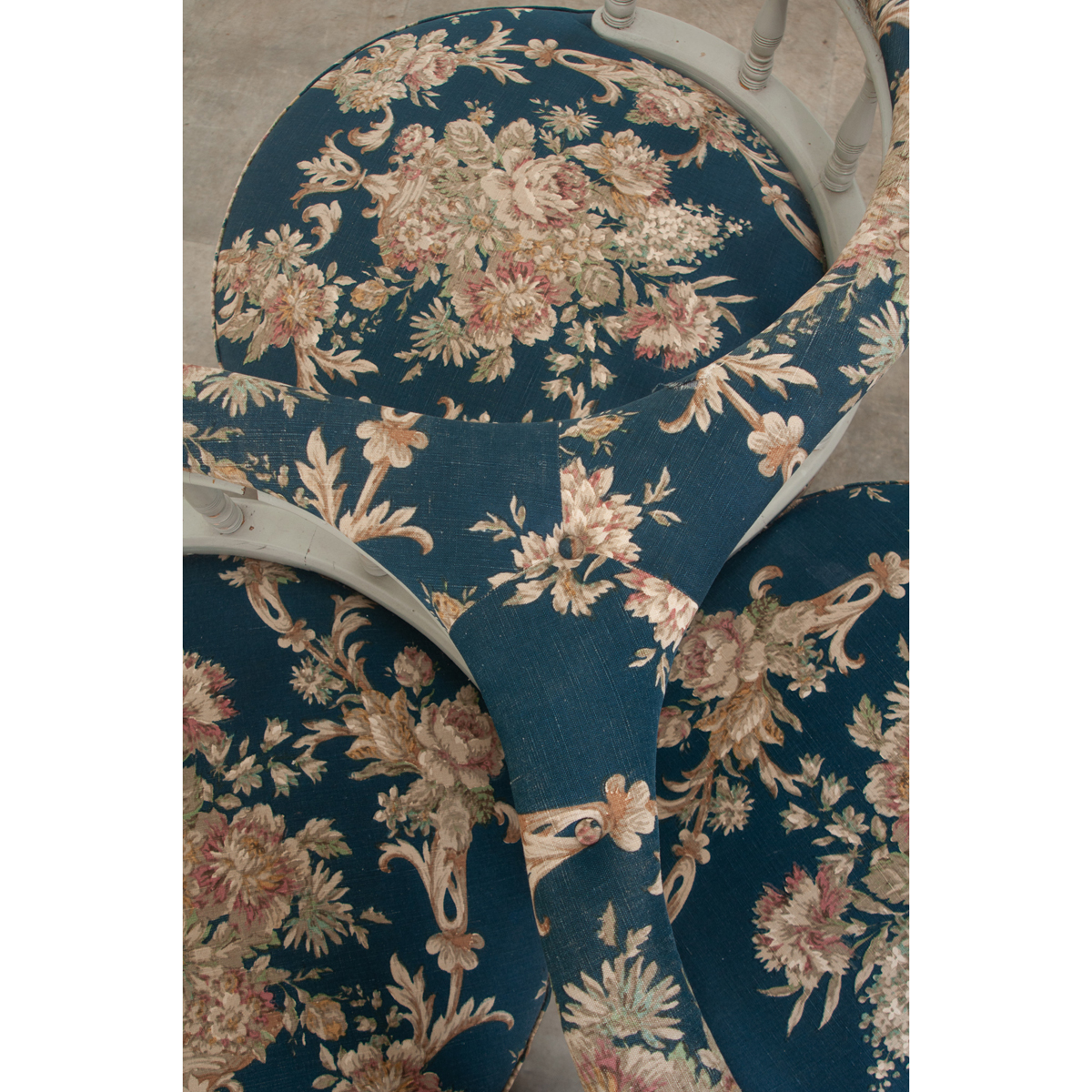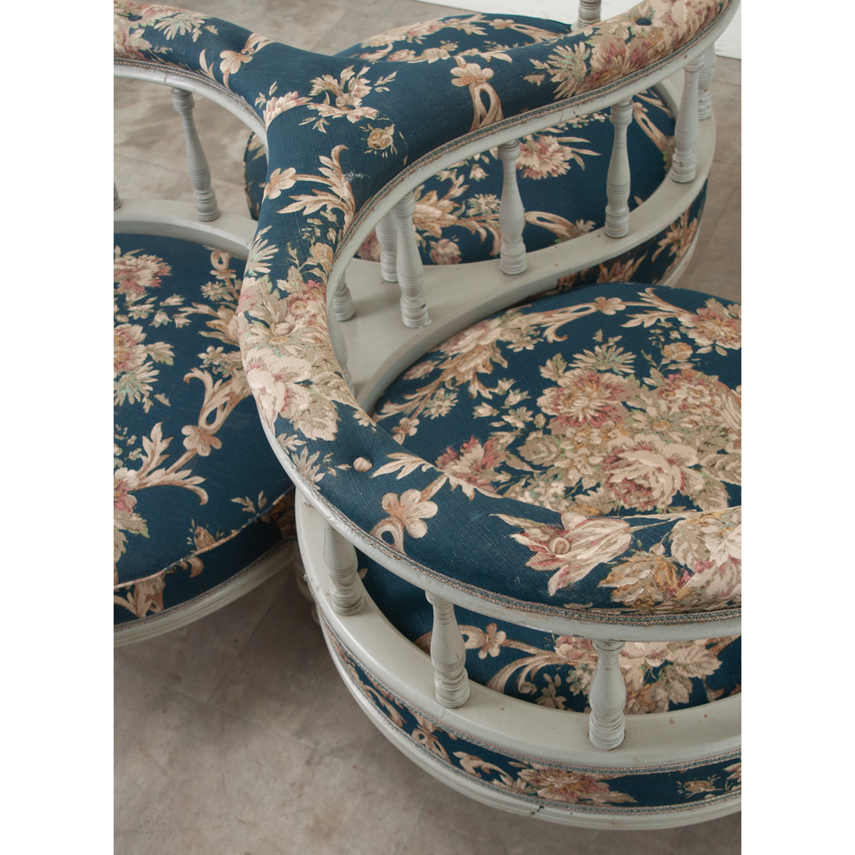 An interesting three-seat roundabout conversation sofa, known as an “Indiscret” (which similar to a tete-a-tete with one extra seat) introduced around the time of Napoleon II and continuing in popularity through the Victorian era. There are three curved, upholstered, and tufted arms on a painted baluster arcade curling around three boxed, upholstered seat cushions in a blue & pink floral pattern. The whole sits on a multitude of turned and painted legs on casters to easily rotate or move the piece as needed for parties. Be sure to view the detailed images to see the current condition of this unusual conversation sofa.