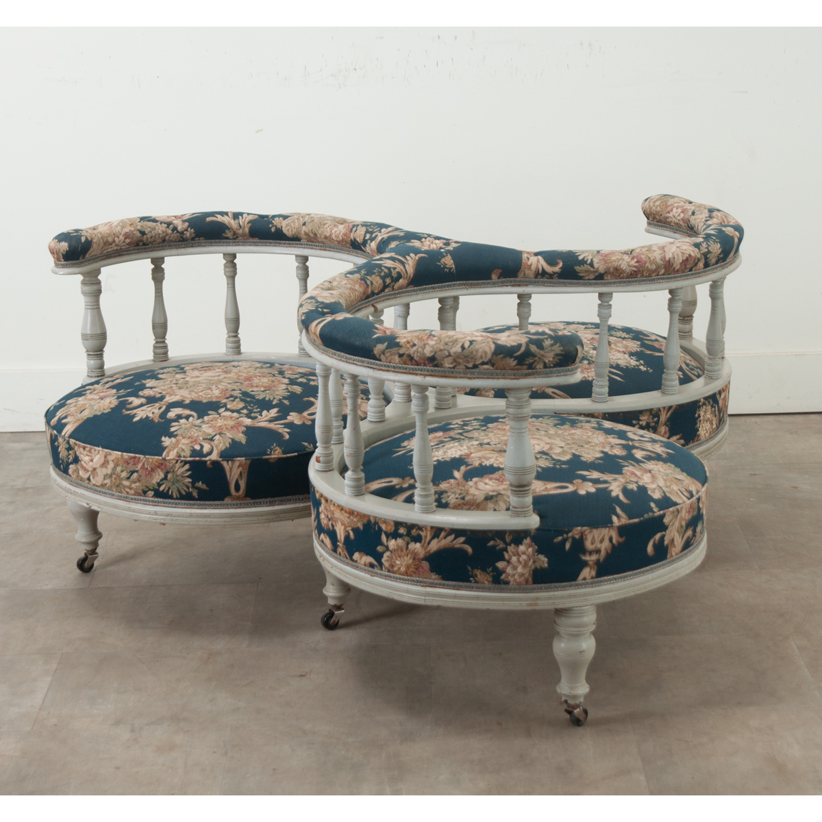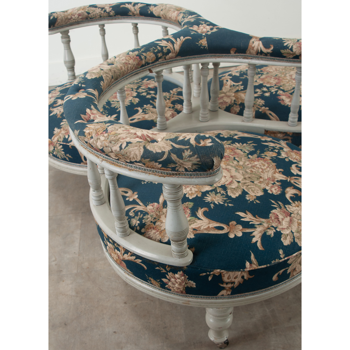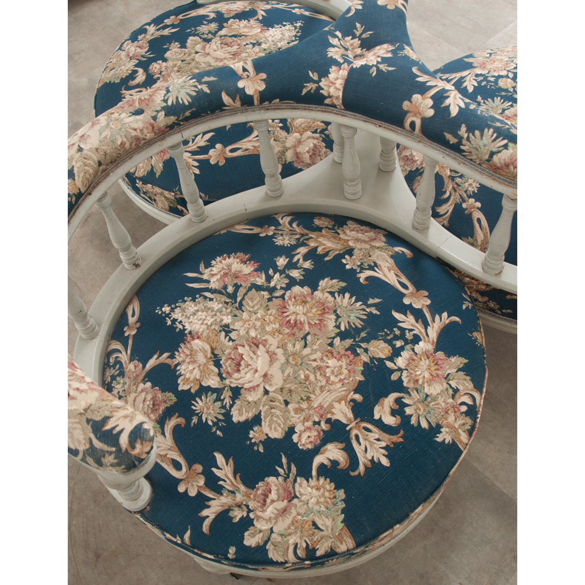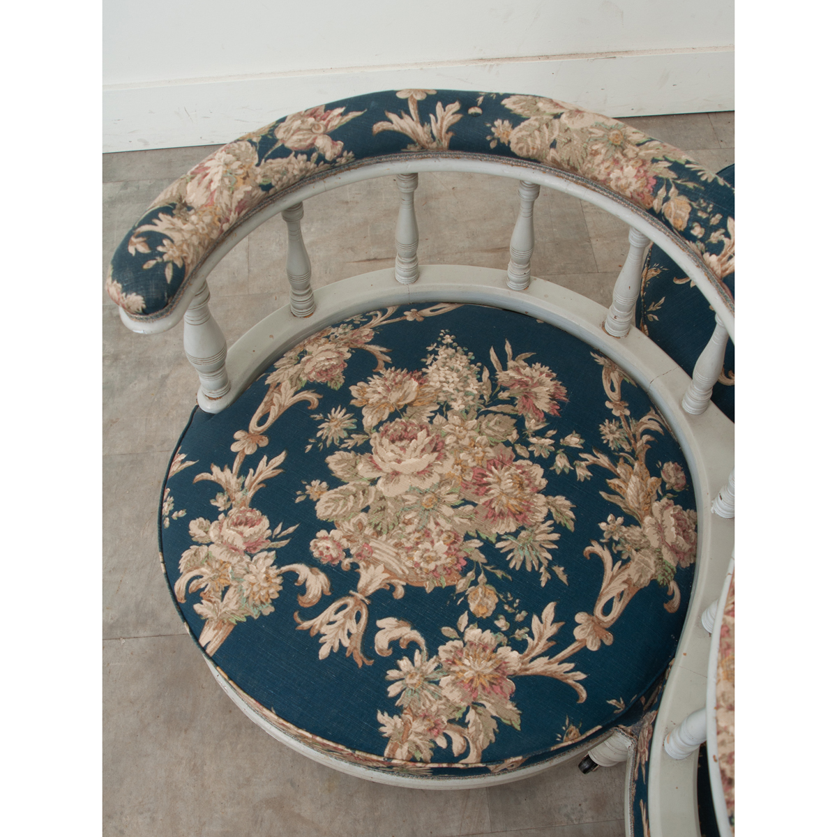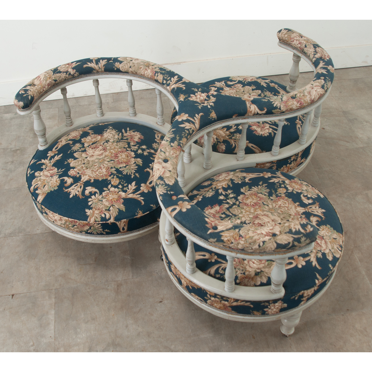 An interesting three-seat roundabout conversation sofa, known as an “Indiscret” (which similar to a tete-a-tete with one extra seat) introduced around the time of Napoleon II and continuing in popularity through the Victorian era. There are three curved, upholstered, and tufted arms on a painted baluster arcade curling around three boxed, upholstered seat cushions in a blue & pink floral pattern. The whole sits on a multitude of turned and painted legs on casters to easily rotate or move the piece as needed for parties. Be sure to view the detailed images to see the current condition of this unusual conversation sofa.