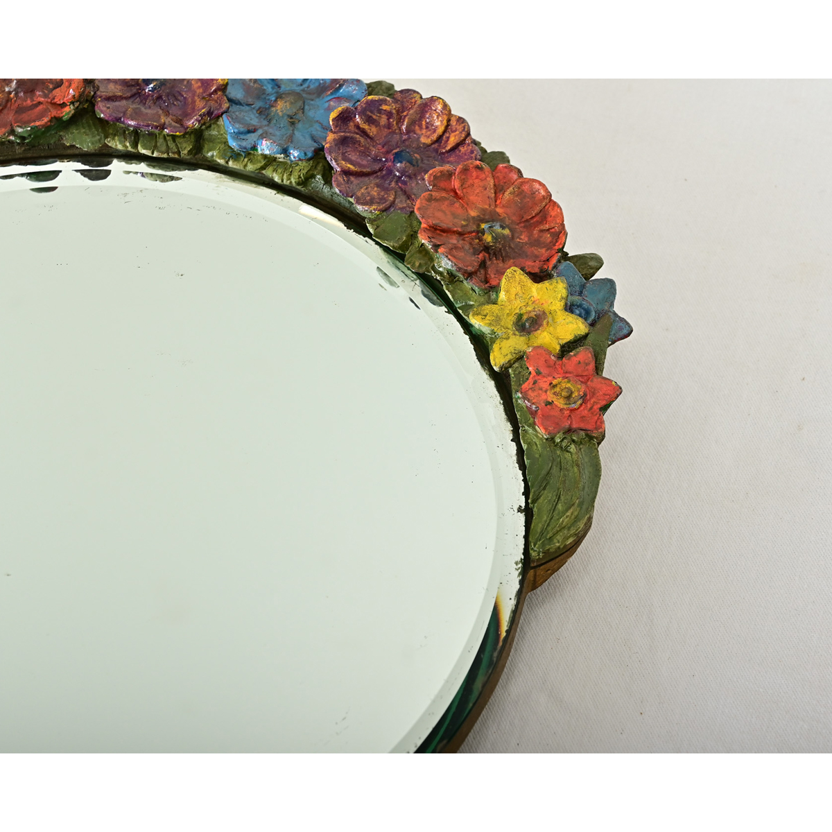 A crown of flowers to brighten your mornings with this Barbola-style dressing table or vanity mirror. Molded of gesso and painted by hand, the crescent of polychrome blooms tops the original, oval mirror plate that has a thin beveled edge. May also be laid flat to use as a display. View the detailed images. Dimensions when opened: 10 ⅝”H x 10 ½”W x 8 ¼”D