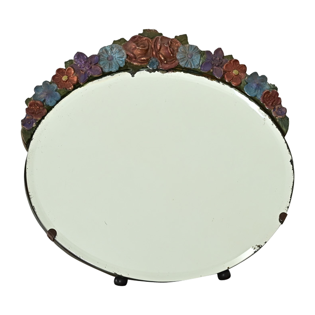 A crown of flowers to brighten your mornings with this tabletop or vanity mirror. Molded in gesso and painted by hand, the crescent of polychrome blooms tops the original, oval mirror plate that has a thin beveled edge. May also be laid flat to use as a display. View the detailed images. Dimensions when opened: 10 ½” H x 12 ¼” W x 8” D