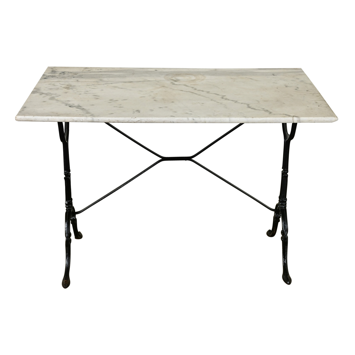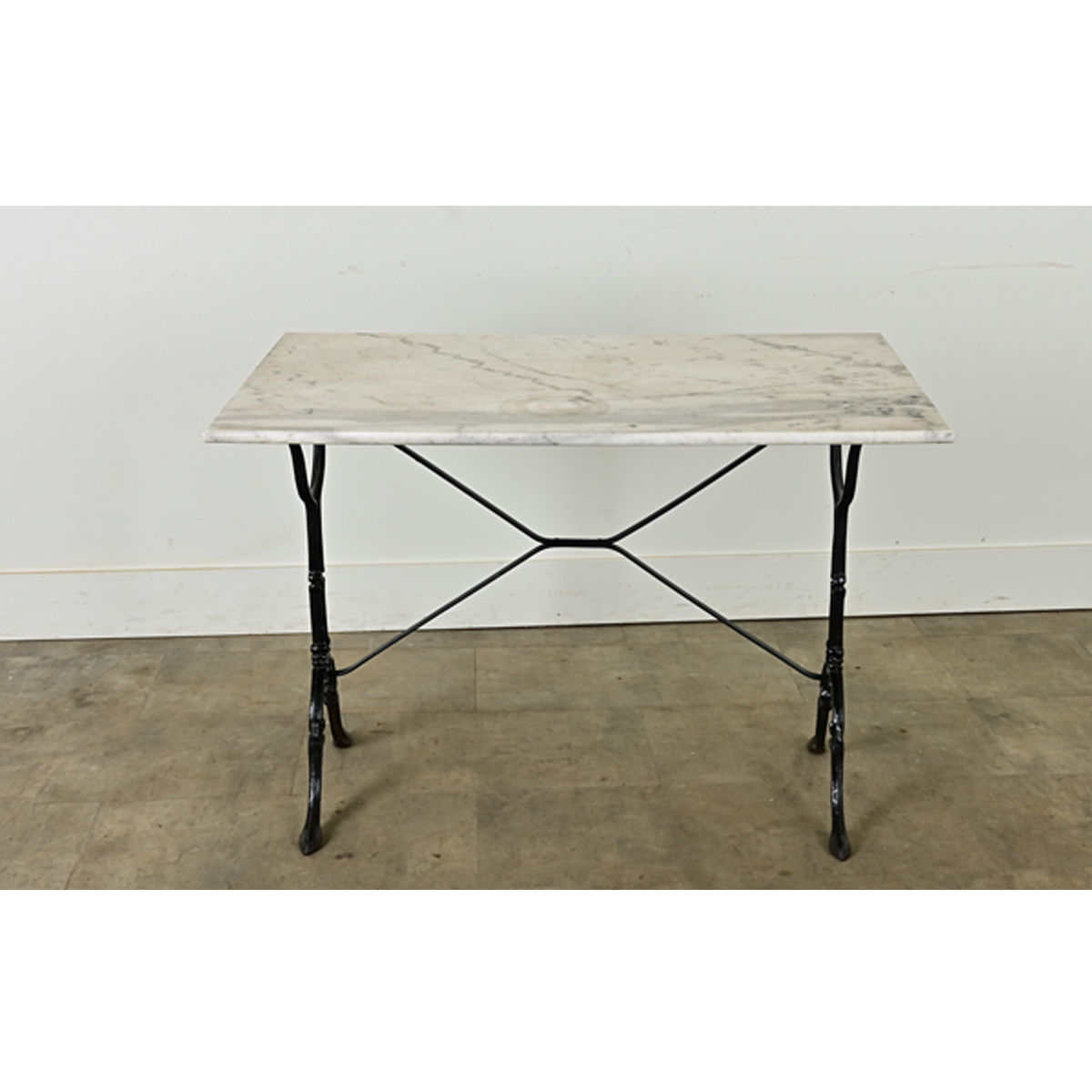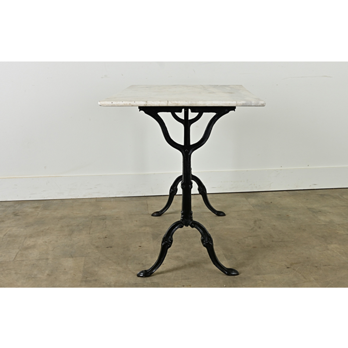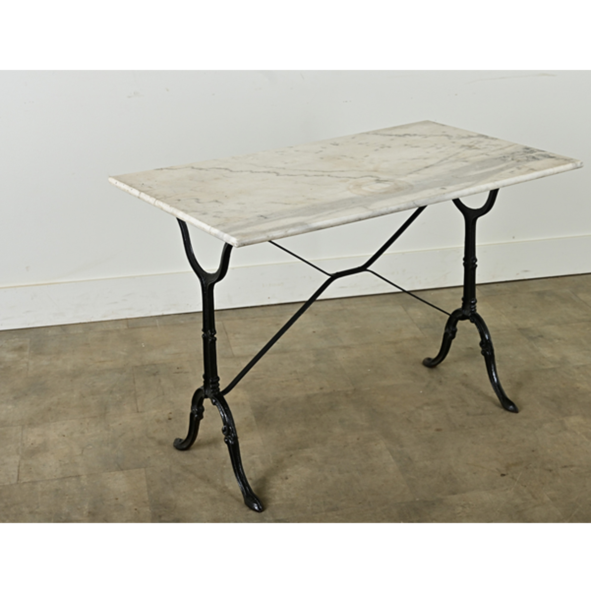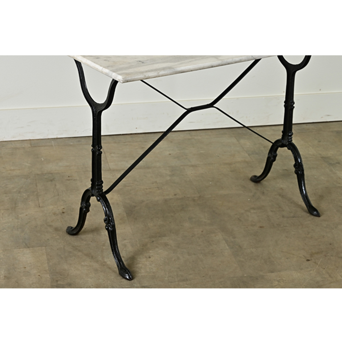 An alluring French brasserie table, from the late 19th century with a removable white marble top on a cast iron frame of exotic ornamentation. This classic French bistro table has the expected rectangular top of fine grey veining in the white stone, resting on a black cast iron base that incorporates decorative elements from the Neoclassical and Persian architectural traditions. A lovely addition to a patio or kitchen, please view the detailed images to see more.