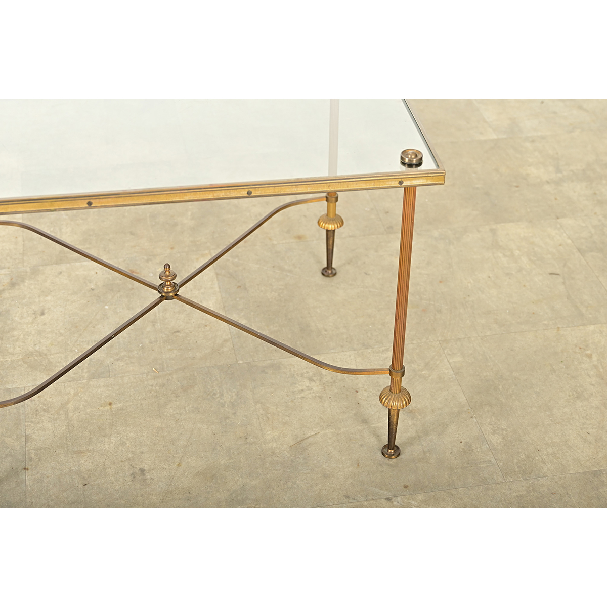 A vintage, midcentury French brass and glass coffee/cocktail table in the style of legendary firm Maison Jansen that will impart cosmopolitan glamor to any interior. Reflecting the typical aesthetic codes of Hollywood Regency taste, the brass frame is given a few original twists to modernize the Neoclassical (Louis XVI) silhouette. The clear glass top is enclosed in a brass frame, marked by a rosette in each corner where the legs intersect with it. A crossed stretcher ornamented with a finial joins the columnar brass legs with reeded texture that flare out over the feet like a umbrella before tapering to the floor. This vintage table will be an excellent decorative choice for any home from modern to a layered traditional look. Please view the detailed images to see the current condition.