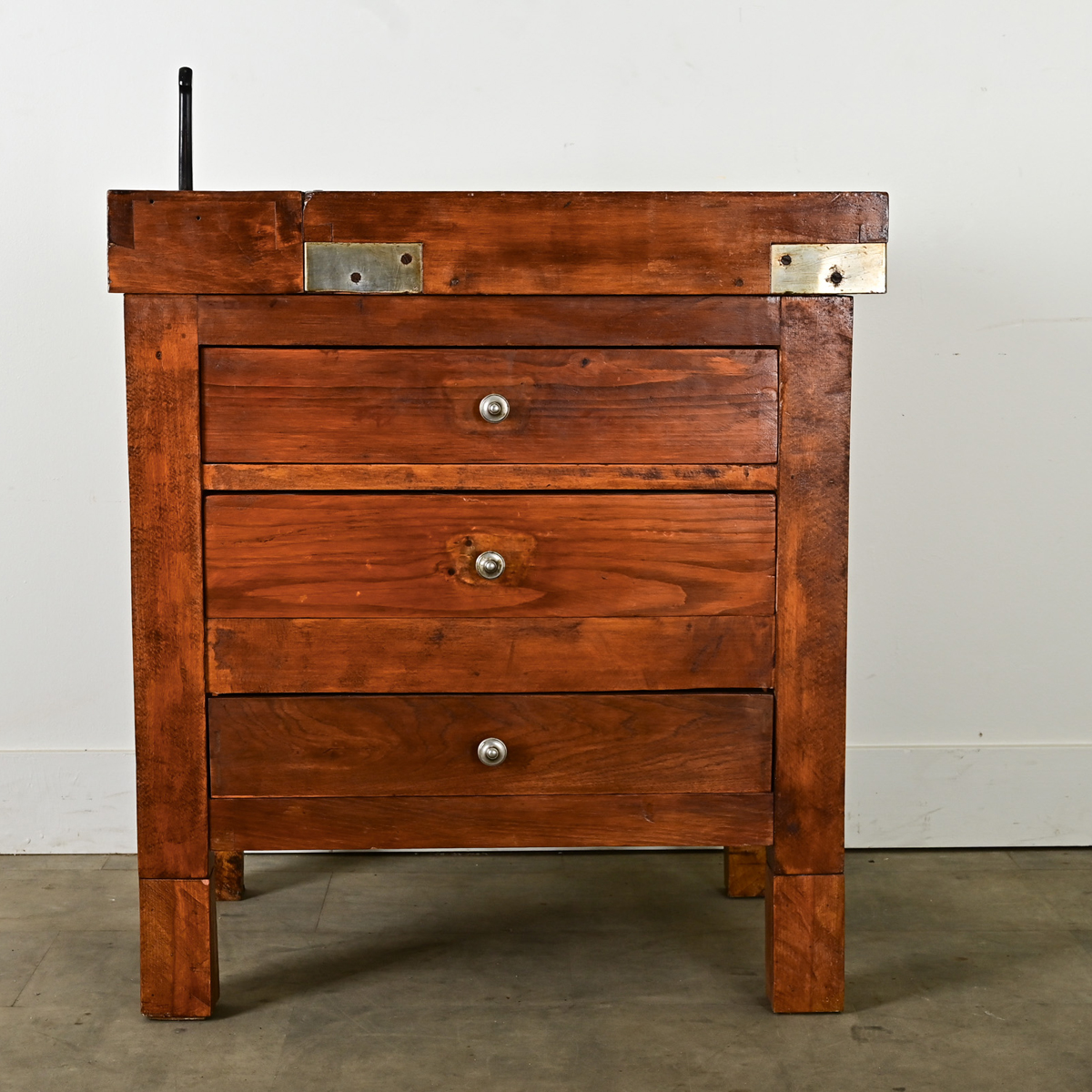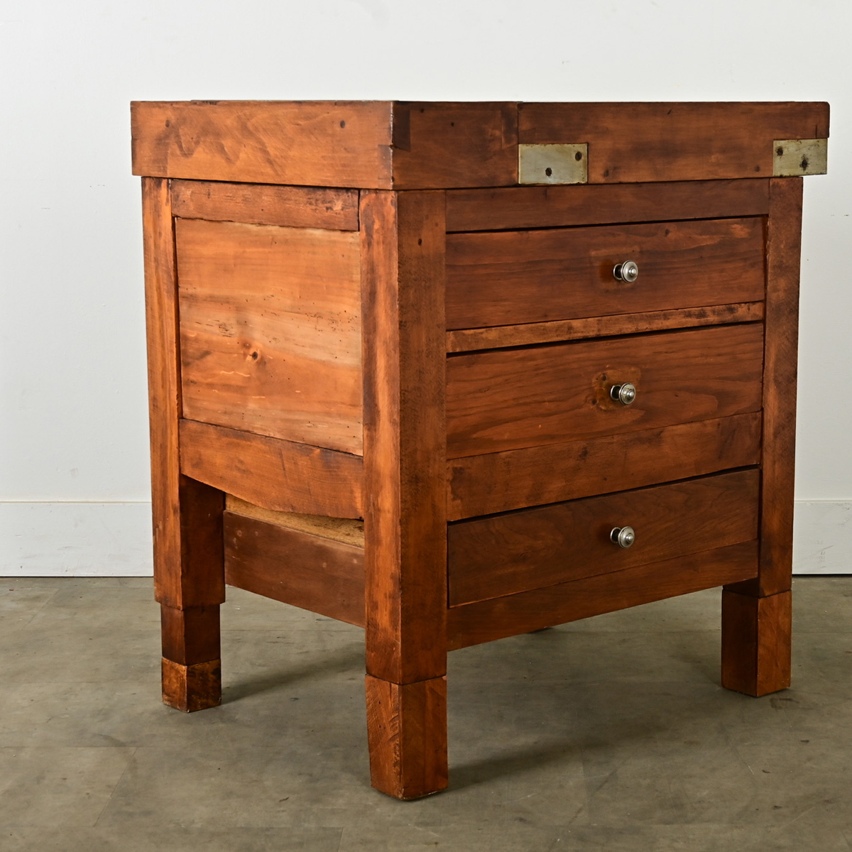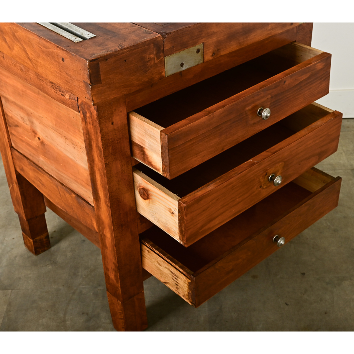 This French butcher block table, constructed of oak and pine, would be a helpful addition to your kitchen or bar. A quite functional antique, it has a thick block for chopping next to a slot for knife storage and a shallow trough to the back. Three drawers offer storage for tools or utensils. The block feet appear to have been added later. Cleaned and polished with wax paste for your immediate use. Knife marks and patina consistent with use and wear, be sure to look at the detailed images to see the current condition.