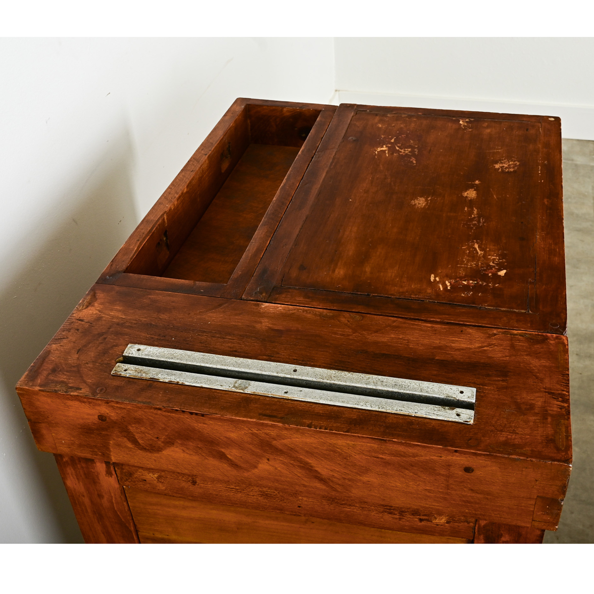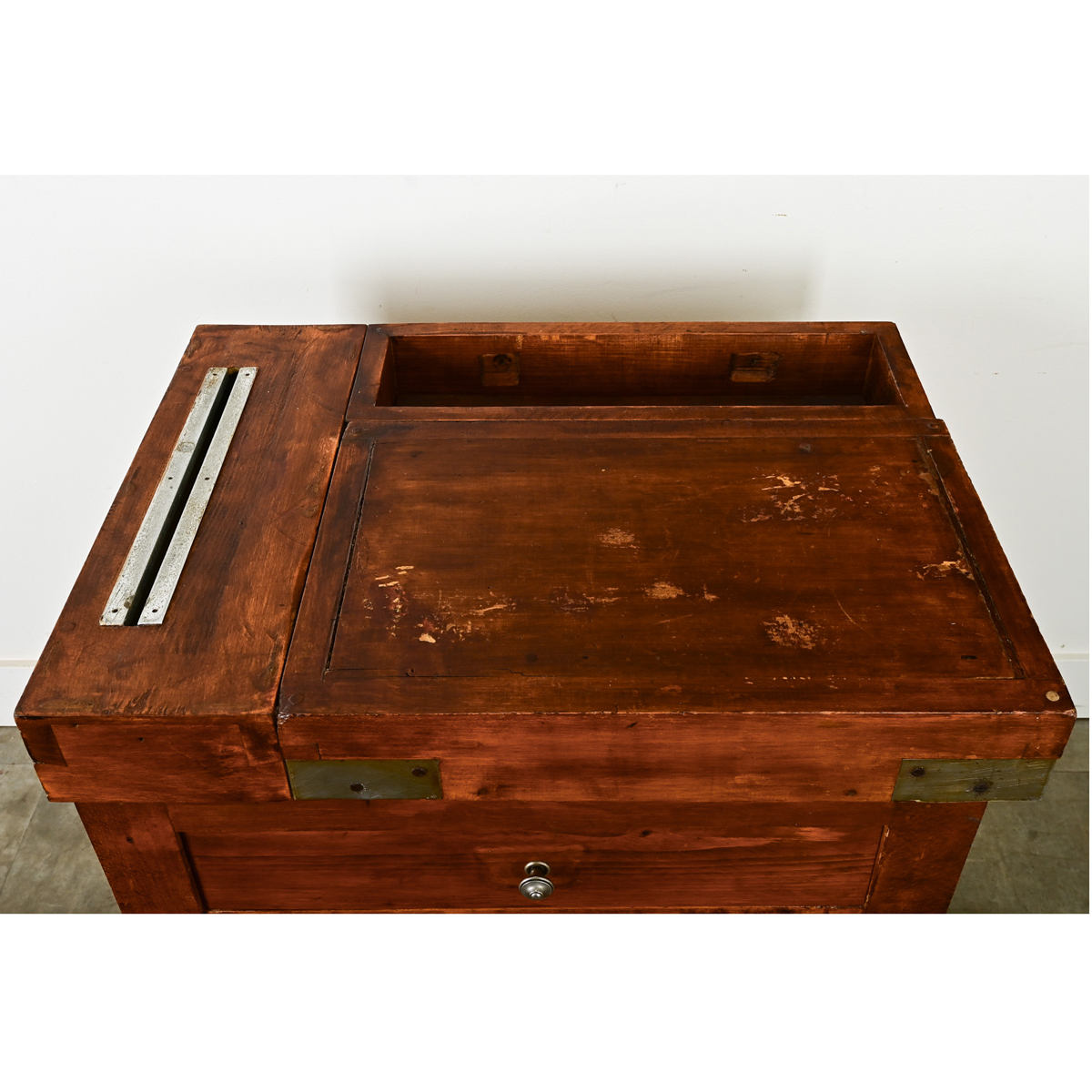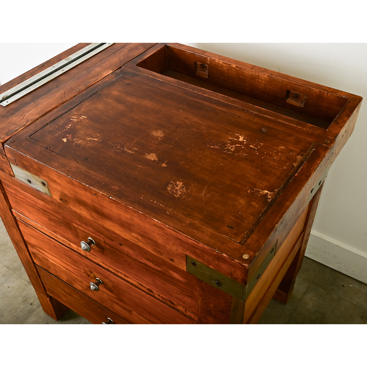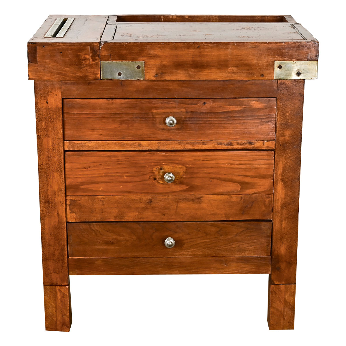 This French butcher block table, constructed of oak and pine, would be a helpful addition to your kitchen or bar. A quite functional antique, it has a thick block for chopping next to a slot for knife storage and a shallow trough to the back. Three drawers offer storage for tools or utensils. The block feet appear to have been added later. Cleaned and polished with wax paste for your immediate use. Knife marks and patina consistent with use and wear, be sure to look at the detailed images to see the current condition.