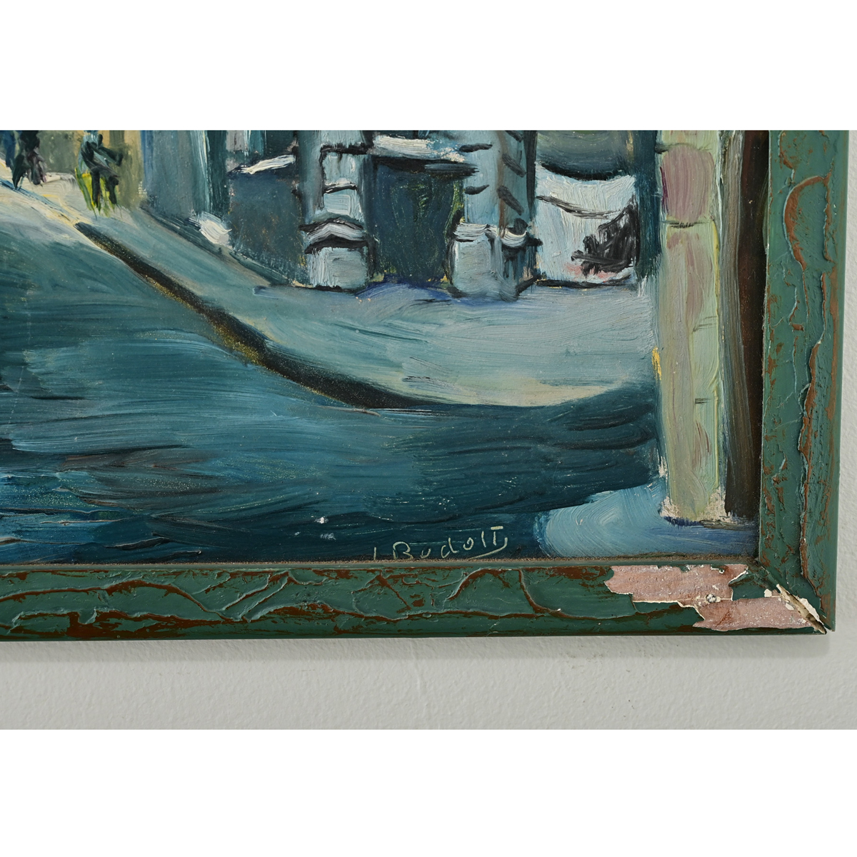 A vibrant vintage French cityscape painting on board, looking down the Rue du Gros Horlogue in Rouen. Of course the enormous clock mounted above the street on a stone arch is quite impressive–with a long history dating back to the 14th century–but the artist has given the surrounding architecture equal attention to highlight their individual styles. Currently the work is enclosed by a teal picture frame sculpted with a rippling texture accented by gold on the crest of the waves. Signed by the artist to the lower right. Please view the detailed images to see more.