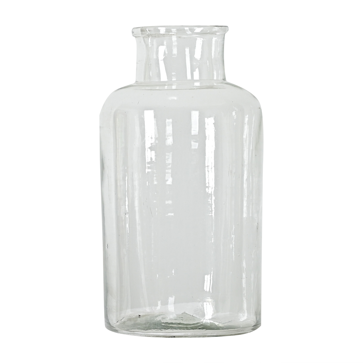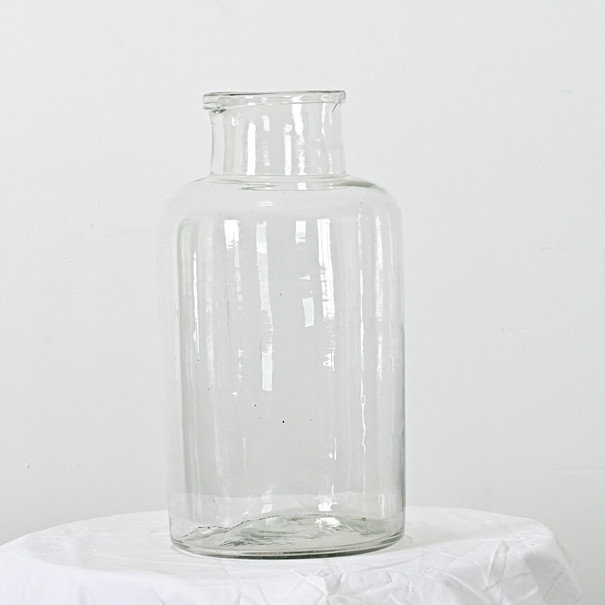 A large clear glass bottle from the early 20th century France. These handmade jars each vary in size and coloration due to their one-of-a-kind nature, making them easy to collect. Rare and highly sought-after, what may be mistaken as imperfections: tilted mouths, bubbles and ripples in the glass, are actually the very attributes that make these such cherished antiques. Originally used to store pickles, vegetables, fruits, truffles and other food sundries, today the transparency makes these wonderful vases and can be placed throughout the home for an added pop of color and texture. Please view the detailed images to see more. Note the base is marked with the number “8” for the capacity in liters.
