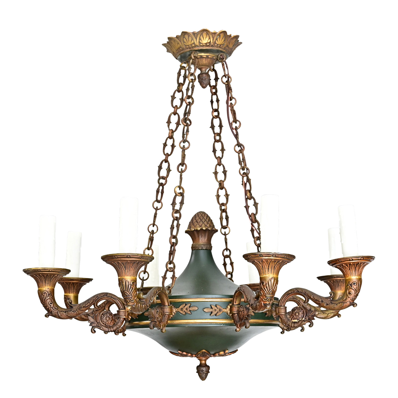 French, 20th century Empire-style ceiling fixture of green tôle using eight candelabra lights to illuminate the stunning gilt bronze accents. The round painted metal bowl reflects a beautiful hunter-green tone; it is suspended from the gilded palmette crown by chains that incorporate subtle acanthus forms in the links around an artichoke finial that rises from the center. A line of eight, scrolling arms reminiscent of cornucopia feature Neoclassical acanthus and vaguely Egyptian motifs typical of the Empire/Napoleonic visual codes. The fixture has been professionally rewired to US electrical standards using UL-listed parts and is ready to delight in your interior. Please view the detailed images as they are an essential part of the product description.