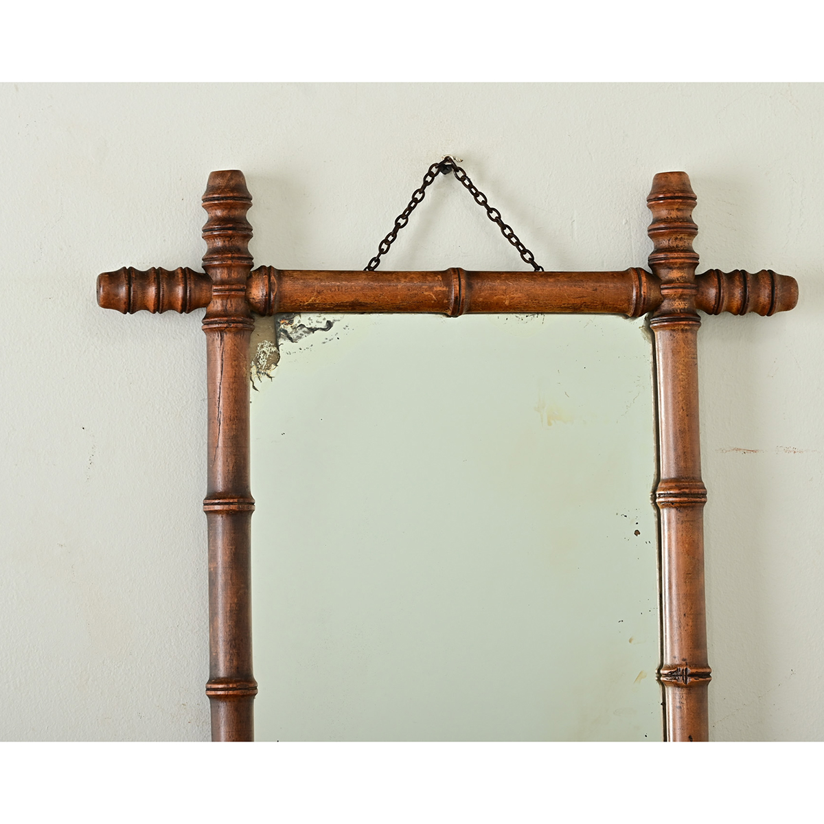 A faux-bamboo mirror from France, turn of the century circa 1890, with a lovely amber-brown patina in the frame. This tall mirror features a rectangular shape that is symmetrical to hang in either direction, made of carved pine to appear as (faux) bamboo down to the intermittent nodes projecting with slanted corners. The mirror draws us with its exotic appearance and lovely color, making it a great choice to decorate any room and across a multitude of interior design tastes. The mirror plate shows a concentration of foxing toward the upper right and lower left as shown, adding to the organic qualities of the piece. Make sure to view the detailed images for a closer look.