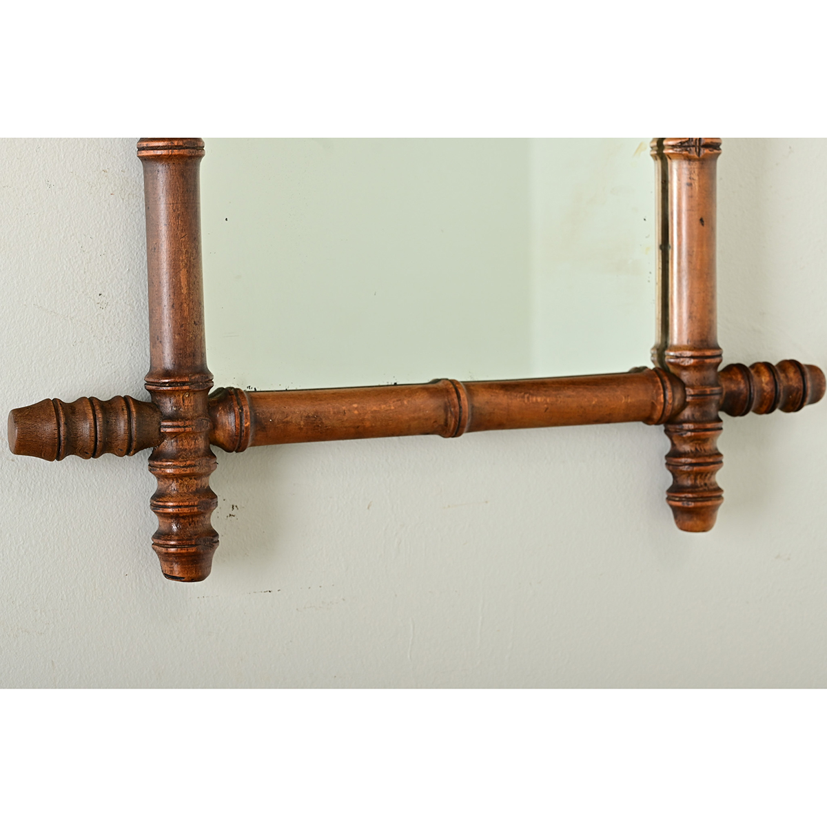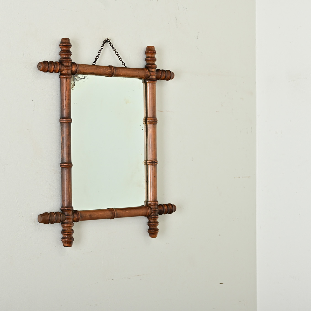 A faux-bamboo mirror from France, turn of the century circa 1890, with a lovely amber-brown patina in the frame. Currently strung to mount in an east-west direction, this mirror features rectangular proportions and symmetry to hang in either direction, made of carved pine to appear as (faux) bamboo down to the intermittent nodes projecting with slanted corners. The mirror draws us with its exotic appearance and lovely color, making it a great choice to decorate any room and across a multitude of interior design tastes. An original mirror plate shows a concentration of foxing along the bottom edge, adding to the organic qualities of the piece. Make sure to view the detailed images for a closer look.