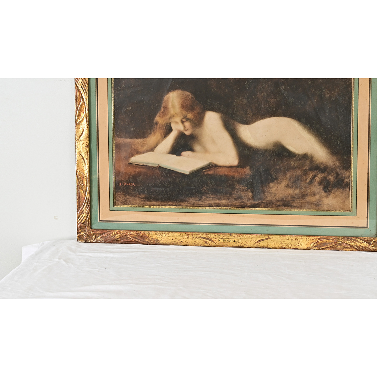 A magical framed reproduction from early 20th century France of Jean-Jacques Henner’s “La Liseuse” (the reader), which the original painting is part of the collection of the Musée D’Orsay in Paris. The 1880s time period is evident in the Pre-Raphaelite style of the work: soft lighting, sensual yet tasteful, and a reference to literature as seen in her leisurely reading from a book. Framed like an archway of gilt molding with low relief carvings and mat board of alternating turquoise and ivory, this unexpected shape complements the art beautifully as repetition of the subject’s curves. Please view the detailed images to see the current condition.