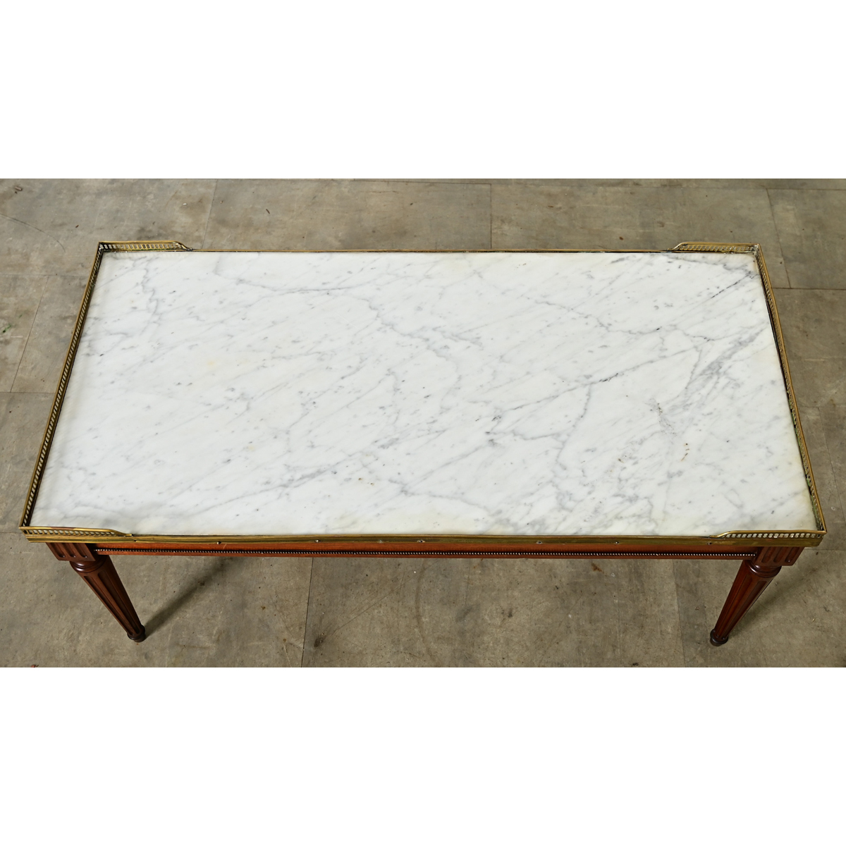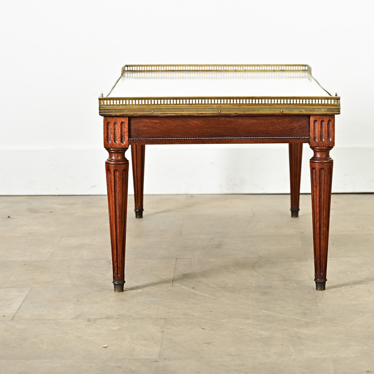 Like an iconic “Bouillotte” type table, this vintage (circa 1930) French Louis XVI inspired rectangular coffee or “low table” has all the signature elements of earlier design periods. The inset white marble top is surrounded by a brass trim and pierced brass gallery, sloping down to be more accessible on the long edges. Fluted details accentuate the corners before transitioning into turned, tapering legs. Cleaned and polished with a French paste wax, ready to be placed in your interior. Please view the detailed images to see more.