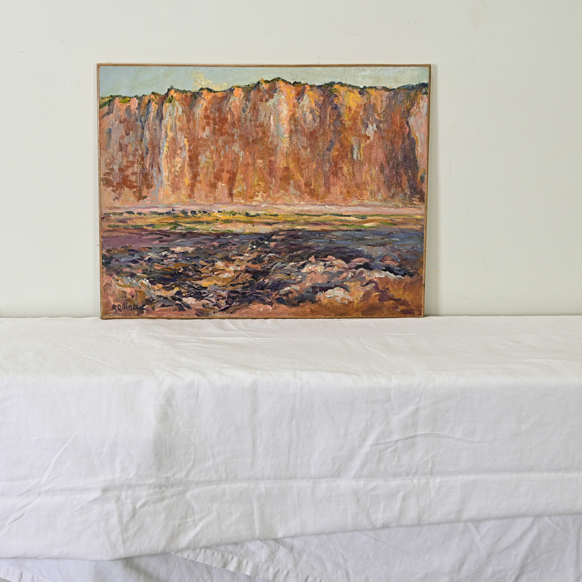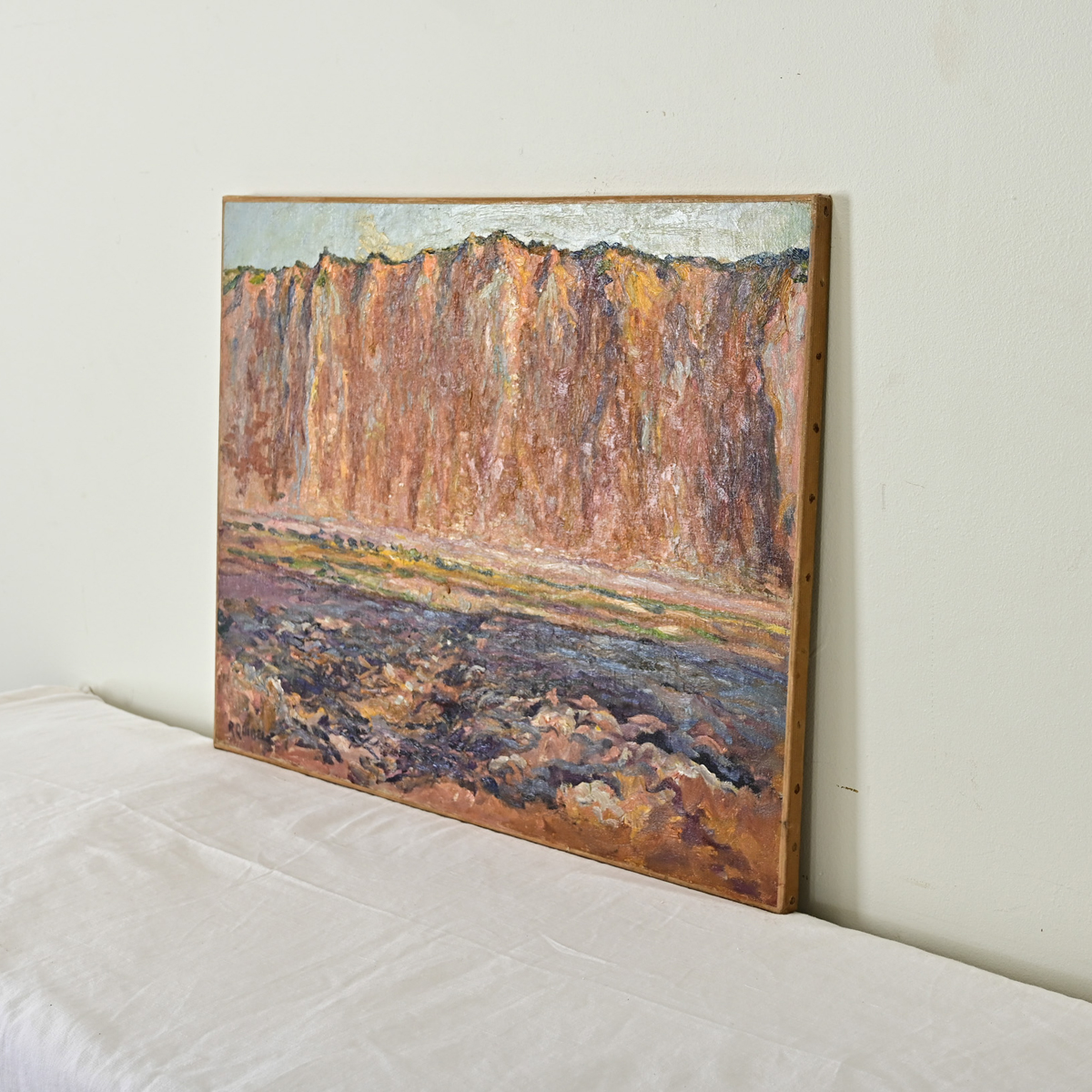 French vintage oil on canvas landscape of high red cliffs towering over the foreground, painted in an abstracted technique that allows the drama of the bold color palette to give emotion to the field of vision. Signed by the artist in the lower left corner. Please view the detailed images.