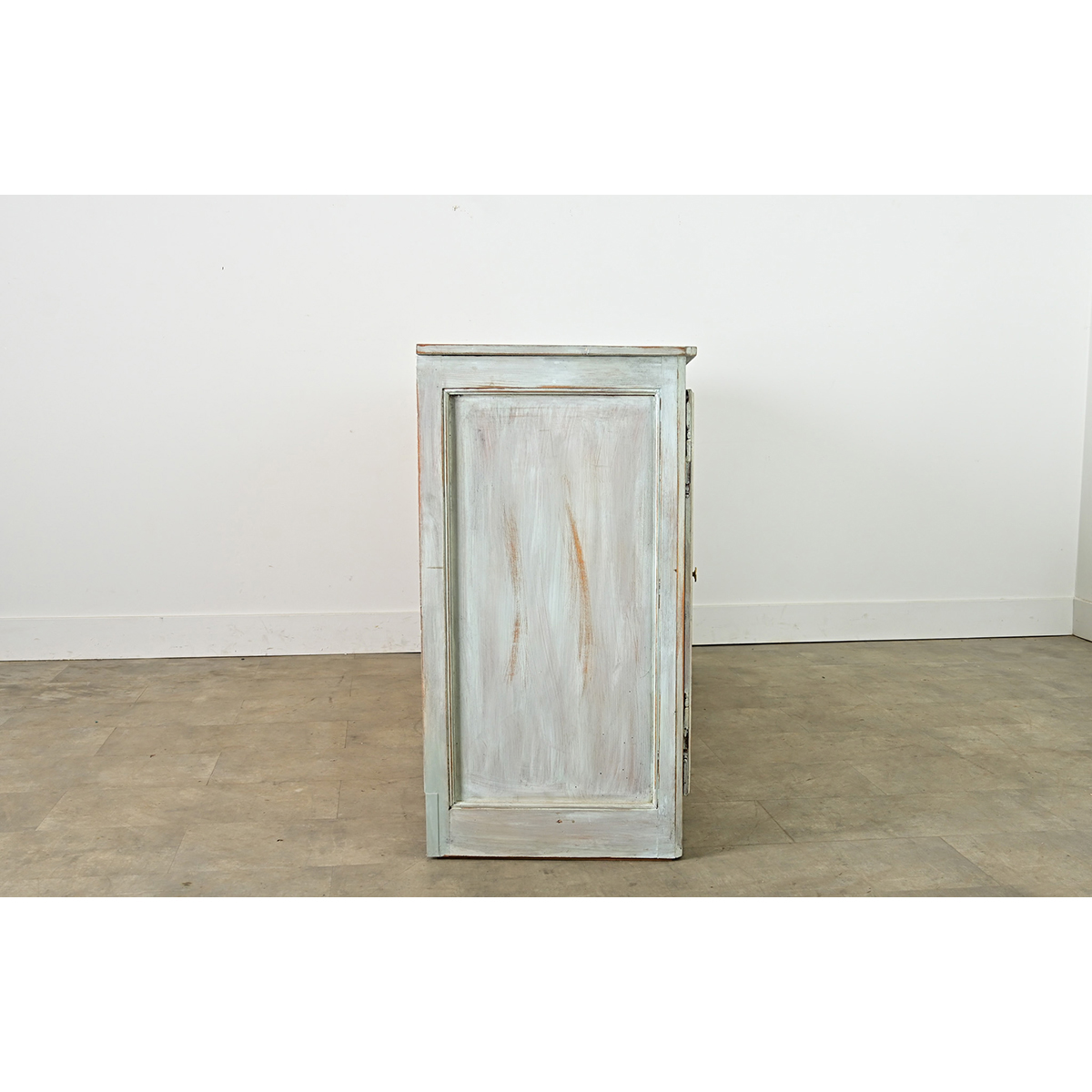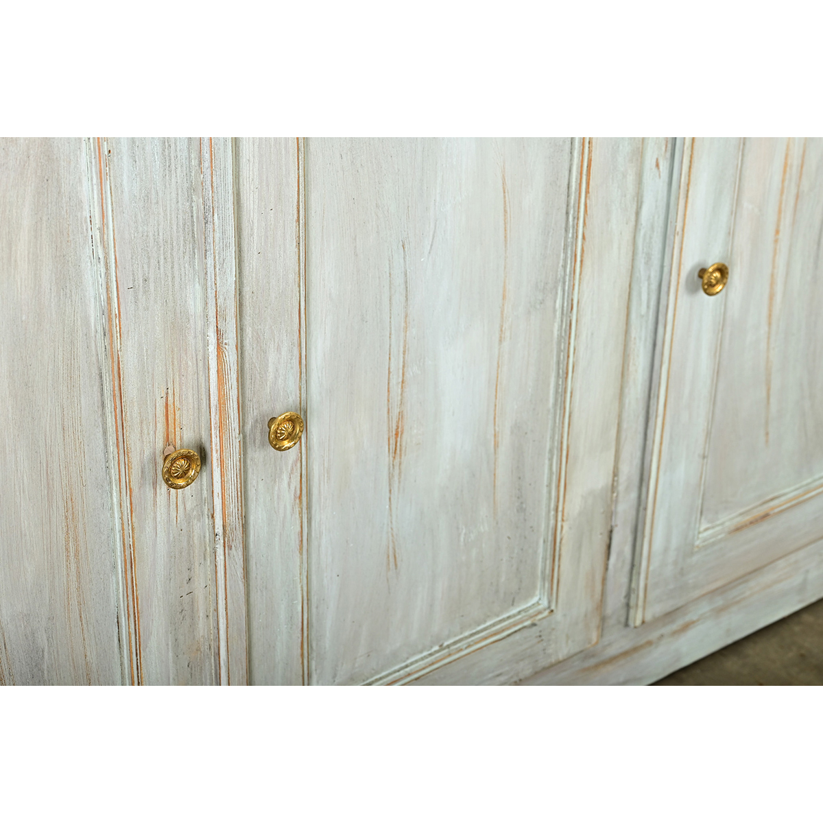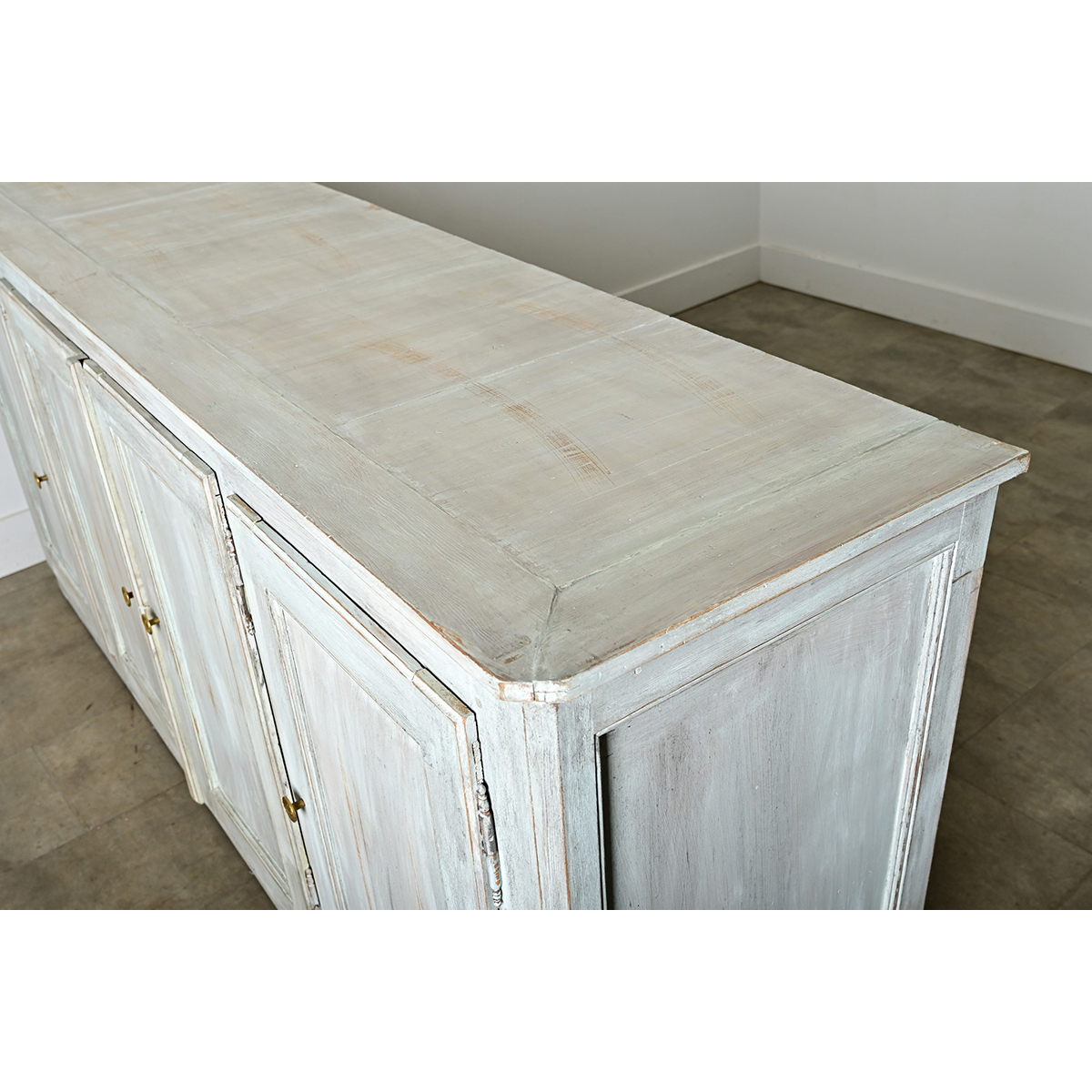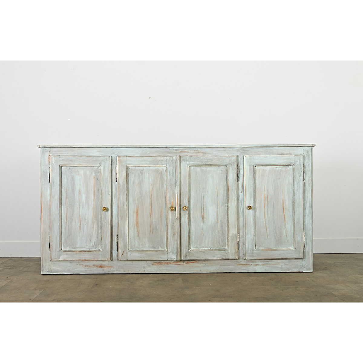 A French, early to mid-20th century four door enfilade transformed more recently with a painted, scraped blue finish applied by hand that beautifully contrasts the linear formality of the wide case. Ethereal layers of pigment suggest Gustavian and Provincial inspiration using a lightly patinated faux finishing effect to wash the wood in a dusty shade of blue. Four paneled doors enclose the unpainted interior, secured by magnetic catches and released by a gentle pull on the understated brass knobs. Note that the center doors open in tandem for easy access to the undivided cabinet with a single shelf (17 ½” D) spanning the width for abundant storage capacity to keep a living room or dining room organized. Cleaned and tightened, this buffet is ready for your interior. Please view the detailed images.