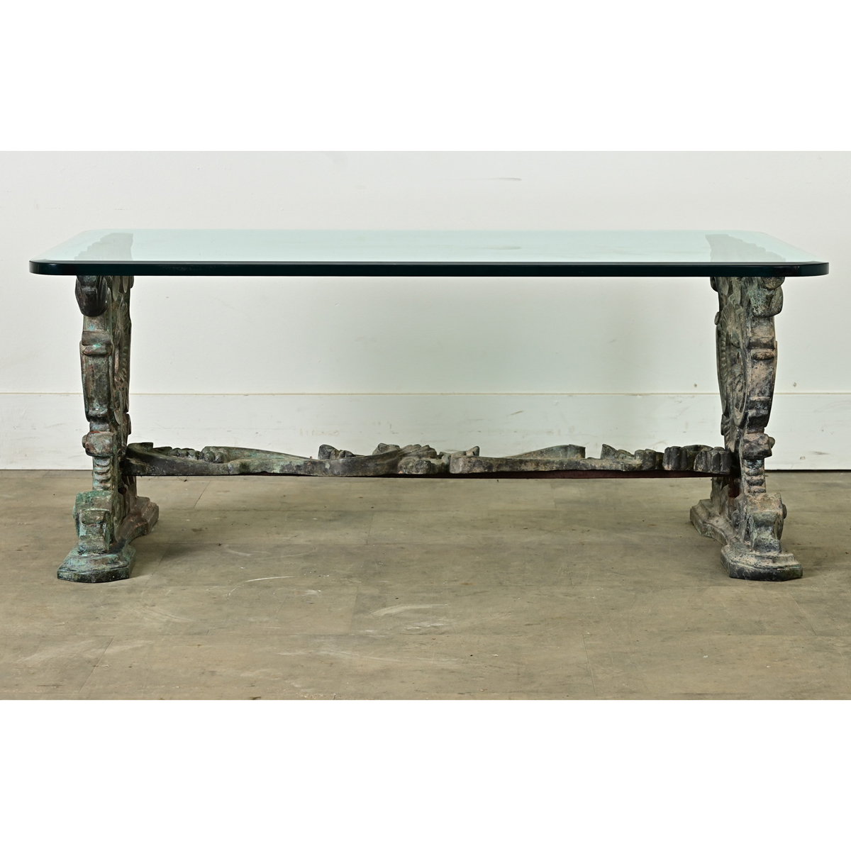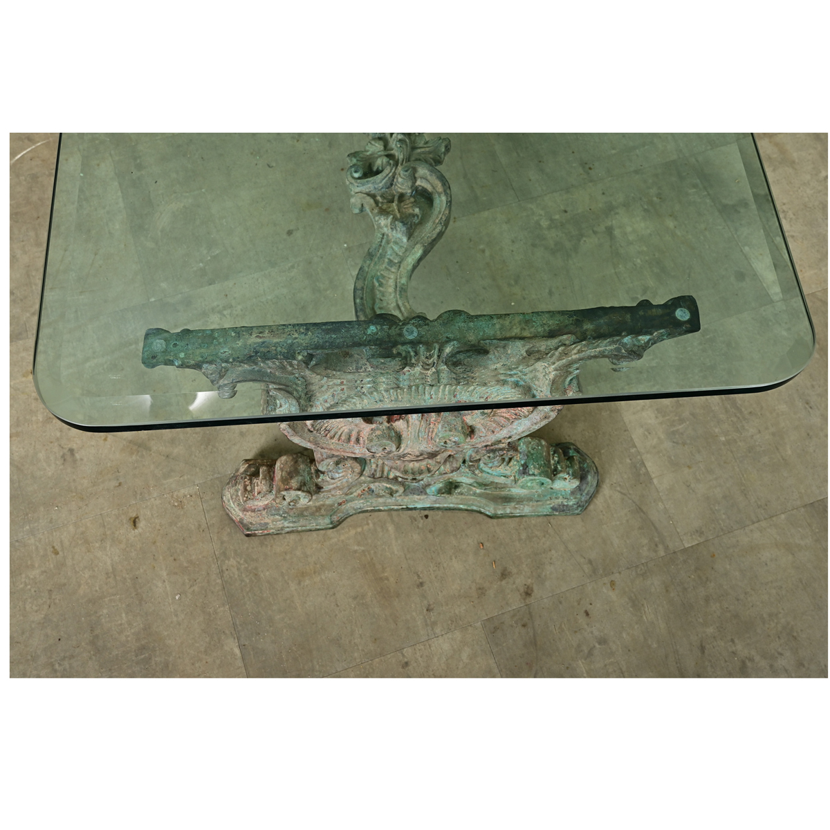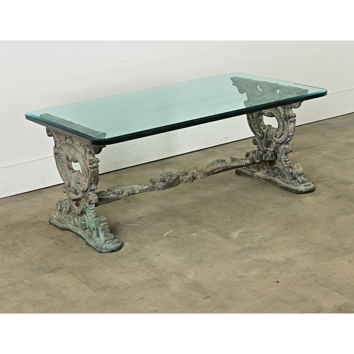 A vintage, upcycled French cast iron bench from the late 1800s modernized by a glass surface to use as a cocktail table! The glass top shows an elegant, beveled edge which catches the light, and softly rounded corners where originally there would have been a wood or stone surface. Two massive support legs and a stretcher in cast iron shows ornate Rococo motifs, patinated to gray and turquoise verdigris. This table would be an attractive addition to an indoor or outdoor space. Please view the detailed images.