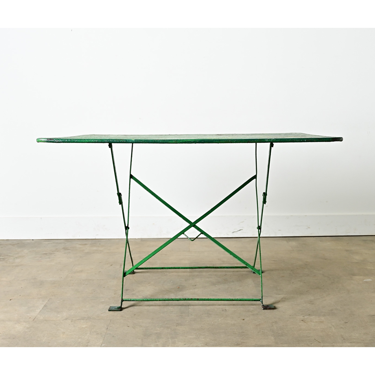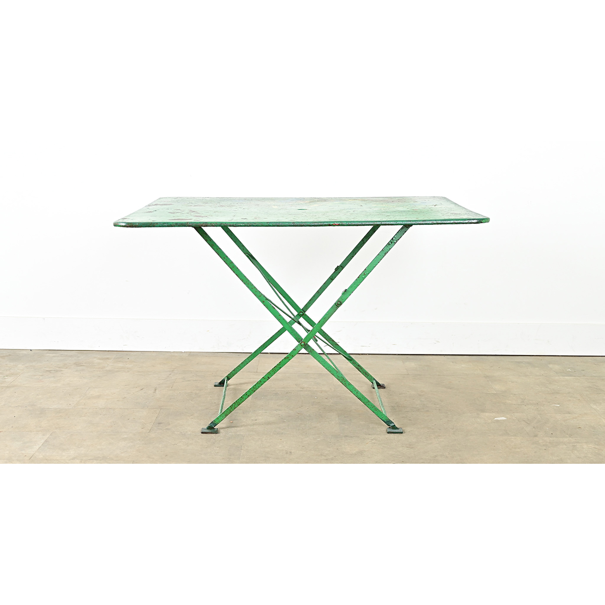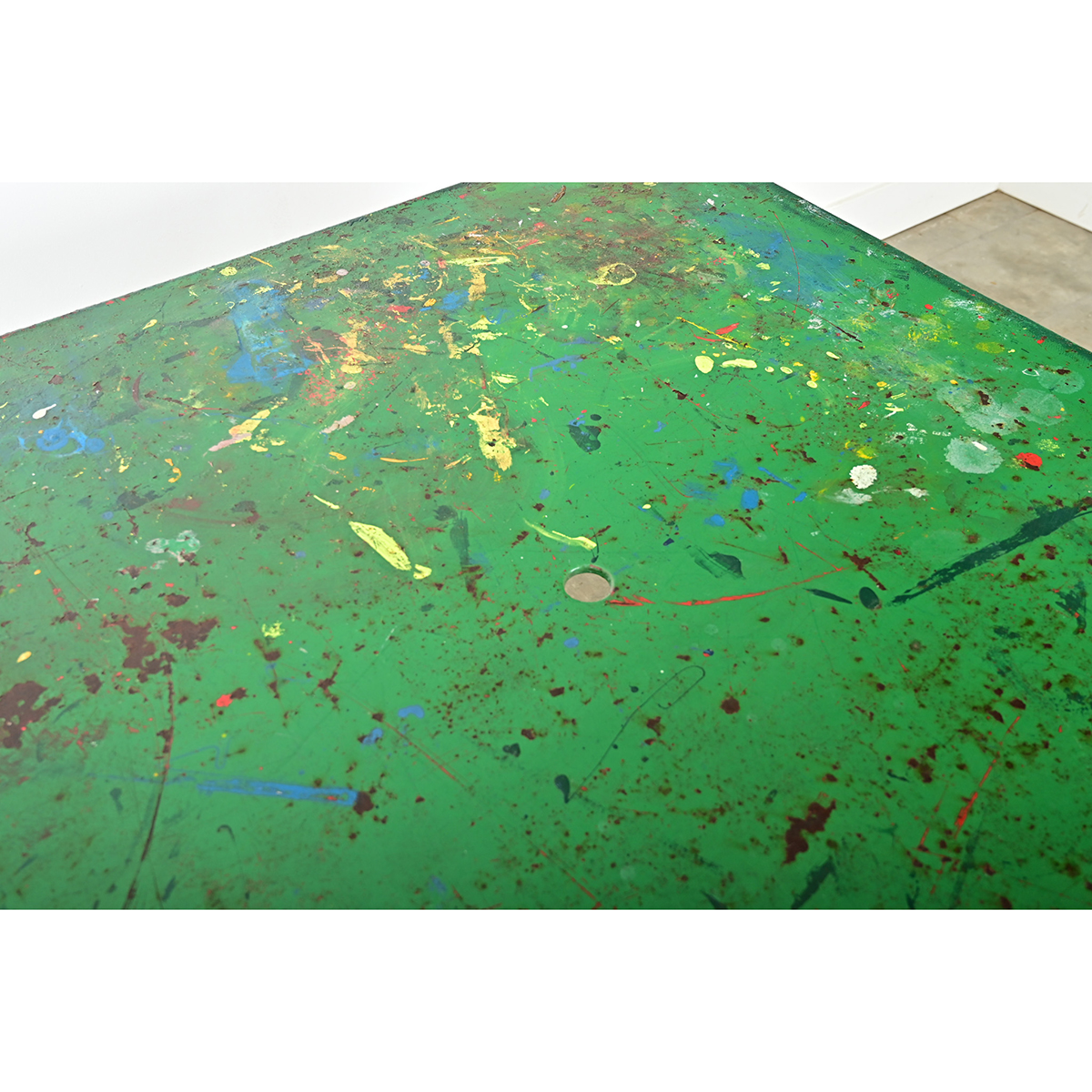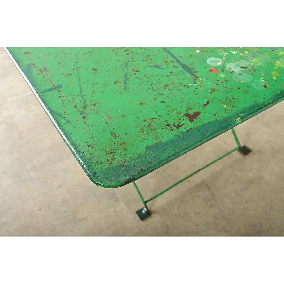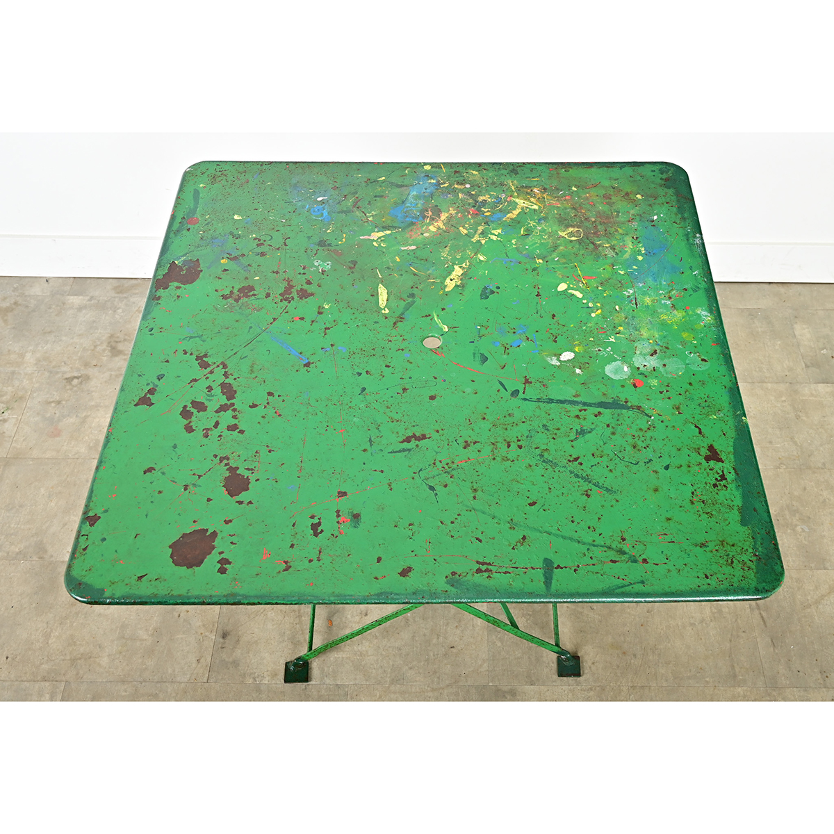 French vintage square metal folding table from a bistro, more recently used in an artist’s studio becoming a unique work of its own to entertain you and your guests while dining. The original Kelly green enamel is wonderfully patinated, now layered with abstract splashes of red, blue, and yellow paints. Note that the top features an umbrella hole to use this table outside for a patio or garden and the folding mechanism still works to store in the off-season. Please view the detailed images to see the current condition.
