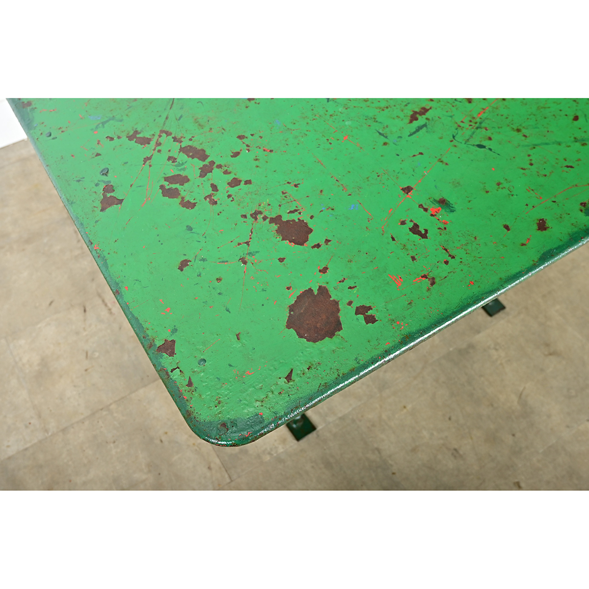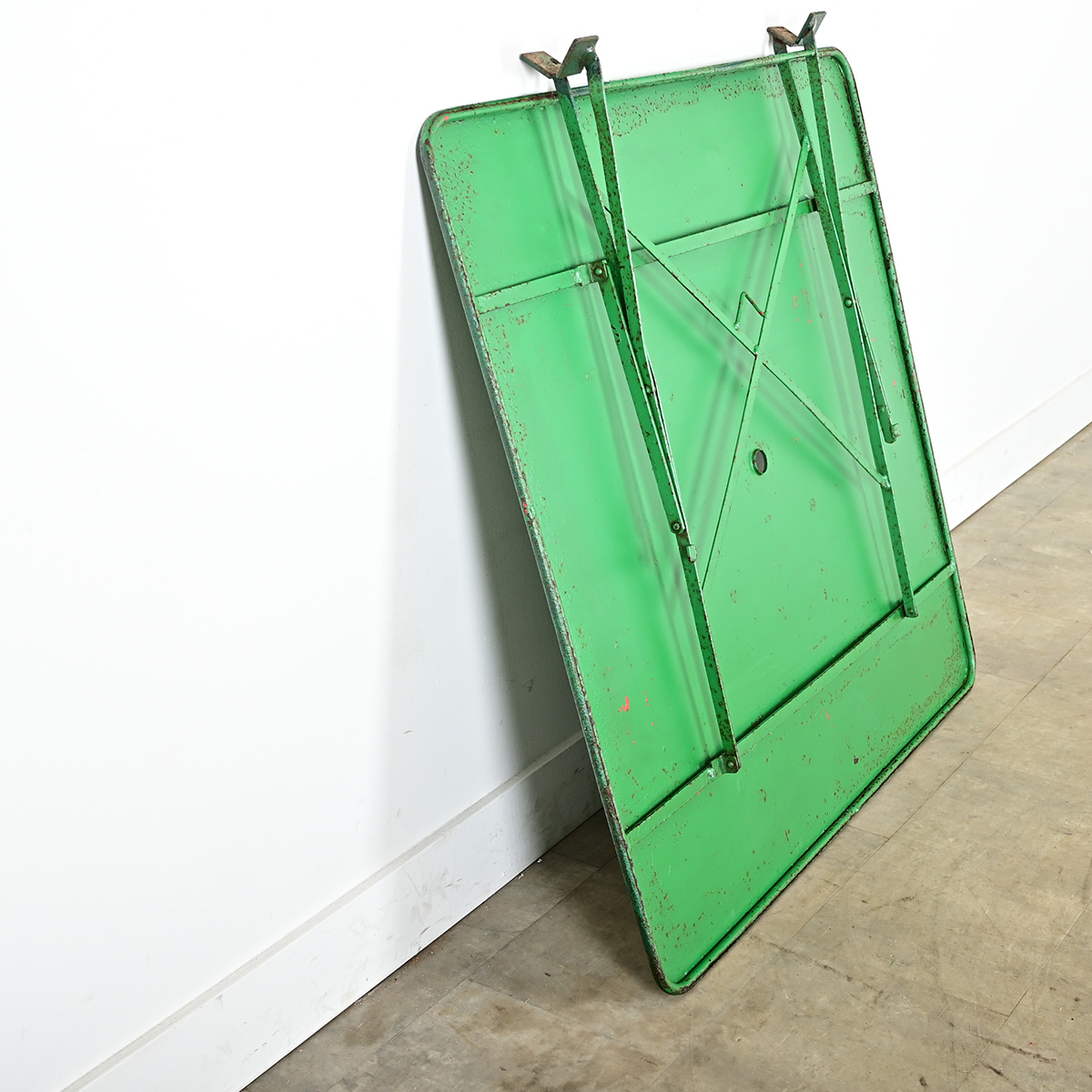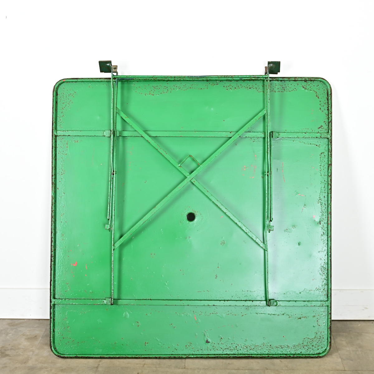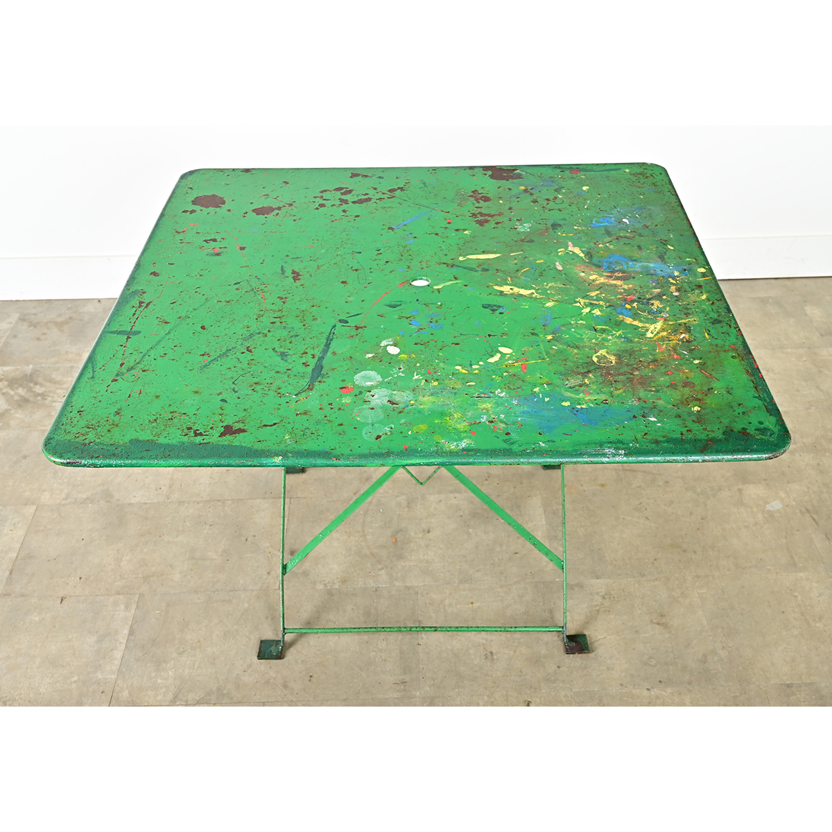 French vintage square metal folding table from a bistro, more recently used in an artist’s studio becoming a unique work of its own to entertain you and your guests while dining. The original Kelly green enamel is wonderfully patinated, now layered with abstract splashes of red, blue, and yellow paints. Note that the top features an umbrella hole to use this table outside for a patio or garden and the folding mechanism still works to store in the off-season. Please view the detailed images to see the current condition.