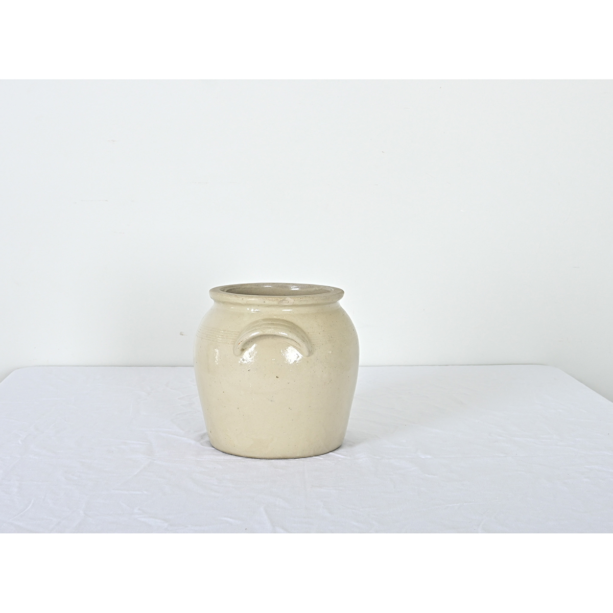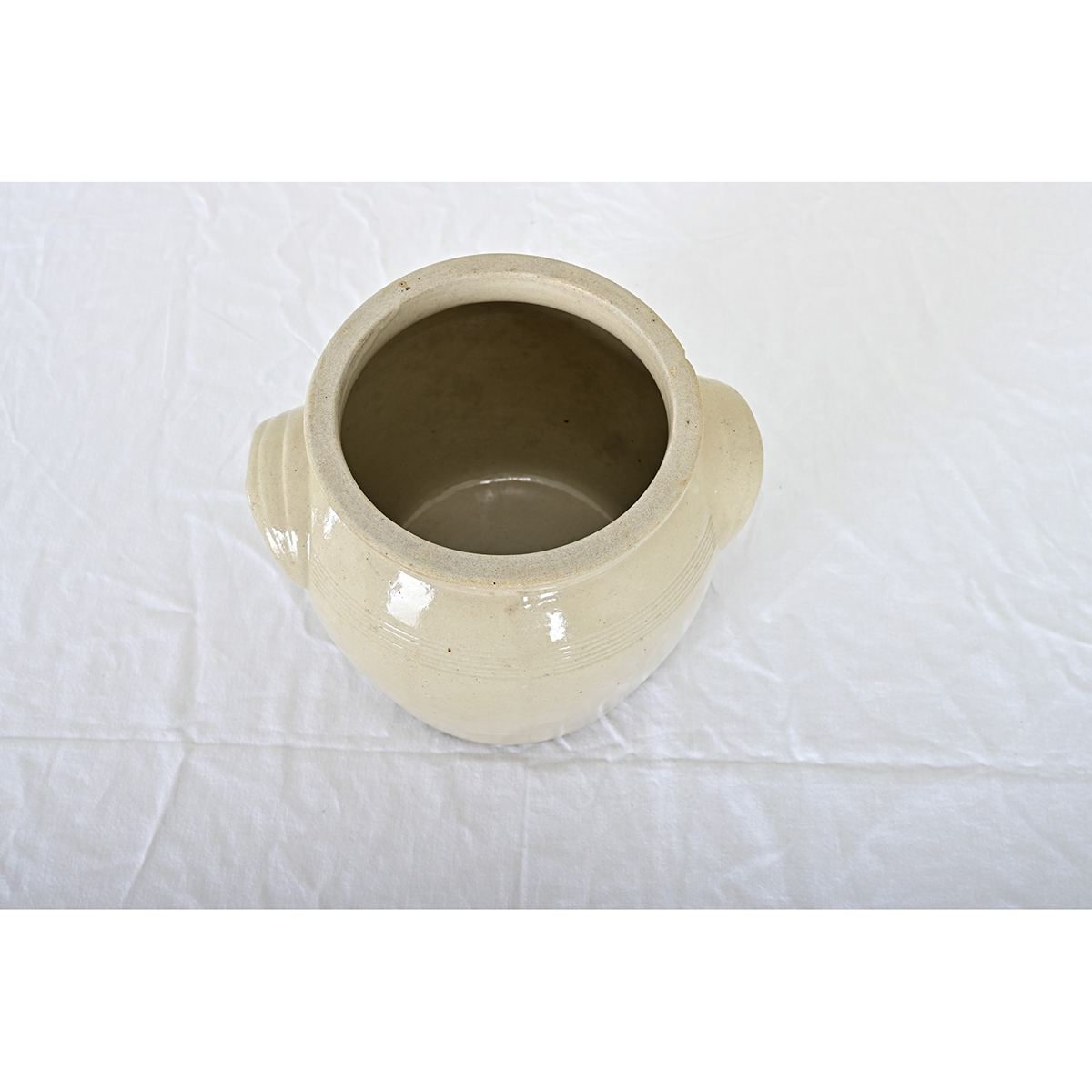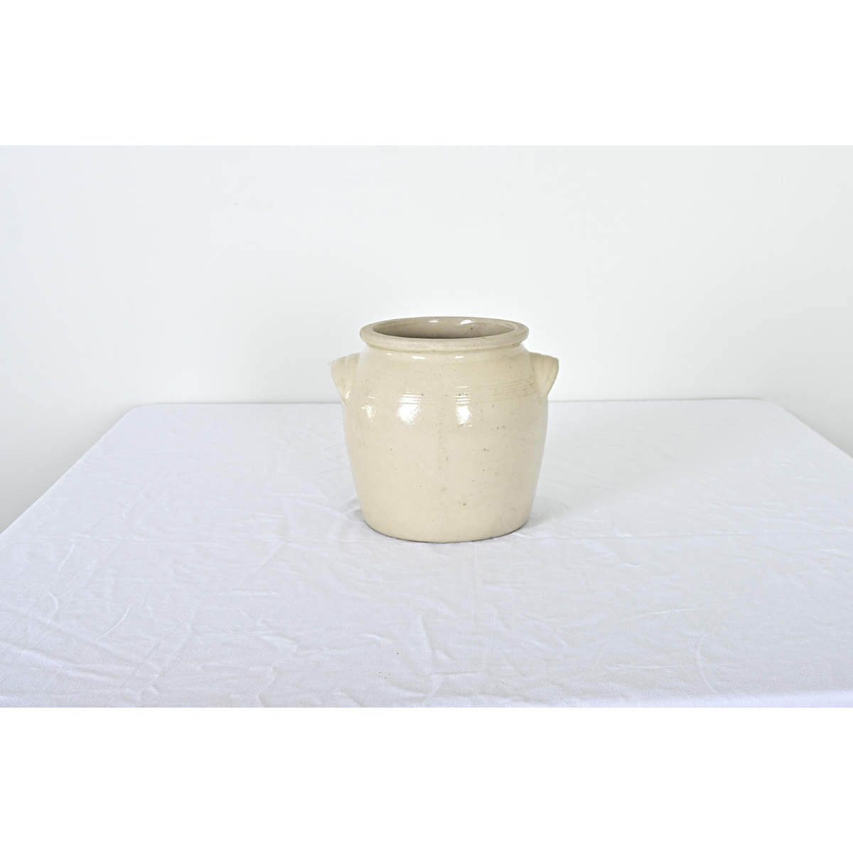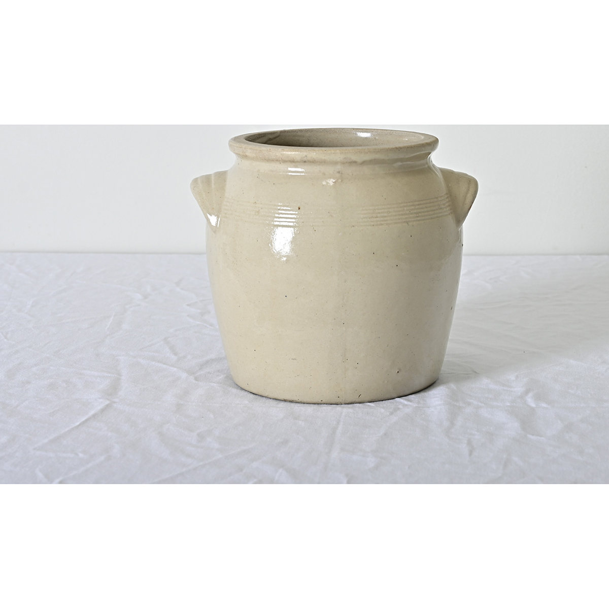 A vintage French (circa 1920) salt-glazed stoneware confit pot with expressive loop handles resembling ears. This style of crock is an indispensable icon of French cuisine, the squat vessel has a luminous glaze finish of beige-gray, a little mottled to reveal the clay underneath. Curvaceous handles on each side give personality to the design making it easier to lift the pot when full of delicious confit. For the modern interior these antique cooking pots deliver French sophistication as unexpected vases for flower bouquets and greenery or displayed on a counter for kitchen utensils. Small “3” imprinted on the shoulder, just below the rim. Please view the detailed images to see the current condition.